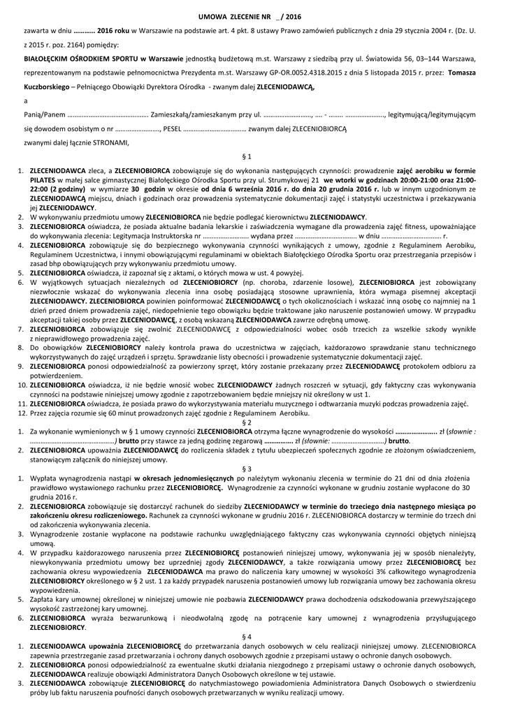 UMOWA ZLECENIE NR …/ 2016 zawarta w dniu ………… 2016 roku w Warszawie na podstawie art. 4 pkt. 8 ustawy Prawo zamówień publicznych z dnia 29 stycznia 2004 r. (Dz. U. z 2015 r. poz. 2164) pomiędzy: BIAŁOŁĘCKIM OŚRODKIEM SPORTU w Warszawie jednostką budżetową m.st. Warszawy z siedzibą przy ul. Światowida 56, 03–144 Warszawa, reprezentowanym na podstawie pełnomocnictwa Prezydenta m.st. Warszawy GP-OR.0052.4318.2015 z dnia 5 listopada 2015 r. przez: Tomasza Kuczborskiego – Pełniącego Obowiązki Dyrektora Ośrodka - zwanym dalej ZLECENIODAWCĄ, a Panią/Panem ………………………………………. Zamieszkałą/zamieszkanym przy ul. ………………………, …. - …….. …………………., legitymującą/legitymującym się dowodem osobistym o nr ……………………., PESEL ……………………………… zwanym dalej ZLECENIOBIORCĄ zwanymi dalej łącznie STRONAMI, §1 1. ZLECENIODAWCA zleca, a ZLECENIOBIORCA zobowiązuje się do wykonania następujących czynności: prowadzenie zajęć aerobiku w formie PILATES w małej salce gimnastycznej Białołęckiego Ośrodka Sportu przy ul. Strumykowej 21 we wtorki w godzinach 20:00-21:00 oraz 21:0022:00 (2 godziny) w wymiarze 30 godzin w okresie od dnia 6 września 2016 r. do dnia 20 grudnia 2016 r. lub w innym uzgodnionym ze ZLECENIODAWCĄ miejscu, dniach i godzinach oraz prowadzenia systematycznie dokumentacji zajęć i statystyki uczestnictwa i przekazywania jej ZLECENIODAWCY. 2. W wykonywaniu przedmiotu umowy ZLECENIOBIORCA nie będzie podlegać kierownictwu ZLECENIODAWCY. 3. ZLECENIOBIORCA oświadcza, że posiada aktualne badania lekarskie i zaświadczenia wymagane dla prowadzenia zajęć fitness, upoważniające do wykonywania zlecenia: Legitymacja Instruktorska nr …………………….. wydana przez …………………………….. w dniu ……………………………. r. 4. ZLECENIOBIORCA zobowiązuje się do bezpiecznego wykonywania czynności wynikających z umowy, zgodnie z Regulaminem Aerobiku, Regulaminem Uczestnictwa, i innymi obowiązującymi regulaminami w obiektach Białołęckiego Ośrodka Sportu oraz przestrzegania przepisów i zasad bhp obowiązujących przy wykonywaniu przedmiotu umowy. 5. ZLECENIOBIORCA oświadcza, iż zapoznał się z aktami, o których mowa w ust. 4 powyżej. 6. W wyjątkowych sytuacjach niezależnych od ZLECENIOBIORCY (np. choroba, zdarzenie losowe), ZLECENIOBIORCA jest zobowiązany niezwłocznie wskazać do wykonywania zlecenia inna osobę posiadającą stosowne uprawnienia, która wymaga pisemnej akceptacji ZLECENIODAWCY. ZLECENIOBIORCA powinien poinformować ZLECENIODAWCĘ o tych okolicznościach i wskazać inną osobę co najmniej na 1 dzień przed dniem prowadzenia zajęć, niedopełnienie tego obowiązku będzie traktowane jako naruszenie postanowień umowy. W przypadku akceptacji takiej osoby przez ZLECENIODAWCĘ, z osobą wskazaną ZLECENIODAWCA zawrze odrębną umowę. 7. ZLECENIOBIORCA zobowiązuje się zwolnić ZLECENIODAWCĘ z odpowiedzialności wobec osób trzecich za wszelkie szkody wynikłe z nieprawidłowego prowadzenia zajęć. 8. Do obowiązków ZLECENIOBIORCY należy kontrola prawa do uczestnictwa w zajęciach, każdorazowo sprawdzanie stanu technicznego wykorzystywanych do zajęć urządzeń i sprzętu. Sprawdzanie listy obecności i prowadzenie systematycznie dokumentacji zajęć. 9. ZLECENIOBIORCA ponosi odpowiedzialność za powierzony sprzęt, który zostanie przekazany przez ZLECENIODAWCĘ protokołem odbioru za potwierdzeniem. 10. ZLECENIOBIORCA oświadcza, iż nie będzie wnosić wobec ZLECENIODAWCY żadnych roszczeń w sytuacji, gdy faktyczny czas wykonywania czynności na podstawie niniejszej umowy zgodnie z zapotrzebowaniem będzie mniejszy niż określony w ust 1. 11. ZLECENIOBIORCA oświadcza, że posiada prawo do wykorzystywania materiału muzycznego i odtwarzania muzyki podczas prowadzenia zajęć. 12. Przez zajęcia rozumie się 60 minut prowadzonych zajęć zgodnie z Regulaminem Aerobiku. §2 1. Za wykonanie wymienionych w § 1 umowy czynności ZLECENIOBIORCA otrzyma łączne wynagrodzenie do wysokości ………………….. zł (słownie : …………………………………………) brutto przy stawce za jedną godzinę zegarową ……………. zł (słownie: …………………………) brutto. 2. ZLECENIOBIORCA upoważnia ZLECENIODAWCĘ do rozliczenia składek z tytułu ubezpieczeń społecznych zgodnie ze złożonym oświadczeniem, stanowiącym załącznik do niniejszej umowy. §3 1. Wypłata wynagrodzenia nastąpi w okresach jednomiesięcznych po należytym wykonaniu zlecenia w terminie do 21 dni od dnia złożenia prawidłowo wystawionego rachunku przez ZLECENIOBIORCĘ. Wynagrodzenie za czynności wykonane w grudniu zostanie wypłacone do 30 grudnia 2016 r. 2. ZLECENIOBIORCA zobowiązuje się dostarczyć rachunek do siedziby ZLECENIODAWCY w terminie do trzeciego dnia następnego miesiąca po zakończeniu okresu rozliczeniowego. Rachunek za czynności wykonane w grudniu 2016 r. ZLECENIOBIORCA dostarczy w terminie do trzech dni od zakończenia wykonywania zlecenia. 3. Wynagrodzenie zostanie wypłacone na podstawie rachunku uwzględniającego faktyczny czas wykonywania czynności objętych niniejszą umową. 4. W przypadku każdorazowego naruszenia przez ZLECENIOBIORCĘ postanowień niniejszej umowy, wykonywania jej w sposób nienależyty, niewykonywania przedmiotu umowy bez uprzedniej zgody ZLECENIODAWCY, a także rozwiązania umowy przez ZLECENIOBIORCĘ bez zachowania okresu wypowiedzenia ZLECENIODAWCA ma prawo do naliczenia kary umownej w wysokości 3% całkowitego wynagrodzenia ZLECENIOBIORCY określonego w § 2 ust. 1 za każdy przypadek naruszenia postanowień umowy lub rozwiązania umowy bez zachowania okresu wypowiedzenia. 5. Zapłata kary umownej określonej w niniejszej umowie nie pozbawia ZLECENIODAWCY prawa dochodzenia odszkodowania przewyższającego wysokość zastrzeżonej ka