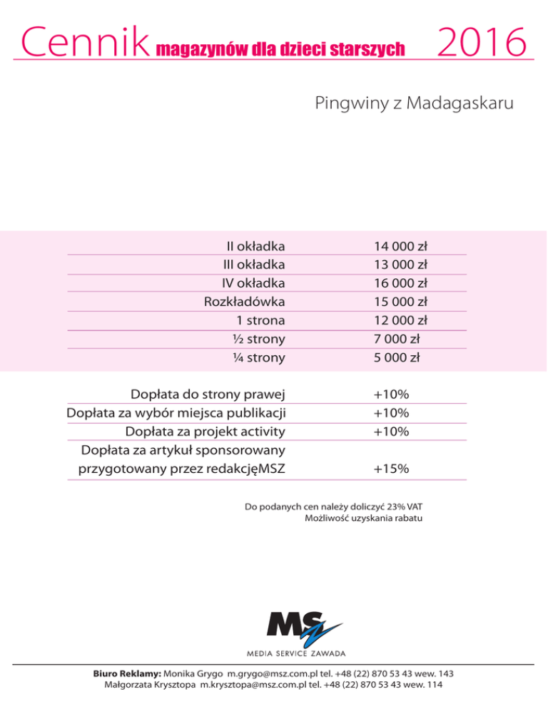 Cennik magazynów dla dzieci starszych 2016 Pingwiny z Madagaskaru II okładka III okładka IV okładka Rozkładówka 1 strona ½ strony ¼ strony Dopłata do strony prawej Dopłata za wybór miejsca publikacji Dopłata za projekt activity Dopłata za artykuł sponsorowany przygotowany przez redakcjęMSZ 14 000 zł 13 000 zł 16 000 zł 15 000 zł 12 000 zł 7 000 zł 5 000 zł +10% +10% +10% +15% Do podanych cen należy doliczyć 23% VAT Możliwość uzyskania rabatu Biuro Reklamy: Monika Grygo [email protected] tel. +48 (22) 870 53 43 wew. 143 Małgorzata Krysztopa [email protected] tel. +48 (22) 870 53 43 wew. 114