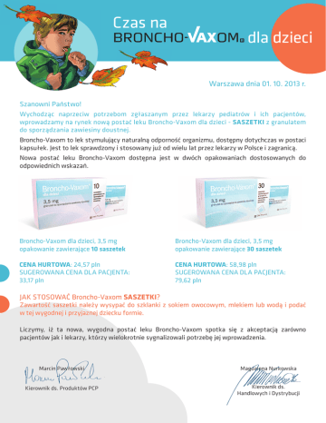 Czas na dla dzieci Warszawa dnia 01. 10. 2013 r. Szanowni Państwo! Wychodząc naprzeciw potrzebom zgłaszanym przez lekarzy pediatrów i ich pacjentów, wprowadzamy na rynek nową postać leku Broncho-Vaxom dla dzieci - SASZETKI z granulatem do sporządzania zawiesiny doustnej. Broncho-Vaxom to lek stymulujący naturalną odporność organizmu, dostępny dotychczas w postaci kapsułek. Jest to lek sprawdzony i stosowany już od wielu lat przez lekarzy w Polsce i zagranicą. Nowa postać leku Broncho-Vaxom dostępna jest w dwóch opakowaniach dostosowanych do odpowiednich wskazań. Broncho-Vaxom dla dzieci, 3,5 mg opakowanie zawierające 10 saszetek Broncho-Vaxom dla dzieci, 3,5 mg opakowanie zawierające 30 saszetek CENA HURTOWA: 24,57 pln SUGEROWANA CENA DLA PACJENTA: 33,17 pln CENA HURTOWA: 58,98 pln SUGEROWANA CENA DLA PACJENTA: 79,62 pln JAK STOSOWAĆ Broncho-Vaxom SASZETKI? Zawartość saszetki należy wysypać do szklanki z sokiem owocowym, mlekiem lub wodą i podać w tej wygodnej i przyjaznej dziecku formie. Liczymy, iż ta nowa, wygodna postać leku Broncho-Vaxom spotka się z akceptacją zarówno pacjentów jak i lekarzy, którzy wielokrotnie sygnalizowali potrzebę jej wprowadzenia. Marcin Pawłowski Magdalena Nurkowska Kierownik ds. Produktów PCP Kierownik ds. Handlowych i Dystrybucji Broncho-Vaxom, 3,5 mg lub 7 mg, kapsułki; Broncho-Vaxom dla dzieci, 3,5 mg, granulat do sporządzania zawiesiny doustnej. 1 dawka (1 kapsułka lub 1 saszetka) zawiera liofilizat OM-85, zawierający liofilizowane lizaty bakterii: Haemophilus influenzae, Diplococcus pneumoniae, Klebsiella pneumoniae, Klebsiella ozaenae, Staphylococcus aureus, Streptococcus pyogenes, Streptococcus viridans, Neisseria catarrhalis. Substancje pomocnicze: Galusan propylu bezwodny, sodu glutaminian bezwodny, mannitol, skrobia żelowana, magnezu stearynian. Ponadto Broncho-Vaxom zawiera: żelatynę indygotynę (E132), tytanu dwutlenek (E171); natomiast Broncho-Vaxom dla dzieci: magnezu krzemian. Wskazania terapeutyczne: Zapobieganie nawracającym zakażeniom dróg oddechowych, leczenie wspomagające ostrych zakażeń dróg oddechowych. Dawkowanie i sposób podawania: Zapobieganie nawracającym zakażeniom dróg oddechowych: zaleca się stosować przez trzy kolejne miesiące według schematu: 1 kapsułka lub 1 saszetka na dobę, na czczo przez 10 kolejnych dni w miesiącu przez 3 miesiące. Leczenie wspomagające ostrych zakażeń dróg oddechowych: 1 kapsułka lub 1 saszetka na dobę, na czczo do czasu ustąpienia objawów zakażenia, ale przez co najmniej 10 dni. Broncho-Vaxom oraz Broncho-Vaxom dla dzieci są produktami wspomagającym terapię przeciwbakteryjną. Najkorzystniej jest rozpocząć terapię Broncho-Vaxom lub Broncho-Vaxom dla dzieci jednocześnie z rozpoczęciem antybiotykoterapii. W celu łatwiejszego połknięcia kapsułki można ją potrzymać chwilę w jamie ustnej. Można też zawartość kapsułki lub saszetki wsypać do szklanki z sokiem owocowym, mlekiem lub wodą i wypić. Ten sposób jest zalecany szczególnie u małych dzieci. Przeciwwskazania: Nadwrażliwość na substancję czynną lub którąkolwiek z substancji pomocniczych. Specjalne ostrzeżenia i środki ostrożności dotyczące stosowania: Na podstawie dostępnej wiedzy nie zaleca się podawania tego produktu dzieciom w wieku poniżej 6 miesięcy ze względu na niedojrzałość ich układu immunologicznego. Działania niepożądane: W trakcie badań klinicznych częstość występowania działań niepożądanych wynosiła 3-4%. Częstość występowania określono według kryterium: bardzo często: ≥1/10; często: ≥1/100, <1/10; niezbyt często: ≥1/1 000, <1/100; rzadko: ≥1/10 000, <1/1 000; bardzo rzadko: <1/10 000 łącznie z pojedynczymi przypadkami. Zaburzenia układu nerwowego: często: ból głowy; Zaburzenia żołądka i jelit: często: biegunka, niezbyt często: nudności, wymioty, bóle brzucha, niestrawność; Zaburzenia skóry i tkanki podskórnej: niezbyt często: wysypka, pokrzywka; Zaburzenia oddechowe, klatki piersiowej i śródpiersia: niezbyt często: duszność, kaszel, astma; Zaburzenia ogólne i stany w miejscu podania: niezbyt często: gorączka, zmęczenie, reakcje alergiczne. W przypadku utrzymywania się zaburzenia żołądkowo-jelitowego produkt należy odstawić. W przypadku długotrwałego utrzymywania się reakcji skórnych i zaburzenia układu oddechowego, również należy przerwać stosowanie produktu, ponieważ te reakcje mogą mieć podłoże alergiczne. Kategoria dostępności: Produkt leczniczy wydawany z przepisu lekarza – Rp. Dane podmiotu odpowiedzialnego: OM PHARMA S.A., R. da Industria, 2 Quinta Grande, 2610-088 Amadora - Lisboa, Portugalia. Informacji o leku udziela: UCB Pharma Sp. z o.o./ VEDIM Sp. z o.o., ul. Kruczkowskiego 8, 00-380 Warszawa, tel. + 48 22 696 99 20 Numery pozwoleń na dopuszczenie do obrotu: R/0438 (3,5 mg, kapsułki), R/0629 (7 mg, kapsułki), 17048 (3,5 mg, granulat do sporządzania zawiesiny doustnej). Przed przepisaniem leku należy zapoznać się z Charakterystyką Produktu Leczniczego. Materiał promocyjny przeznaczony dla osób uprawnionych do wystawiania recept lub osób prowadzących obrót produktami leczniczymi. Opracowano: 2013-07. PL/LPSRC/BRV/127/2013/10