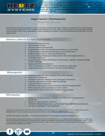 Hertz Systems Ltd Sp. z o.o. - polska firma, działająca z powodzeniem od ponad dwudziestu pięciu lat w branży nowych technologii, lider biznesu i innowacyjności także w przemyśle kosmicznym. Spółka realizuje m.in. projekty dla ESA – Europejskiej Agencji Kosmicznej i GSA – Europejskiej Agencji ds. Globalnych Systemów Nawigacji Satelitarnej. Od 2015 roku udziałowcem przedsiębiorstwa jest Agencja Rozwoju Przemysłu ARP Venture. W związku z dynamicznym rozwojem firma Hertz Systems poszukuje do swojego zespołu osoby na stanowisko: z powodzeniem od ponad dwudziestu pięciu lat w branży nowych technologii, lider biznesu i innowacyjności. Blogger/ Copywriter / Marketing Specialist Miejsce pracy: Zielona Góra Jeśli interesujesz się tematyką związaną z nowymi technologiami w branży GPS i GMS, nowinkami technologicznymi w świecie nawigacji satelitarnej i technologii kosmicznych, a do tego potrafisz ciekawie o tym pisać, dbając o zasady ortografii i interpunkcji, jesteś aktywny w social mediach, masz zacięcie marketingowe i szukasz ciekawej pracy związanej z Twoimi zainteresowaniami, nasza oferta może Cię zainteresować! Główne zadania na tym stanowisku: tworzenie kreatywnych treści opracowywanie tekstów tworzenie tekstów pod kątem SEO przygotowywanie treści oraz prowadzenie profili firmy w social media przygotowywanie artykułów do branżowych portali internetowych przygotowywanie treści na stronę internetową firmy prowadzenie bloga firmowego o tematyce branży GPS, technologie kosmiczne, technologie satelitarne przygotowywanie tekstów reklamowych i promocyjnych – zgodnie z zasadami strategii content marketingu redagowanie informacji prasowych udział w opracowywaniu grafik na stronę internetową i social media przygotowywanie słów kluczowych do kampanii Google AdWords perfekcyjna znajomość zasad ortografii, interpunkcji i stylistyki kreatywność i ciekawy styl umiejętność tworzenia ciekawych treści zachęcających do zakupu znajomość najnowszych trendów content marketingu znajomość dobrych praktyk SEO umiejętność optymalnego tworzenia słów kluczowych w Google AdWords dobra znajomość języka angielskiego w mowie i piśmie zaangażowanie, komunikatywność, umiejętność pracy w grupie wyjątkową atmosferę w pracy z zespołem doświadczonych i zaangażowanych specjalistów karnety na zajęcia sportowe i kulturalne możliwość profesjonalnego rozwoju swoich kompetencji ( szkolenia specjalistyczne) kurs języka angielskiego z native speakerem Wymagania: Oferujemy: Zainteresowane osoby prosimy o przesłanie oferty zawierającej CV i list motywacyjny wraz z fragmentami autorskich tekstów (artykuły, opisy do produktów lub inne treści) z podaniem nazwy stanowiska w temacie na adres: [email protected] Uprzejmie informujemy, że skontaktujemy się z wybranymi Kandydatami. Prosimy o dopisanie na aplikacji następującej klauzuli: Wyrażam zgodę na przetwarzanie moich danych osobowych przez HERTZ SYSTEMS LTD Sp. z o.o. z siedzibą w Zielonej Górze (65-120), Al. Zjednoczenia 118A, przedstawionych w aplikacji do pracy lub współpracy ze Spółką, w szczególności w przedłożonym CV oraz liście motywacyjnym, zgodnie z ustawą o ochronie danych osobowych z dnia 29 sierpnia 1997 roku (Dz. U. 2002 nr 101 poz. 926 ze zm.) na potrzeby aktualnych oraz przyszłych procesów rekrutacyjnych prowadzonych przez Spółkę.