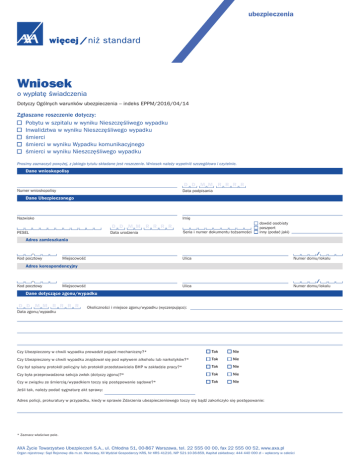 ubezpieczenia Wniosek o wypłatę świadczenia Dotyczy Ogólnych warunków ubezpieczenia – indeks EPPM/2016/04/14 Zgłaszane roszczenie dotyczy: Pobytu w szpitalu w wyniku Nieszczęśliwego wypadku Inwalidztwa w wyniku Nieszczęśliwego wypadku śmierci śmierci w wyniku Wypadku komunikacyjnego śmierci w wyniku Nieszczęśliwego wypadku Prosimy zaznaczyć powyżej, z jakiego tytułu składane jest roszczenie. Wniosek należy wypełnić szczegółowo i czytelnie. Dane wnioskopolisy D D M M R R R R Numer wnioskopolisy Data podpisania Dane Ubezpieczonego Nazwisko Imię D D M M R R R R PESEL Data urodzenia Seria i numer dokumentu tożsamości dowód osobisty paszport inny (podać jaki) Adres zamieszkania - Kod pocztowy Miejscowość Ulica Numer domu/lokalu Ulica Numer domu/lokalu Adres korespondencyjny - Kod pocztowy Miejscowość Dane dotyczące zgonu/wypadku D D M M R R R R Data zgonu/wypadku Okoliczności i miejsce zgonu/wypadku (wyczerpująco): Czy Ubezpieczony w chwili wypadku prowadził pojazd mechaniczny?* Tak Nie Czy Ubezpieczony w chwili wypadku znajdował się pod wpływem alkoholu lub narkotyków?* Tak Nie Czy był spisany protokół policyjny lub protokół przedstawiciela BHP w zakładzie pracy?* Tak Nie Czy była przeprowadzona sekcja zwłok (dotyczy zgonu)?* Tak Nie Czy w związku ze śmiercią/wypadkiem toczy się postępowanie sądowe?* Tak Nie Jeśli tak, należy podać sygnaturę akt sprawy: Adres policji, prokuratury w przypadku, kiedy w sprawie Zdarzenia ubezpieczeniowego toczy się bądź zakończyło się postępowanie: * Zaznacz właściwe pole. AXA Życie Towarzystwo Ubezpieczeń S.A., ul. Chłodna 51, 00-867 Warszawa, tel. 22 555 00 00, fax 22 555 00 52, www.axa.pl Organ rejestrowy: Sąd Rejonowy dla m.st. Warszawy, XII Wydział Gospodarczy KRS, Nr KRS 41216, NIP 521-10-36-859, Kapitał zakładowy: 444 440 000 zł – wpłacony w całości Dane dotyczące pobytu w szpitalu Data pobytu w szpitalu od D D M M R R R R do D D M M R R R R Nazwa i adres szpitala, w którym leczył się Ubezpieczony w związku ze Zdarzeniem ubezpieczeniowym: Czy zostało zakończone leczenie? Tak Nie Przyczyna pobytu w szpitalu: choroba wypadek (wymagane wypełnienie pól powyżej dotyczących miejsca i okoliczności wypadku) Dane dotyczące zgłaszającego roszczenie Nazwisko +48 Imię +48 Telefon komórkowy Telefon stacjonarny E-mail Adres korespondencyjny - Kod pocztowy Ulica Numer domu/lokalu Miejscowość Ulica Numer domu/lokalu Miejscowość Ulica Numer domu/lokalu Miejscowość Forma wypłaty świadczenia* Przelew bankowy Imię i nazwisko właściciela rachunku bankowego Numer rachunku bankowego Adres właściciela rachunku bankowego: - Kod pocztowy Przekaz pocztowy Adres: - Kod pocztowy Oświadczam, że na wszystkie powyższe pytania odpowiedziałem(am) zgodnie z prawdą. D D M M R R R R Data * Zaznacz właściwe pole. Miejscowość Podpis zgłaszającego roszczenie Dokumenty wymagane do zgłoszenia roszczenia Prosimy przekazać do Towarzystwa oryginały lub kopie następujących dokumentów poświadczonych za zgodność z oryginałem przez odpowiednio notariusza, pracownika USC, pracownika Towarzystwa, pracownika Euro Providus S.A. bądź – w przypadku dokumentacji medycznej – pracownika placówki medycznej, z której pochodzi dokumentacja. Prosimy zaznaczyć krzyżykiem załączane do wniosku kopie dokumentów. P OBYT UBEZPIECZONEGO W SZPITALU W WYNIKU NIESZCZĘŚLIWEGO WYPADKU Do wniosku należy dołączyć: kopię dokumentacji medycznej, potwierdzającej wystąpienie Zdarzenia ubezpieczeniowego, w tym: kartę informacyjną leczenia szpitalnego lub adresy placówek, w których Ubezpieczony był zarejestrowany, leczony w związku z zaistniałym zdarzeniem lub – w przypadku wniosku Ubezpieczonego o częściową wypłatę świadczenia – zaświadczenia o Pobycie w szpitalu w wyniku Nieszczęśliwego wypadku opis okoliczności zdarzenia, tj. Nieszczęśliwego wypadku kopię protokołu opisującego okoliczności zdarzenia (protokołu powypadkowego sporządzonego przez Komisję BHP, notatki urzędowej z policji, protokołu oględzin miejsca zdarzenia w przypadku Wypadku komunikacyjnego, informacji o sposobie zakończenia postępowania przygotowawczego, w przypadku gdy zostało wszczęte postępowanie przygotowawcze, lub kopii postanowienia o umorzeniu postępowania) kopię dowodu osobistego lub innego dokumentu tożsamości Ubezpieczonego kopię Umowy pożyczki INWALIDZTWO UBEZPIECZONEGO W WYNIKU NIESZCZĘŚLIWEGO WYPADKU Do wniosku należy dołączyć: opis okoliczności zdarzenia, tj. Nieszczęśliwego wypadku kopię opisu świadczenia pierwszej pomocy lub pomocy doraźnej (pogotowie ratunkowe, szpital) kopię protokołu opisującego okoliczności zdarzenia (protokołu powypadkowego sporządzonego przez Komisję BHP, notatki urzędowej z policji, protokołu oględzin miejsca zdarzenia w przypadku Wypadku komunikacyjnego, informacji o sposobie zakończenia postępowania przygotowawczego, w przypadku gdy zostało wszczęte postępowanie przygotowawcze, lub kopii postanowienia o umorzeniu postępowania) kopię dokumentacji medycznej, potwierdzającej wystąpienie zdarzenia ubezpieczeniowego, w tym: karty informacyjnej leczenia szpitalnego lub adresy placówek, w których Ubezpieczony był zarejestrowany, leczony w związku z zaistniałym zdarzeniem kopię dowodu osobistego lub innego dokumentu tożsamości Ubezpieczonego kopię Umowy pożyczki Ś MIERĆ UBEZPIECZONEGO Do wniosku należy dołączyć: kopię odpisu skróconego aktu zgonu Ubezpieczonego kopię karty statystycznej do karty zgonu lub innej dokumentacji medycznej potwierdzającej przyczynę śmierci kopię dowodu osobistego lub innego dokumentu tożsamości każdego z Uprawnionych do otrzymania świadczenia kopię odpisu postanowienia sądu o stwierdzeniu nabycia spadku lub notarialnego poświadczenia dziedziczenia – jeżeli Uprawniony jest spadkobiercą Ubezpieczonego kopię Umowy pożyczki Ś MIERĆ UBEZPIECZONE