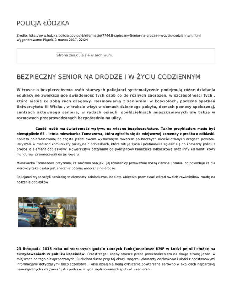 POLICJA ŁÓDZKA Źródło: http://www.lodzka.policja.gov.pl/ld/informacje/7744,Bezpieczny-Senior-na-drodze-i-w-zyciu-codziennym.html Wygenerowano: Piątek, 3 marca 2017, 22:24 Strona znajduje się w archiwum. BEZPIECZNY SENIOR NA DRODZE I W ŻYCIU CODZIENNYM W trosce o bezpieczeństwo osób starszych policjanci systematycznie podejmują różne działania edukacyjne zwiększające świadomość tych osób co do różnych zagrożeń, w szczególności tych , które niesie ze sobą ruch drogowy. Rozmawiamy z seniorami w kościołach, podczas spotkań Uniwersytetu III Wieku , w trakcie wizyt w domach dziennego pobytu, domach pomocy społecznej, centrach aktywnego seniora, w radach osiedli, spółdzielniach mieszkaniowych ale także w rozmowach przeprowadzanych bezpośrednio na ulicy. Cześć osób ma świadomość wpływu na własne bezpieczeństwo. Takim przykładem może być niewątpliwie 65 – letnia mieszkanka Tomaszowa, która zgłosiła się do miejscowej komendy z prośba o odblaski. Kobieta poinformowała, że często jeździ swoim wysłużonym rowerem po bocznych nieoświetlonych drogach powiatu. Usłyszała w mediach komunikaty policyjne o odblaskach, które ratują życie i postanowiła zgłosić się do komendy policji z prośbą o element odblaskowy. Rowerzystka otrzymała od policjantów kamizelkę odblaskową oraz inny element, który mundurowi przymocowali do jej roweru. Mieszkanka Tomaszowa przyznała, że zarówno ona jak i jej rówieśnicy przeważnie noszą ciemne ubrania, co powoduje że dla kierowcy taka osoba jest znacznie później widoczna na drodze. Policjanci wyposażyli seniorkę w elementy odblaskowe. Kobieta obiecała promować wśród swoich rówieśników modę na noszenie odblasków. 23 listopada 2016 roku od wczesnych godzin rannych funkcjonariusze KMP w Łodzi pełnili służbę na skrzyżowaniach w pobliżu kościołów. Przestrzegali osoby starsze przed przechodzeniem na drugą stronę jezdni w miejscach do tego niewyznaczonych. Funkcjonariusze przy tej okazji wręczali elementy odblaskowe i ulotki z podstawowymi informacjami dotyczącymi bezpieczeństwa. Takie działania będą cyklicznie powtarzane zarówno w okolicach najbardziej newralgicznych skrzyżowań jak i podczas innych zaplanowanych spotkań z seniorami. W ostatnim tygodniu zgierscy dzielnicowi oraz funkcjonariusze wydziału ruchu drogowego uczestniczyli w spotkaniach członków Domu Seniora. Funkcjonariusze wyczulili na działania złodziei kieszonkowych oraz przestępców działających metodą „na wnuczka” i „na policjanta”. Uczyli jak postępować aby nie stać się ofiarą a także jak zachować się i co zrobić gdy już do tego dojdzie. Ważnym tematem poruszonym w trakcie spotkania była pierwsza pomoc. Mundurowi pokazywali jak wykonać masaż serca i sztuczne oddychanie. Każdy uczestnik, pod okiem policjantów, mógł poćwiczyć na manekinie. Funkcjonariusze zaprezentowali również kilka podstawowych technik samoobrony. Wyjaśnili i pokazali w jaki sposób seniorzy mogą się bronić przed napastnikiem, który np. chce wyrwać im torebkę. Istotnym punktem spotkania było bezpieczeństwo osób starszych w ruchu drogowym. Zwrócono uwagę na właściwe poruszanie się po drodze zarówno w terenie zabudowanym, jak i poza nim. Policjanci przypomnieli jak bezpiecznie przechodzić przez jezdnię oraz o konieczności noszenia elementów odblaskowych, które ratują życie. Także w listopadzie w Urzędzie Miasta Brzeziny podczas obchodów Dnia Seniora brzezińscy policjanci składając życzenia przypomnieli również o bezpieczeństwie osób starszych. Funkcjonariusze przeprowadził dla blisko 100 osobowej grupy seniorów prelekcję na temat bezpieczeństwa osób starszych, wskazując na zagrożenia i sposób działania sprawców kradzieży i oszustw. Dzielnicowi mówiąc o bezpieczeństwie osób starszych na drodze, przypominali jak kamizelki i elementy odblaskowe założone w widocznym miejscu poprawiają widoczność. Tłumaczyli, że grupą szczególnie narażoną na udział w jesiennych wypadkach drogowych są piesi i rowerzyści.. Zachęcali wszystkich do zwiększania swojej widoczności poprzez wyposażenie się w takie odblaskowe elementy . Apelowali także do kierowców o szczególną ostrożność na drogach. Na zakończenie spotkania funkcjonariusze wręczyli seniorom odblaski. Policjanci zapowiadają kolejne akcje policyjne promujące noszenie odblasków. Warto dodać, że piesi poruszający się po zmierzchu po drodze poza obszarem zabudowanym, zobligowani są do noszenia odblasków umieszczonych w sposób widoczny dla kierujących. Za brak elementu odblaskowego grozi mandat w wysokości do 500 złotych. Ocena: 5/5 (2) Tweetnij bezpieczny senior