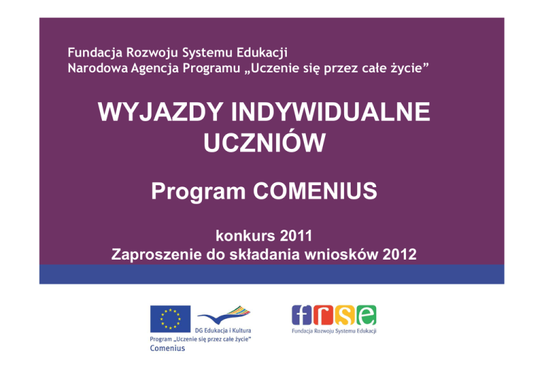 Fundacja Rozwoju Systemu Edukacji Narodowa Agencja Programu „Uczenie się przez całe Ŝycie” WYJAZDY INDYWIDUALNE UCZNIÓW Program COMENIUS konkurs 2011 Zaproszenie do składania wniosków 2012 cele akcji Uczniowie • umoŜliwienie uczniom szkół gimnazjalnych i ponadgimnazjalnych udziału w nauce i Ŝyciu w innym kraju europejskim • rozwinięcie w nich zrozumienia dla róŜnorodności kulturowej i językowej • nabycie przez nich kompetencji niezbędnych dla ich rozwoju osobistego Szkoły • wzmocnienie wieloletniej współpracy pomiędzy szkołami, która przyczyni się do wzajemnego uznawania nauki w szkołach partnerskich • wzmocnienie europejskiego wymiaru edukacji szkolnej WYJAZDY IDYWIDUALNE UCZNIÓW COMENIUSA uczestnicy • Uczniowie - szkół gimnazjalnych i ponadgimnazjalnych, które włączyły się w realizację Partnerskich Projektów Szkół Comeniusa • Szkoły gimnazjalne i ponadgimnazjalne, które: - są uprawnione do udziału w Partnerskich Projektach Szkół Comeniusa - aktualnie realizują Partnerski Projekt Szkół Comeniusa - zakończyły realizację Partnerskiego Projektu Szkół Comeniusa • brak ograniczeń czasowych w odniesieniu do daty/roku zakończenia realizacji projektu (program Socrates/LLP) • zalecane (ale nieobowiązkowe) są wzajemne wymiany uczniów pomiędzy szkołami/rodzinami goszczącymi WYJAZDY IDYWIDUALNE UCZNIÓW COMENIUSA kraje uczestniczące • Wyjazdy Indywidualne Uczniów mogą mieć miejsce wyłącznie pomiędzy szkołami tego samego Partnerskiego Projektu Szkół Comeniusa • szkoły te muszą pochodzić z następujących krajów: Austria, Belgia, Bułgaria, Chorwacja, Czechy, Dania, Estonia, Finlandia, Francja, Grecja, Hiszpania, Holandia, Islandia, Liechtenstein, Litwa, Luksemburg, Łotwa, Malta, Norwegia, Polska, Portugalia, Rumunia, Słowacja, Słowenia, Szwajcaria, Szwecja, Turcja, Węgry, Włochy • termin składania wniosków: 1 grudnia 2011r. • wnioski składają szkoły wysyłające do Narodowych Agencji w swoich krajach • wniosek musi być wypełniony i podpisany przez szkołę wysyłającą + list intencyjny od szkoły przyjmującej WYJAZDY IDYWIDUALNE UCZNIÓW COMENIUSA długość pobytu ucznia i czas realizacji projektu długość pobytu ucznia w szkole przyjmującej (dla kaŜdego wyjazdu oddzielnie) minimalna: 3 miesiące maksymalna: 10 miesięcy minimalny wiek uczniów biorących udział w wymianie: 14 lat (w dniu wyjazdu) • rozpoczęcie wyjazdów uczniów: początek roku szkolnego 2012/2013 • okres realizacji projektu: 01.06.2012 - 31.07.2013 • przygotowanie językowe uczniów: od 01.03.2012 Uczeń: • musi realizować obowiązek szkolny i obowiązek nauki • obowiązkowo uczestniczyć w lekcjach i zajęciach podczas pobytu w szkole zagranicznej • brać aktywny udział w Ŝyciu szkoły przyjmującej • będzie zakwaterowany u rodziny goszczącej, którą wybierze szkoła przyjmująca • jest objęty pełnym ubezpieczeniem w okresie pobytu za granicą WYJAZDY IDYWIDUALNE UCZNIÓW COMENIUSA Dofinansowanie i obowiązkowe szkolenia BudŜet projektu składa się z poniŜszych kategorii kosztów: • koszt jednej podróŜy ucznia w obie strony (według kosztów rzeczywistych) • kwota dla szkoły wysyłającej na administrację projektu (ryczałt 150 EUR/uczeń) • kwota dla szkoły przyjmującej na administrację projektu (ryczałt 500 EUR/uczeń) • miesięczne „kieszonkowe” dla ucznia (stawka ryczałtowa w zaleŜności od kraju, do którego uczeń wyjeŜdŜa) • kwota na przygotowanie językowe ucznia (ryczałt 120 EUR/uczeń) Narodowa Agencja zobowiązana jest do organizacji 2 obowiązkowych szkoleń dla uczestników projektów Wyjazdów Indywidualnych Uczniów Comeniusa: 1. Jednodniowe szkolenie przed wyjazdem za granicą (obowiązkowe dla uczniów wyjeŜdŜających i nauczycieli kontaktowych) 2. Dwudniowe szkolenie po przyjeździe do kraju goszczącego (obowiązkowe dla uczniów przyjeŜdŜających i mentorów) KOSZTY SZKOLEŃ (podróŜ, zakwaterowanie, wyŜywienie, materiały szkoleniowe) są pokrywane przez Narodową Agencję WYJAZDY IDYWIDUALNE UCZNIÓW COMENIUSA Przewodnik do Wyjazdów Indywidualnych Uczniów „Wyjazdy Indywidualne Uczniów Comeniusa – Przewodnik 2012” • podstawowy dokument, z którym muszą obowiązkowo zapoznać się wszystkie strony i osoby uczestniczące w projektach WIUC • ma szkołom, nauczycielom, uczniom, rodzicom, rodzinom goszczącym pomóc w zapewnieniu uczniom osiągnięcia zadowalających wyników w nauce i dobrych warunków podczas ich pobytu za granicą • zawiera praktyczne informacje dla wszystkich uczestników WIUC • precyzuje role i obowiązki wszystkich stron • określa terminy realizacji poszczególnych etapów realizacji projektu • zawiera wzory formularzy, z których naleŜy korzystać • składa się z 10 części WYJAZDY IDYWIDUALNE UCZNIÓW COMENIUSA kontakt z Narodową Agencją Fundacja Rozwoju Systemu Edukacji Narodowa Agencja Programu „Uczenie się przez całe Ŝycie” akcja Wyjazdy Indywidualne Uczniów Comeniusa ul. Mokotowska 43 00-551 Warszawa strona www.comenius.org.pl (zakładka Wyjazdy Indywidualne Uczniów) Osoba kontaktowa: Michał Waszczuk telefon: 22 4631 216 telefaks: 22 4631 021 e-mail: [email protected] WYJAZDY IDYWIDUALNE UCZNIÓW COMENIUSA