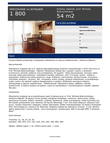MIESZKANIE na WYNAJEM 1 800 Kraków, Dębniki, prof. Michała Bobrzyńskiego 54 m2 743/3814/OMW Secondary ApartmentBuilding 2013 2 5 2 Adjoining 1 Opis Victoria Estate prezentuje 2-pokojowe mieszkanie w nowym budownictwie - dzielnica Dębniki. Nieruchomość: Mieszkanie znajduje się na 2. piętrze pięciopiętrowego budynku mieszkalnego z 2013 roku przy ul. Prof. Michała Bobrzyńskiego - Dębniki. Mieszkanie składa się z sypialni, salonu z aneksem kuchennym, łazienki, balkonu oraz przedpokoju. W sypialni - łóżko dwuosobowe, komoda; salon komoda, półka pod telewizor, rozkładana kanapa, telewizor, stół i 4 krzesła; aneks - meble w zabudowie, elektryczna płyta grzewcza, okap, lodówka z zamrażarką, zlewozmywak, zmywarka, mikrofala; łazienka - prysznic, WC, umywalka, lustro, pralka, grzejnik drabinkowy; w przedpokoju szafa i lustro. Do łazienki wejście bezpośrednio z sypialni. Możliwość wynajęcia miejsca postojowego w garażu podziemnym - 200zł/miesiąc. Mieszkanie ładne, zadbane i bardzo przestronne. Z salonu wyjście na balkon. Lokal na zamkniętym i monitorowanym osiedlu. Idealne dla pary. Lokalizacja: Mieszkanie znajduje się w południowej części Krakowa przy ul. Prof. Michała Bobrzyńskiegodzielnica Dębniki. W okolicy liczne punkty usługowo-handlowe: cukiernia, restauracja, sklepy spożywcze Groszek, Żabka, Lewiatan, Subway, bankomat, sklep monopolowy, salon kosmetyczny. Na osiedlu przedszkole oraz siłownia. Do Rynku Głównego 7 km. Dla osób lubiących aktywny tryb życia - ścieżki rowerowe i biegowe ( Zalew Zakrzówek, Skałki Twardowskiego). W okolicy Krakowski Park Technologiczny, kampus UJ, Motorola. Dogodny dojazd do obwodnicy miasta - 5 min. Bardzo dobre połączenie z resztą miasta - linie tramwajowe i autobusowe. 600 m do pętli MPK "Czerwone Maki". Komunikacja: Tramwaj: 11, 18, 23, 52, 62 Autobus: 194, 203, 213, 223, 244, 253, 263, 283, 662, 903 Opłaty: 1800zł najem + ok. 530zł czynsz adm. + prąd Victoria Estate Polecam i zapraszam do oglądania! Natalia Sujdak tel. +48 516 547 102 email: [email protected] Victoria Estate Powered by TCPDF (www.tcpdf.org)