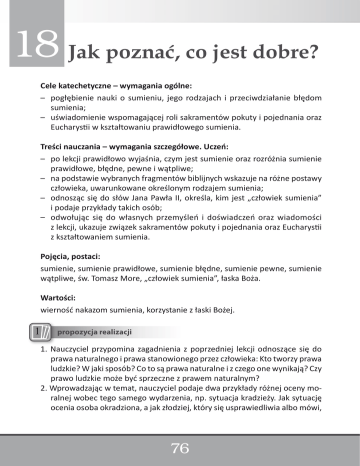 18 Jak poznać, co jest dobre? Cele katechetyczne – wymagania ogólne: – pogłębienie nauki o sumieniu, jego rodzajach i przeciwdziałanie błędom sumienia; – uświadomienie wspomagającej roli sakramentów pokuty i pojednania oraz Eucharystii w kształtowaniu prawidłowego sumienia. Treści nauczania – wymagania szczegółowe. Uczeń: – po lekcji prawidłowo wyjaśnia, czym jest sumienie oraz rozróżnia sumienie prawidłowe, błędne, pewne i wątpliwe; – na podstawie wybranych fragmentów biblijnych wskazuje na różne postawy człowieka, uwarunkowane określonym rodzajem sumienia; – odnosząc się do słów Jana Pawła II, określa, kim jest „człowiek sumienia” i podaje przykłady takich osób; – odwołując się do własnych przemyśleń i doświadczeń oraz wiadomości z lekcji, ukazuje związek sakramentów pokuty i pojednania oraz Eucharystii z kształtowaniem sumienia. Pojęcia, postaci: sumienie, sumienie prawidłowe, sumienie błędne, sumienie pewne, sumienie wątpliwe, św. Tomasz More, „człowiek sumienia”, łaska Boża. Wartości: wierność nakazom sumienia, korzystanie z łaski Bożej. realizacji: propozycja realizacji 1 Propozycja 1. Nauczyciel przypomina zagadnienia z poprzedniej lekcji odnoszące się do prawa naturalnego i prawa stanowionego przez człowieka: Kto tworzy prawa ludzkie? W jaki sposób? Co to są prawa naturalne i z czego one wynikają? Czy prawo ludzkie może być sprzeczne z prawem naturalnym? 2. Wprowadzając w temat, nauczyciel podaje dwa przykłady różnej oceny moralnej wobec tego samego wydarzenia, np. sytuacja kradzieży. Jak sytuację ocenia osoba okradziona, a jak złodziej, który się usprawiedliwia albo mówi, 76 że ma prawo mieć coś, co ma ktoś inny (możemy odwołać się do postawy Kalego z W pustyni i w puszczy H. Sienkiewicza). 3. Dyskusja na temat tego, czym jest sumienie, jak możemy je formować. Na koniec krótkiej rozmowy z uczniami nauczyciel tłumaczymy definicję „sumienia” oraz „sumienia błędnego” i „sumienia prawidłowego”, następnie dyktuje notatkę do zeszytu: Sumienie jest to głos Boga w człowieku, który mówi, co jest dobre, a co złe. Sumienie pobudza do czynienia dobra, a powstrzymuje od popełniania zła. Jest ono także naszym sędzią. Sumienie może być ukształtowane dobrze lub źle. Sumienie prawe i pewne dobro uznaje za dobro, a zło za zło. Sumienie fałszywe dobro uznaje za zło, a zło za dobro. Wątpliwe sumienie ma człowiek, który nie ma pewności, czy coś jest dobre, czy złe. Gdy w sumieniu człowiek ma wątpliwości, nie powinien podejmować żadnych decyzji, gdyż prowadzą one do deformacji sumienia. Należy wówczas poczekać, aż będziemy w sumieniu pewni, że to, co zamierzamy zrobić, jest słuszne i prawe. 4. Uczniowie otrzymują Pismo Święte i rozpoczyna się praca w grupach. Nauczyciel poleca uczniom, aby zapoznali się z tekstami z Pisma Świętego podanymi w zadaniu 1 w podręczniku na s. 110. Uczniowie szukają podanych perykop w Piśmie Świętym. Uczniowie zostają podzieleni na 4-osobowe zespoły. Nauczyciel prosi, aby narysowali tabelkę i wykonali zadanie 1. Po zakończeniu pracy zespoły prezentują swoje tabele i przemyślenia. 5. Nauczyciel stawia prowokujące pytanie: Kiedy możemy powiedzieć, że mamy czyste sumienie? Tłumaczy uczniom, czym jest rachunek sumienia, kiedy i dlaczego mamy go wykonywać oraz mówi, że codzienny rachunek sumienia pomaga w kształtowaniu sumienia prawego i pewnego. Następnie rozdaje uczniom dostosowane do ich poziomu i wieku rachunki sumienia i tłumaczymy, jak z nich korzystać. Zachęca także, aby korzystali z otrzymanej propozycji podczas przygotowywania się do sakramentu pokuty i pojednania. Innym sposobem zakończenia lekcji może być ułożenie razem z uczniami schematu rachunku sumienia w oparciu o Dekalog. 77 propozycja na lekcji propozycja pracypracy na lekcji 3 inna 12Inna Lekcję można przeprowadzić metodą „artykułu prasowego”10. Celem tej metody jest zwrócenie uwagi na wrażliwość, jaką posiada każdy człowiek. Uczniowie powinni (w ramach uprzednio zadanej pracy domowej) znaleźć wycinki prasowe ukazujące zachowania dobre i naganne. Znalezienie przykładów nagannych będzie łatwiejsze, dlatego – w czasie omawiania efektów poszukiwań na lekcji – warto skupić się na sygnałach pozytywnych. Na negatywne niech uczniowie spojrzą przez pryzmat pytania: Jak pomóc człowiekowi, który zachował się tak, jakby nie miał sumienia? Przy końcu lekcji warto raz jeszcze podkreślić wartość dobrze uformowanego sumienia, jak również chrześcijańską odpowiedzialność za formację sumienia drugiego człowieka. Warto przy tym zwrócić uwagę na zapisane w podręczniku słowa Jana Pawła II z Jasnej Góry (Co znaczy „czuwam”?) oraz ze Skoczowa (Polska potrzebuje ludzi sumienia). To drugie przemówienie można odnieść do sytuacji gwałtownej nagonki w prasie polskiej na Ojca św. po wygłoszeniu tych słów11. Opowiedzenie o tych wydarzeniach może stanowić punkt wyjścia do rozważań, kto miał rację i dlaczego niektórym ludziom zależy, aby nie przypominać o „potrzebie ludzi sumienia”. Podręcznik podaje definicje „sumienia”, „sumienia prawidłowego i błędnego”, „sumienia pewnego i wątpliwego”. Tekst przemówienia Jana Pawła II do młodzieży na Westerplatte ukazuje praktyczną wartość sumienia w życiu człowieka. Przykładem „człowieka sumienia” jest św. Tomasz More. Jego życiorys znalazł się również w podręczniku do klasy I. Zdecydowano się go umieścić powtórnie, gdyż temat mógł zostać pominięty z powodu braku czasu, zaś sama postać św. Tomasza More’a jest godna uwagi. Uzupełnieniem życiorysu jest Modlitwa o dobry humor zamieszczona na końcu jednostki. Warto troskę o dobry humor połączyć w trakcie lekcji z odwagą dbania o czyste sumienie wbrew wszelkim przeciwnościom. Warto zwrócić uwagę n