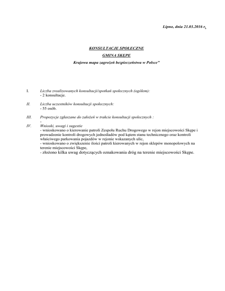 Lipno, dnia 21.03.2016 r. KONSULTACJE SPOŁECZNE GMINA SKĘPE Krajowa mapa zagrożeń bezpieczeństwa w Polsce” I. Liczba zrealizowanych konsultacji/spotkań społecznych (ogółem): - 2 konsultacje. II. Liczba uczestników konsultacji społecznych: - 55 osób. III. Propozycje zgłaszane do założeń w trakcie konsultacji społecznych : Wnioski, uwagi i sugestie - wnioskowano o kierowanie patroli Zespołu Ruchu Drogowego w rejon miejscowości Skępe i prowadzenie kontroli drogowych jednośladów pod kątem stanu technicznego oraz kontroli właściwego parkowania pojazdów w rejonie wskazanych ulic, - wnioskowano o zwiększenie ilości patroli kierowanych w rejon sklepów monopolowych na terenie miejscowości Skępe, - złożono kilka uwag dotyczących oznakowania dróg na terenie miejscowości Skępe. IV.