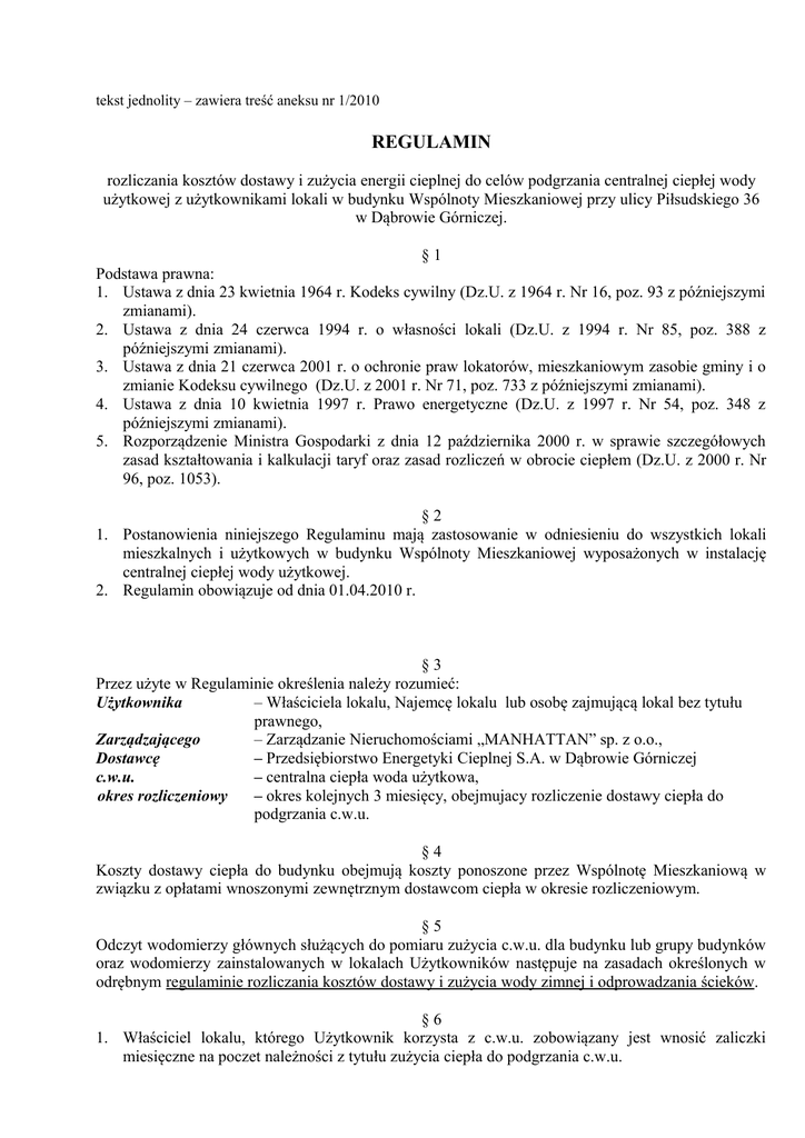 tekst jednolity – zawiera treść aneksu nr 1/2010 REGULAMIN rozliczania kosztów dostawy i zużycia energii cieplnej do celów podgrzania centralnej ciepłej wody użytkowej z użytkownikami lokali w budynku Wspólnoty Mieszkaniowej przy ulicy Piłsudskiego 36 w Dąbrowie Górniczej. §1 Podstawa prawna: 1. Ustawa z dnia 23 kwietnia 1964 r. Kodeks cywilny (Dz.U. z 1964 r. Nr 16, poz. 93 z późniejszymi zmianami). 2. Ustawa z dnia 24 czerwca 1994 r. o własności lokali (Dz.U. z 1994 r. Nr 85, poz. 388 z późniejszymi zmianami). 3. Ustawa z dnia 21 czerwca 2001 r. o ochronie praw lokatorów, mieszkaniowym zasobie gminy i o zmianie Kodeksu cywilnego (Dz.U. z 2001 r. Nr 71, poz. 733 z późniejszymi zmianami). 4. Ustawa z dnia 10 kwietnia 1997 r. Prawo energetyczne (Dz.U. z 1997 r. Nr 54, poz. 348 z późniejszymi zmianami). 5. Rozporządzenie Ministra Gospodarki z dnia 12 października 2000 r. w sprawie szczegółowych zasad kształtowania i kalkulacji taryf oraz zasad rozliczeń w obrocie ciepłem (Dz.U. z 2000 r. Nr 96, poz. 1053). §2 1. Postanowienia niniejszego Regulaminu mają zastosowanie w odniesieniu do wszystkich lokali mieszkalnych i użytkowych w budynku Wspólnoty Mieszkaniowej wyposażonych w instalację centralnej ciepłej wody użytkowej. 2. Regulamin obowiązuje od dnia 01.04.2010 r. §3 Przez użyte w Regulaminie określenia należy rozumieć: Użytkownika – Właściciela lokalu, Najemcę lokalu lub osobę zajmującą lokal bez tytułu prawnego, Zarządzającego – Zarządzanie Nieruchomościami „MANHATTAN” sp. z o.o., Dostawcę – Przedsiębiorstwo Energetyki Cieplnej S.A. w Dąbrowie Górniczej c.w.u. – centralna ciepła woda użytkowa, okres rozliczeniowy – okres kolejnych 3 miesięcy, obejmujacy rozliczenie dostawy ciepła do podgrzania c.w.u. §4 Koszty dostawy ciepła do budynku obejmują koszty ponoszone przez Wspólnotę Mieszkaniową w związku z opłatami wnoszonymi zewnętrznym dostawcom ciepła w okresie rozliczeniowym. §5 Odczyt wodomierzy głównych służących do pomiaru zużycia c.w.u. dla budynku lub grupy budynków oraz wodomierzy zainstalowanych w lokalach Użytkowników następuje na zasadach określonych w odrębnym regulaminie rozliczania kosztów dostawy i zużycia wody zimnej i odprowadzania ścieków. §6 1. Właściciel lokalu, którego Użytkownik korzysta z c.w.u. zobowiązany jest wnosić zaliczki miesięczne na poczet należności z tytułu zużycia ciepła do podgrzania c.w.u. strona - 2 - 2. Zaliczkę miesięczną, o której mowa w ust. 1 ustala Zarządzający na podstawie analizy kosztów zużycia energii cieplnej w poprzednich okresach rozliczeniowych oraz zmian w warunkach dostawy ciepła, powodujących istotne zmiany w wysokości kosztów (np. podwyżka cen ciepła). 3. Zaliczki miesięczne należy wnosić w terminach ustalonych dla innych opłat wnoszonych przez właścicieli lokali. §7 1. Po zakończeniu okresu rozliczeniowego, Zarządzający dokonuje rozliczenia kosztów podgrzania 1 m3 c.w.u. Koszt podgrzania 1 m3 zostaje ustalony jako iloraz łącznych kosztów podgrzania wody w budynku lub grupie budynków wykazanych w fakturach wystawianych przez Dostawcę oraz wskazań wodomierza głównego dla budynku lub grupy budynków. K1 = K W gdzie: K1 = koszt podgrzania 1 m3 wody, K = łączne koszty podgrzania wody w budynku lub grupie budynków, W = wskazania wodomierza głównego dla budynku lub grupy budynków w m3, 2. Całkowity koszt podgrzania c.w.u. w lokalu Użytkownika wylicza się jako iloczyn kosztu podgrzania 1 m3 c.w.u. dla budynku lub grupy budynków oraz ilości zużytej c.w.u. w lokalu Użytkownika ustalonej na podstawie odrębnego regulaminu wymienionego w § 5. K u = K1 ⋅ Z c gdzie: Ku = koszt podgrzania c.w.u. w lokalu użytkownika, K1 = koszt podgrzania 1 m3 wody, Zc = zużycie c.w.u. w lokalu użytkownika w m3. 3. W rozliczeniu nie uwzględnia się kosztów zużycia wody, które ustala odrębny regulamin wymieniony w § 5. §8 1. Jeżeli w wyniku rozliczenia kosztów podgrzania c.w.u. nastąpi nadpłata, wysokość nadpłaty zostaje zaliczona na poczet zaległych lub bieżących opłat miesięcznych właściciela związanych z utrzymaniem jego lokalu. 2. Jeżeli suma zaliczek miesięcznych nie pokryje należności wynikającej z rozliczenia (niedopłata), właściciel lokalu zobowiązany jest dopłacić brakującą kwotę równocześnie z najbliższą wpłatą należności na opłaty związane z utrzymaniem jego lokalu. §9 Regulamin został zatwierdzony Uchwałą Zebrania Wspólnoty Mieszkaniowej nr 10/2002 z dnia 31.10.2002 r. Aneks nr 1/2010 został zatwierdzony Uchwałą Zebrania Wspólnoty Mieszkaniowej nr 9/2010 z dnia 09.03.2010 r.