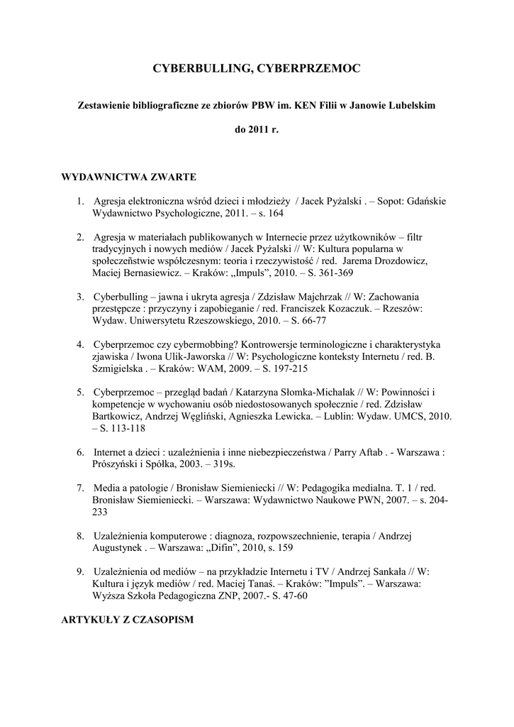 CYBERBULLING, CYBERPRZEMOC Zestawienie bibliograficzne ze zbiorów PBW im. KEN Filii w Janowie Lubelskim do 2011 r. WYDAWNICTWA ZWARTE 1. Agresja elektroniczna wśród dzieci i młodzieży / Jacek Pyżalski . – Sopot: Gdańskie Wydawnictwo Psychologiczne, 2011. – s. 164 2. Agresja w materiałach publikowanych w Internecie przez użytkowników – filtr tradycyjnych i nowych mediów / Jacek Pyżalski // W: Kultura popularna w społeczeñstwie współczesnym: teoria i rzeczywistość / red. Jarema Drozdowicz, Maciej Bernasiewicz. – Kraków: „Impuls”, 2010. – S. 361-369 3. Cyberbulling – jawna i ukryta agresja / Zdzisław Majchrzak // W: Zachowania przestępcze : przyczyny i zapobieganie / red. Franciszek Kozaczuk. – Rzeszów: Wydaw. Uniwersytetu Rzeszowskiego, 2010. – S. 66-77 4. Cyberprzemoc czy cybermobbing? Kontrowersje terminologiczne i charakterystyka zjawiska / Iwona Ulik-Jaworska // W: Psychologiczne konteksty Internetu / red. B. Szmigielska . – Kraków: WAM, 2009. – S. 197-215 5. Cyberprzemoc – przegląd badań / Katarzyna Słomka-Michalak // W: Powinności i kompetencje w wychowaniu osób niedostosowanych społecznie / red. Zdzisław Bartkowicz, Andrzej Węgliński, Agnieszka Lewicka. – Lublin: Wydaw. UMCS, 2010. – S. 113-118 6. Internet a dzieci : uzależnienia i inne niebezpieczeństwa / Parry Aftab . - Warszawa : Prószyński i Spółka, 2003. – 319s. 7. Media a patologie / Bronisław Siemieniecki // W: Pedagogika medialna. T. 1 / red. Bronisław Siemieniecki. – Warszawa: Wydawnictwo Naukowe PWN, 2007. – s. 204233 8. Uzależnienia komputerowe : diagnoza, rozpowszechnienie, terapia / Andrzej Augustynek . – Warszawa: „Difin”, 2010, s. 159 9. Uzależnienia od mediów – na przykładzie Internetu i TV / Andrzej Sankała // W: Kultura i język mediów / red. Maciej Tanaś. – Kraków: ”Impuls”. – Warszawa: Wyższa Szkoła Pedagogiczna ZNP, 2007.- S. 47-60 ARTYKUŁY Z CZASOPISM 10. ABC zachowań ryzykownych / oprac. Janina Węgrzecka-Giluń // Remedium. – 2010, nr 2, s. 16-17 11. Agresja elektroniczna – nowe wyzwanie / Kamila Knol // Remedium. – 2010, nr 2, s. 30-31 12. Agresja elektroniczna – wirtualne ciosy, realne rany – cz. 1 / Jacek Pyżalski // Remedium. – 2008, nr 9, s. 26-27 13. Agresja elektroniczna – wirtualne ciosy, realne rany – cz. 2 / Jacek Pyżalski // Remedium. – 2008, nr 10, s. 28-29 14. Agresja elektroniczna – wirtualne ciosy, realne rany – cz. 3 / Jacek Pyżalski // Remedium. – 2009, nr 10, s. 10-12 15. Agresja elektroniczna – wirtualne ciosy, realne rany – cz. 4 / Jacek Pyżalski // Remedium. – 2010, nr 7-8, s. 6-7 16. Bezpieczny Internet / Magda Wójcik // Remedium. – 2006, nr 10, s. 20 17. Cyberbulling (mobbing elektroniczny) wśród uczniów szkół podstawowych / Claire Monks, Rosario Ortega, Suzanne Robinson, Penny Worlidge // Kwartalnik Pedagogiczny. – 2009, nr 4, s. 167-182 18. Cyberprzemoc / Łukasz Wojtasik // Niebieska Linia. – 2007, nr 2, s. 27-29 19. Cyberprzemoc / Łukasz Wojtasik // Remedium. – 2008, nr 2, s. 4-5 20. Cyberprzemoc – koszmar on-line / Jakub Tomik // Magazyn Dyrektora Szkoły. – 2011, nr 10, s. 28-30 21. Cyberprzemoc w kontaktach rówieśniczych / Małgorzata Krajewska // OpiekaWychowanie-Terapia, 2010, nr 1-2, s. 12-17 22. Cyberprzemoc: zagrożenie dla młodego pokolenia / Ilona Gołębiewska // Wychowawca. – 2010, nr 7-8, s. 12-15 23. Cyberprzestrzeń – nowa arena przemocy rówieśniczej? / Julia Barlińska // Kwartalnik Pedagogiczny. – 2009, nr 4, s. 53-66 24. Cyberuzależnienia / Tomasz Biernat // Wychowanie na co Dzień. – 2002, nr 10/11, s. 42-43 25. Flaming i rolling jako forma agresji werbalnej w Internecie / Magdalena Szponar // Kwartalnik Pedagogiczny. – 2009, nr 4, s. 67-80 26. Gry komputerowe i agresja u dzieci / Małgorzata Michaliszyn // Życie Szkoły. – 2005, nr 10, 48-49 27. Internet jako źródło zagrożenia dla dziecka w wieku 13 lat w świetle badań własnych/ Agata Grabowska // Lider. – 2010, nr 3, s. 21-24 28. Jak zapobiegaæ zagrożeniom płynącym z sieci / Justyna Dobrołowicz // Nauczanie Początkowe. – 2008/2009, nr 1, s. 15-20 29. Lepiej zapobiegać niż leczyć / Anna Wojciechowska // Psychologia w Szkole. – 2010, nr 3, s. 5-13 30. O zagrożeniach w Internecie / Dorota Heise // Wychowawca. – 2010, nr 4, s. 18-19 31. Internet w nauczaniu języków obcych : blaski i cienie / Grażyna Dudek // Języki Obce w Szkole. – 2004, [nr] 6, s. 164-169 32. Internetowa pedofilia / Zbigniew Izdebski // Niebieska Linia. – 2002, nr 3, s. 13-15 33. Jak zapobiegać zagrożeniom płynącym z sieci / Justyna Dobrołowicz // Nauczanie Początkowe. – 2008/2009, nr 1, s. 15-20 34. Media elektroniczne a przemoc wśród młodzieży / Elżbieta Marczewska // Problemy Opiekuńczo Wychowawcze. – 2010, nr 5, s. 51-55 35. Młodzież upośledzona umysłowo w świecie nowoczesnych technologii komunikacyjnych / Piotr Plicht // Kwartalnik Pedagogiczny. – 2009, nr 9, s. 105-118 36. Mobbing w szkole – interwencja i profilaktyka / Anna Piekarska // Psychologia w Szkole. – 2010, nr 2, s. 48-60 37. Sieciowe zagrożenia / Łukasz Wojtasik // Niebieska Linia. – 2006, nr 1, s. 32-33 38. Szykanowanie elektroniczne i jego wpływ na atmosferę klasy / J. Hanuliakova, K. Holla // Wszystko dla Szkoły. – 2010, nr 5, s. 7-8 39. Uczeń bezpieczny w sieci / oprac. JAC // Remedium. – 2009, nr 5, s. 26-27 40. Uwodzenie dzieci w Internecie / Katarzyna Fenik // Niebieska Linia. – 2008, nr 6, s. 19-22 41. Uzależnieni od cyberprzemocy / Beata Nowaczyk // Wszystko dla Szkoły. – 2009, nr 11, s. 7-9 42. Uzależnienia od komputera i Internetu: czy gry komputerowe to dobra forma spędzania wolnego czasu? / Anna Kujawa //Wychowanie na co Dzień. – 2010, nr 1011, dod. wkładka metodyczna, s. I-IV 43. Zagrożenia internetowe – jak z nimi walczyć / Agata Kyzioł // Biblioteka – Szkolne Centrum Informacji. – 2010, nr 1, s. 30-38 
