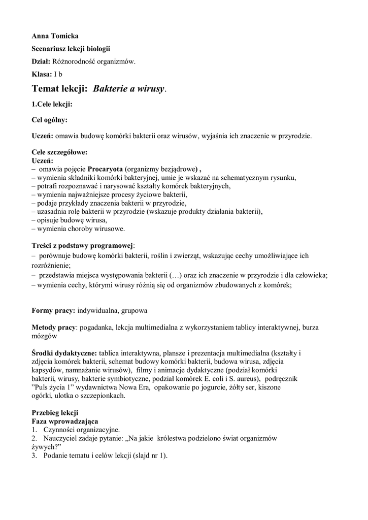 Anna Tomicka Scenariusz lekcji biologii Dział: Różnorodność organizmów. Klasa: I b Temat lekcji: Bakterie a wirusy. 1.Cele lekcji: Cel ogólny: Uczeń: omawia budowę komórki bakterii oraz wirusów, wyjaśnia ich znaczenie w przyrodzie. Cele szczegółowe: Uczeń: – omawia pojęcie Procaryota (organizmy bezjądrowe) , – wymienia składniki komórki bakteryjnej, umie je wskazać na schematycznym rysunku, – potrafi rozpoznawać i narysować kształty komórek bakteryjnych, – wymienia najważniejsze procesy życiowe bakterii, – podaje przykłady znaczenia bakterii w przyrodzie, – uzasadnia rolę bakterii w przyrodzie (wskazuje produkty działania bakterii), – opisuje budowę wirusa, – wymienia choroby wirusowe. Treści z podstawy programowej: – porównuje budowę komórki bakterii, roślin i zwierząt, wskazując cechy umożliwiające ich rozróżnienie; – przedstawia miejsca występowania bakterii (…) oraz ich znaczenie w przyrodzie i dla człowieka; – wymienia cechy, którymi wirusy różnią się od organizmów zbudowanych z komórek; Formy pracy: indywidualna, grupowa Metody pracy: pogadanka, lekcja multimedialna z wykorzystaniem tablicy interaktywnej, burza mózgów Środki dydaktyczne: tablica interaktywna, plansze i prezentacja multimedialna (kształty i zdjęcia komórek bakterii, schemat budowy komórki bakterii, budowa wirusa, zdjęcia kapsydów, namnażanie wirusów), filmy i animacje dydaktyczne (podział komórki bakterii, wirusy, bakterie symbiotyczne, podział komórek E. coli i S. aureus), podręcznik ”Puls życia 1” wydawnictwa Nowa Era, opakowanie po jogurcie, żółty ser, kiszone ogórki, ulotka o szczepionkach. Przebieg lekcji Faza wprowadzająca 1. Czynności organizacyjne. 2. Nauczyciel zadaje pytanie: „Na jakie królestwa podzielono świat organizmów żywych?” 3. Podanie tematu i celów lekcji (slajd nr 1). Faza realizacyjna: 1. Co wiemy o bakteriach? ( burza mózgów) slajd nr 2. Uczniowie mówią co wiedzą o bakteriach, jeśli określenie znajdzie się na schemacie nauczyciel je odsłania. Nauczyciel może zadawać pytania pomocnicze naprowadzające. www.nfos.org.pl/inne/prezentacje/bakteria_2.ppt 2. Przypomnienie budowy komórek bakterii (slajd nr 3). Uczniowie przypominają nazwy wskazanych elementów budowy komórki bakteryjnej. Po omówieniu wszystkich uzupełniają karty pracy. Jeden uczeń po uzupełnieniu kart odsłania nazwy elementów komórki. pl.wikipedia.org 3. Omówienie kształtów komórek bakterii oraz występowanie ich w koloniach (slajd nr 4). http://www.sciaga.pl/slowniki-tematyczne/1374/budowabakterii/ Podanie przykładów poszczególnych kształtów komórek bakterii (zdjęcia – slajdy nr 5, 6, 7, 8, 9). Podanie jako pracy domowej narysowanie w zeszycie kształtów komórek bakterii (zapisane w kartach pracy dla ucznia). 4. Omówienie sposobów odżywiania się bakterii na podstawie slajdu nr 10. http://www.kurkiewicz-family.com/biologia.htm 5. Omówienie sposobów oddychania bakterii na podstawie slajdu nr 11. http://www.kurkiewicz-family.com/biologia.htm 6. Uzupełnianie karty pracy – slajd nr 12. Ze względu na proces odżywiania bakterie dzielą się na samożywne i ……………………………. Bakterie …………………………………………… czerpią pokarm z rozkładu szczątków martwych organizmów (………………………) lub żyją kosztem żywych organizmów (……………………………).. Natomiast bakterie, które przeprowadzają proces …………………………………………… lub ………………………………… są samożywne. Proces oddychania dostarcza bakteriom …………………………………… niezbędnej do życia. Jako jedne z nielicznych organizmów mogą one oddychać zarówno tlenowo jak i ………………………… Fermentacja polega na rozkładzie substancji organicznych bez udziału …………………… Bakterie oddychające w ten sposób są wykorzystywane przez człowieka do produkcji ………………………………………, ………………………………………… i ………………………………………. 7. Omówienie sposobu rozmnażania bakterii (slajd nr 13 – animacja dot. rozmnażania bakterii). Przedstawienie krótkich filmików – rozmnażanie E. coli i S. ureus (slajdy nr 14 i 15). 8. Omówienie pozytywnego znaczenia bakterii (slajd nr 16): Pozytywne znaczenie bakterii: > Są organizmami pionierskimi, czyli zasiedlającymi środowiska pozbawione życia. Jako pierwsze pojawiają się w miejscach, gdzie życie odbudowywane jest na nowo np. po pożarach lasu. > W przemyśle spożywczym wykorzystywane są do sporządzania serów, kefirów, jogurtów oraz kiszonych warzyw. > Pełnią ważną funkcję w oczyszczaniu środowiska - rozkładają szczątki organizmów na substancje proste. Sole mineralne, które powstają w czasie tego procesu użyźniają gleby. Wyświetlenie krótkiego filmu dot. bakterii symbiotycznych (slajd nr 17). – przy braku czasu można go pominąć. 9. Omówienie negatywnego znaczenia bakterii (slajd nr 18): Negatywne skutki działalności bakterii: > Niektóre bakterie wytwarzają toksyny, powodujące zatrucia np. laseczka jadu kiełbasianego. > Bakterie wywołują procesy gnilne pogarszające znacznie jakość żywności (zwłaszcza owoców i warzyw). > Bakterie wywołują choroby. Atakują one nie tylko ludzi i zwierzęta, ale także rośliny. Do najczęściej występujących u ludzi chorób wywoływanych przez bakterie to: GRUŹLICA, ZAPALENIE PŁUC, ANGINA, CZERWONKA BAKTERYJNA, KIŁA I CHOROBA WRZODOWA ŻOŁĄDKA. Bakterie chorobotwórcze zwalcza się za pomocą antybiotyków. 10. Przedstawienie budowy wirusa – animacja – slajd nr 19. 11. Przykłady budowy wirusów na przykładzie wirusów kulistych i wirusa helikalnego.(slajdy nr 20 i 21). http://technolog.moodlehub.com/mod/book/print.php?id=85 WWW.bryk.pl/teksty Uzupełnienie kart pracy (przy bar