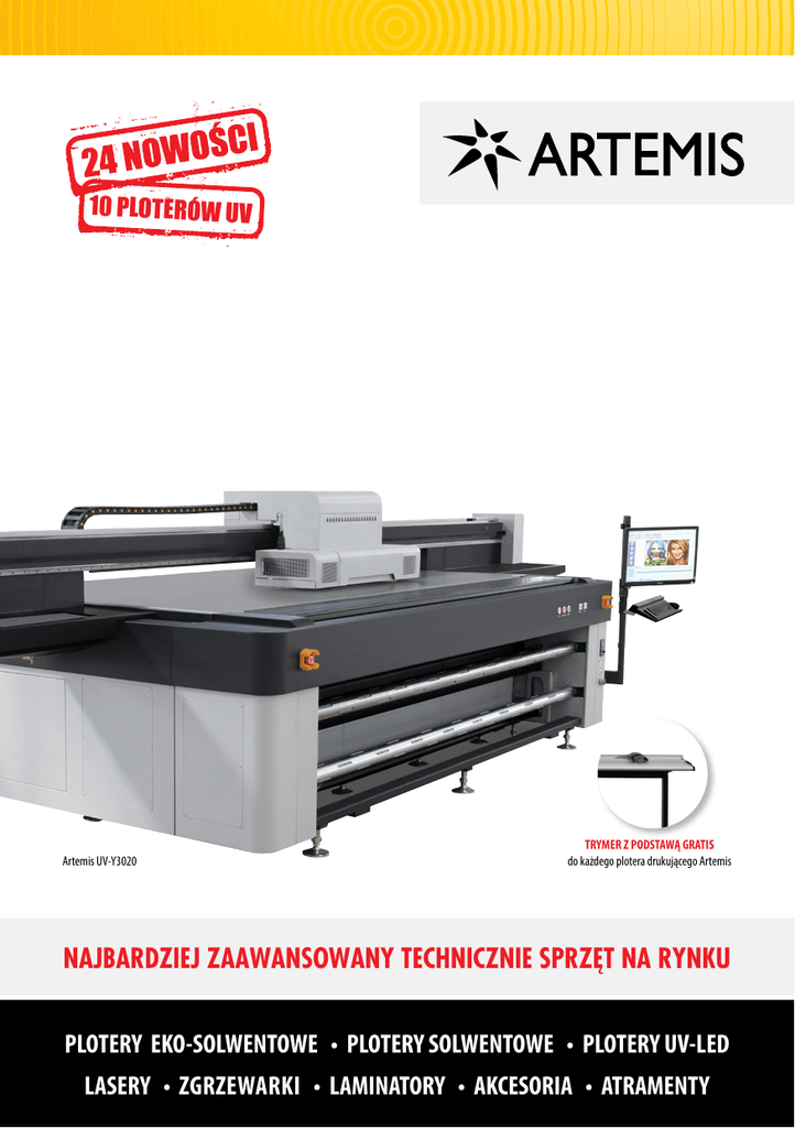 10 PLOTERÓW UV Artemis UV-Y3020 TRYMER Z PODSTAWĄ GRATIS do każdego plotera drukującego Artemis NAJBARDZIEJ ZAAWANSOWANY TECHNICZNIE SPRZĘT NA RYNKU PLOTERY EKO-SOLWENTOWE • PLOTERY SOLWENTOWE • PLOTERY UV-LED LASERY • ZGRZEWARKI • LAMINATORY • AKCESORIA • ATRAMENTY PLOTERY EKO-SOLWENTOWE PLOTERY EKO-SOLWENTOWE 18 m2/h System stałego zasilania ARTEMIS 1801 VD Najnowsza głowica DX9 (1440 dpi) ER ER Głowica DX5 - druk falą System stałego zasilania Zmienna kropla - Vardot Panel sterowania LCD System suszący Podwójny system suszący: promiennik IR + wentylatory ATRAMENT od 39 € LITR ATRAMENT Stabilna konstrukcja Główne zalety: - wysokiej jakości głowice DX5 + druk falą (eliminujący paskowanie) - stół z 3 niezależnymi grzałkami (przed, pod i za głowicą) - podwójny system suszący: promiennik podczerwieni + wentylatory - max. grubość mediów do 4 mm z łatwą regulacją za pomocą specjalnej dźwigni - system stałego zasilania obniżający koszty druku - 2-silnikowy system nawijający - zaawansowane oprogramowanie RIP - PhotoPrint od Ciężki, 2-silnikowy system nawijający GWARANCJA NAJNIŻSZEJ CENY NA RYNKU PLOTER TAŃSZY O POŁOWĘ od urządzeń konkurencyjnych ARTEMIS 1621 Atrament Szerokość materiału Szerokość zadruku Rozdzielczość Prędkość Gwarancja u klienta 39 € LITR eko-solwent (CMYK) max. 1600 mm max. 1520 mm max. 1440 x 1440 dpi max. 18 m2/h 12 miesięcy System rolowy 25 900 zł Artemis 1801 VD to ploter o szerokości 1800 mm. Zastosowana w nim została najnowsza głowica DX9 ze zmienną wielkością kropli, która posiada 1440 dysz w 8 rzędach. Łatwa regulacja wysokości karetki (max. grubość 3 mm). Eko-solwentowy Artemis cechuje się niskim kosztem eksploatacji jak i niskim kosztem zakupu. Posiada więc bardzo dobry wskaźnik zwrotu inwestycji. 5 POWODÓW 5 POWODÓW 1. 2. 3. 4. 5. 1. 2. 3. 4. 5. DLA KTÓRYCH WARTO WYBRAĆ TEN PLOTER BŁYSKAWICZNY ZWROT z inwestycji ARTEMIS 1801 VD Atrament Szerokość materiału Szerokość zadruku Rozdzielczość Prędkość Gwarancja u klienta eko-solwent (CMYK) max. 1800 mm max. 1720 mm max. 1440 x 1440 dpi max. 18 m2/h 12 miesięcy DLA KTÓRYCH WARTO WYBRAĆ TEN PLOTER Błyskawiczny zwrot inwestycji. Ograniczenie strat. Brak paskowania = oszczędność mediów. Ciągła produkcja: automatyczne systemy rolowe i suszące. Stabilna głowica EPSON na lata. Intuicyjna obsługa za pomocą oprogramowania PhotoPrint. Bardzo niska cena. Szersze możliwości = rolki do 180 cm. Gładkie przejścia tonalne i aple dzięki tech. zmiennej kropli. Automatyczna produkcja: system rolowy, suszący, zasilania. Najnowsze technologie - głowica Epson DX9. łatwa regulacja temperatur podwójny system suszący - wentylatory / InfraRed 2 LL SE LL SE Ułatwiony dostęp do głowic Ploter eko-solwentowy ST BE ST BE Ploter eko-solwentowy ARTEMIS 1621 ARTEMIS PRINTERS KATALOG 2016 SYSTEM SUSZĄCY www.artemisprinters.eu 3 PLOTERY SOLWENTOWE PLOTERY SOLWENTOWE 50 m2/h 50 m2/h System stałego zasilania Program RIP Ciężki system rolowy PRĘDKOŚĆ MAX. ATRAMENT eco 100 14 € od m2/h LITR BANER KTÓRY NIE ŚMIERDZI ARTEMIS KM 3208-42/14 64 900 zł W ZESTAWIE: system stałego zasilania, system rolowy, program, atramenty, instalacja 8 głowic Konica Minolta 512 System stałego zasilania 7 POWODÓW DLA KTÓRYCH WARTO WYBRAĆ TEN PLOTER 1. Zarabiaj szybciej - drukuj z realną prędkością 50 m2/h. 2. Oszczędzaj atramenty dzięki możliwości czyszczenia wszystkich lub pojedynczych sekcji kolorystycznych. 3. Produkcyjne, długowieczne głowice Konica Minolta. 4. Możliwość rozbudowy w miarę potrzeb o kolejne głowice. 5. Jakość druku porównywalna do ploterów eko. 6. Najtańszy atrament na rynku. 7. Wybierz nieśmierdzący atrament eko do wewnątrz lub agresywny i odporny na zewnątrz. 4 Atrament Szerokość materiału Szerokość zadruku Rozdzielczość Prędkość Gwarancja u klienta solwent / eko-solwent (CMYK) max. 3200 mm max. 3170 mm max. 1080 dpi max. 50 m2/h 12 miesięcy Wybierz głowice do swoich potrzeb! 42 pl 14 pl KONICA MINOLTA KM 512 KONICA MINOLTA KM 512 ARTEMIS PRINTERS KATALOG 2016 100 m2/h Program RIP ATRAMENT 16 € od LITR GWARANCJA NAJNIŻSZEJ CENY NA RYNKU PONAD 150 INSTALACJI w Polsce ARTEMIS KM 3204-42 / 3204-14 ZALETY PLOTERÓW ARTEMIS KM 3204-xx i 3208-xx: - wysokiej jakości japońskie i amerykańskie podzespoły - druk równoległy nawet na 2-3 rolkach jednocześnie - głowice grayscalowe Konica Minolta - 8 poziomów - stół z grzałkami podgrzewającymi materiał - automatyczny system rozwijająco-nawijający do 100 kg - oprogramowanie RIP: Onyx lub PhotoPRINT - stabilność, niezawodność i łatwa obsługa Ć PRĘDKOŚĆ MAX. 4 głowice Konica Minolta 512 Ć Ciężki system rolowy Ploter solwentowy OŚ W OŚ W ARTEMIS KM 3204-42/14 NO NO Ploter solwentowy ARTEMIS KM 3208-42 / 3208-14 ZALETY PLOTERÓW ARTEMIS KM 3204-xx i 3208-xx: - wysokiej jakości japońskie i amerykańskie podzespoły - druk równoległy nawet na 2-3 rolkach jednocześnie - głowice grayscalowe Konica Minolta - 8 poziomów - stół z grzałkami podgrzewającymi materiał - automatyczny system rozwijająco-nawijający do 100 kg - oprogramowanie RIP: Onyx lub PhotoPRINT - stabilność, niezawodność i łatwa obsługa 7 POWODÓW DLA KTÓRYCH WARTO WYBRAĆ TEN PLOTER 1. Dołącz do ponad 150 zadowolonych użytkowników w Polsce. 2. Zarabiaj jeszcze szybciej - drukuj z realną prędkością 100 m2/h. 3. Oszczędzaj atramenty dzięki możliwości czyszczenia wszystkich lub pojedynczych sekcji kolorystycznych. 4. Produkcyjne, długowieczne głowice Konica Minolta. 5. Jakość druku porównywalna do ploterów eko. 6. Najtańszy atrament na rynku. 7. Wybierz nie śmierdzący atrament eko do wewnątrz lub agresywny i odporny na zewnątrz. www.artemisprinters.eu Atrament Szerokość materiału Szerokość zadruku Rozdzielczość Prędkość Gwarancja u klienta solwent / eko-solwent (CMYK) max. 3200 mm max. 3170 mm max. 1080