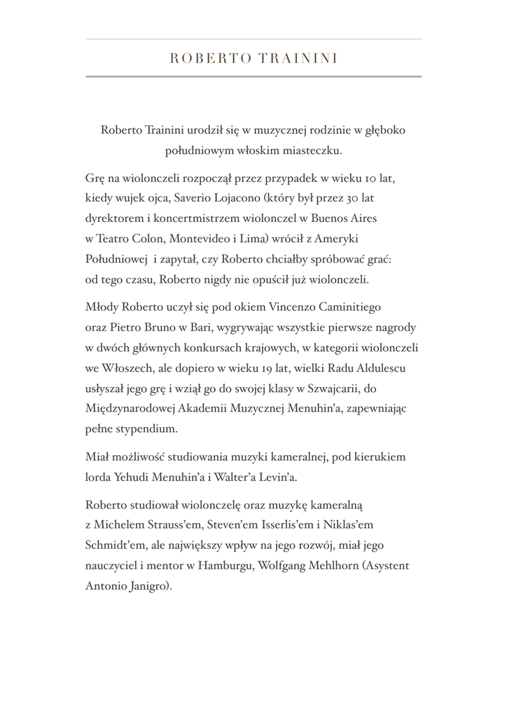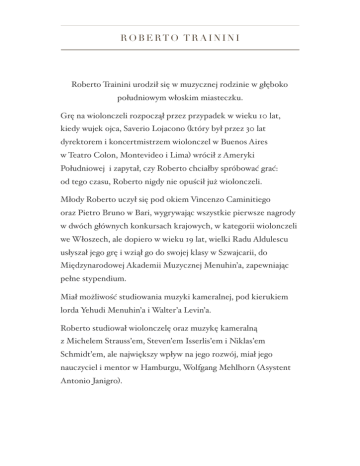 ROBERTO TRAININI Roberto Trainini urodził się w muzycznej rodzinie w głęboko południowym włoskim miasteczku. Grę na wiolonczeli rozpoczął przez przypadek w wieku 10 lat, kiedy wujek ojca, Saverio Lojacono (który był przez 30 lat dyrektorem i koncertmistrzem wiolonczel w Buenos Aires w Teatro Colon, Montevideo i Lima) wrócił z Ameryki Południowej i zapytał, czy Roberto chciałby spróbować grać: od tego czasu, Roberto nigdy nie opuścił już wiolonczeli. Młody Roberto uczył się pod okiem Vincenzo Caminitiego oraz Pietro Bruno w Bari, wygrywając wszystkie pierwsze nagrody w dwóch głównych konkursach krajowych, w kategorii wiolonczeli we Włoszech, ale dopiero w wieku 19 lat, wielki Radu Aldulescu usłyszał jego grę i wziął go do swojej klasy w Szwajcarii, do Międzynarodowej Akademii Muzycznej Menuhin’a, zapewniając pełne stypendium. Miał możliwość studiowania muzyki kameralnej, pod kierukiem lorda Yehudi Menuhin’a i Walter’a Levin’a. Roberto studiował wiolonczelę oraz muzykę kameralną z Michelem Strauss’em, Steven’em Isserlis’em i Niklas’em Schmidt’em, ale największy wpływ na jego rozwój, miał jego nauczyciel i mentor w Hamburgu, Wolfgang Mehlhorn (Asystent Antonio Janigro). Pomimo wszystkich tych osiągnięć oraz licznych nagród na najważniejszych międzynarodowych konkursach wiolonczelowych (Markneukirchen, Belgrad, Rzym, Hamburg) Roberto pozostał nieznanym wiolonczelistą w niemieckiej operze, a później w SSO Singapurze na krótki okres czasu aż do 2008 roku, kiedy jego kariera solowa wystartowała po swoim debiucie w Iasi w Rumunii z Koncertem Dvorak’a pod batutą Maestro Santorsola. Jest on obecnie regularnie zapraszanym solistą w Polsce, Niemczech, Austrii, Turcji, RPA, Rumunii, Cyprze, we Włoszech, Argentynie, Chinach, Japonii i Meksyku. Współzałożyciel Hamburger Streichsextett, Roberto był stałym członkiem Salzburger Solisten, grupy muzyki kameralnej, występującej na całym świecie. Jego wielką pasją, jest ponowne odkrywanie (wraz z M. Santorsola) włoskiego repertuaru XX wieku, m.in.: Respighi, Casella, Ghedini, Malipiero. Częścią tego projektu jest również Koncert wiolonczelowy Castelnuovo-Tedesco. Roberto studiował także i wykonywał dzieła Sofii Gubaiduliny “Canticle of the Sun”, koncert wiolonczelowy na wiolonczelę solo, chór kameralny, i perkusję - z samą Panią kompozytor w Niemczech. Pomimo wszystkich swoich osiągnięć, utrzymuje on opinię (cytat), że: "... konkursy nie mają nic wspólnego z muzyką i ekspresją, a wręcz przeciwnie - w dzisiejszych czasach mają tendencję zabijania wszystkich formy różnorodności w szaleńczym poszukiwaniu sukcesu. Sukcesu, który jest nietrwały i pozostawia niewielki ślad w sercach publiczności". "...... Każdy utwór ma intymną historię do powiedzenia, jakakolwiek ona by nie była; Naszym celem jest, aby ją opowiedzieć, jak współczesnych bardów, przystało: historie składają się nie ze słów, przestrzeni i czasu, ale z dźwięków i dlatego emocji i subtelnych wspomnień, z tzw niedopowiedzianych opowieści, w języku, który tak naprawdę nie ma granic. Jeśli będziemy myśleć, że musimy pokazać widzom, jak dobrzy czy szybcy jesteśmy, to zbłądzimy z właściwej ścieżki". Steven Isserlis powiedział mu kiedyś: "..... nigdy nie robisz tego, co mówię, ty używasz tylko swojej głowy..!” Nagrodzony w 2012 roku Premio Cartagine per la Musica w Rzymie, Roberto jest obecnie profesorem wiolonczeli w "Monteverdi" Konserwatorium w Bolzano we Włoszech, oraz w Academia de Arte de Florencia w Mexico City. Jest profesorem gościnnym w Radomiu, a także regularnie przeprowadza kursy mistrzowskie w Polsce, Meksyku, Włoszech, Hiszpanii, na Ukrainie i w Argentynie. Od 2014 roku artysta dokonuje nagrań dla Brilliant Classics: jego wysoko oceniane nagranie sonaty i utworów na wiolonczelę i fortepian Giuseppe Martucci’ego z Massimiliano Ferrati było pierwszym wydaniem z tej serii. W 2016 roku zostanie wydany m.in. album ze słynną sonatą skrzypcową Cesar’a Franck’a A-dur oraz Sonata Kreutzerowska L.van Beethovena, która zarejestrowana zostanie w duecie z pianistą Cristiano Burato. Obecnie nagrywa on komplet Suit Wiolonczelowych J. S. Bacha oraz własną transkrypcję Chaconny na wiolonczelę solo dla Aevea / OnClassical. Roberto gra na dwóch włoskich instrumentach wykonanych przez Alessandro Ciciliati’ego w 2009 i 2014 roku, a od czasu do czasu na "Ex-Watykan" Stradivarius udostępnionego mu przez Academia de Arte de Florencia.