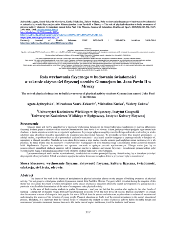 Jędrzyńska Agata, Szark-Eckardt Mirosława, Kuska Michalina, Zukow Walery. Rola wychowania fizycznego w budowaniu świadomości w zakresie aktywności fizycznej uczniów Gimnazjum im. Jana Pawła II w Mroczy = The role of physical education to build awareness of physical activity students Gymnasium named John Paul II in Mrocza. Journal of Education, Health and Sport. 2015;5(9):317-336. ISSN 2391-8306. DOI 10.5281/zenodo.30926 http://dx.doi.org/10.5281/zenodo.30926 http://ojs.ukw.edu.pl/index.php/johs/article/view/2015%3B5%289%29%3A317-336 https://pbn.nauka.gov.pl/works/624239 Formerly Journal of Health Sciences. ISSN 1429-9623 / 2300-665X. Archives 2011–2014 http://journal.rsw.edu.pl/index.php/JHS/issue/archive Deklaracja. Specyfika i zawartość merytoryczna czasopisma nie ulega zmianie. Zgodnie z informacją MNiSW z dnia 2 czerwca 2014 r., że w roku 2014 nie będzie przeprowadzana ocena czasopism naukowych; czasopismo o zmienionym tytule otrzymuje tyle samo punktów co na wykazie czasopism naukowych z dnia 31 grudnia 2014 r. The journal has had 5 points in Ministry of Science and Higher Education of Poland parametric evaluation. Part B item 1089. (31.12.2014). © The Author (s) 2015; This article is published with open access at Licensee Open Journal Systems of Kazimierz Wielki University in Bydgoszcz, Poland and Radom University in Radom, Poland Open Access. This article is distributed under the terms of the Creative Commons Attribution Noncommercial License which permits any noncommercial use, distribution, and reproduction in any medium, provided the original author(s) and source are credited. This is an open access article licensed under the terms of the Creative Commons Attribution Non Commercial License (http://creativecommons.org/licenses/by-nc/3.0/) which permits unrestricted, non commercial use, distribution and reproduction in any medium, provided the work is properly cited. This is an open access article licensed under the terms of the Creative Commons Attribution Non Commercial License (http://creativecommons.org/licenses/by-nc/3.0/) which permits unrestricted, non commercial use, distribution and reproduction in any medium, provided the work is properly cited. The authors declare that there is no conflict of interests regarding the publication of this paper. Received: 25.08.2015. Revised 05.09.2015. Accepted: 08.09.2015. Rola wychowania fizycznego w budowaniu świadomości w zakresie aktywności fizycznej uczniów Gimnazjum im. Jana Pawła II w Mroczy The role of physical education to build awareness of physical activity students Gymnasium named John Paul II in Mrocza Agata Jędrzyńska1, Mirosława Szark-Eckardt2, Michalina Kuska2, Walery Zukow2 1 2 Uniwersytet Kazimierza Wielkiego w Bydgoszczy, Instytut Geografii Uniwersytet Kazimierza Wielkiego w Bydgoszczy, Instytut Kultury Fizycznej Streszczenie Tematem pracy jest wpływ uczestnictwa w zajęciach wychowania fizycznego na proces budowania świadomości w zakresie aktywności fizycznej. Badana grupa to uczniowie klas trzecich Gimnazjum im. Jana Pawła II w Mroczy. Celem, jaki przyświecał podjęciu tego tematu było zbadanie, w jakim stopniu uczestnictwo w zajęciach wychowania fizycznego wpływa na ogólny rozwój młodego człowieka w określonym wieku szkolnym oraz określenie stosunku nastolatków do podejmowania aktywności fizycznej. W przypadku uczniów klas trzecich gimnazjum – a założyć można, że problem dotyczy także pozostałych poziomów nauczania – duża część uczniów rezygnuje z czynnego udziału w lekcjach wf, najczęściej z błahych powodów. Nakłada się to na okres dojrzewania, a więc trudny czas dla uczniów pod względem zmian zachodzących w ich psychice. To także trudny czas dla rodziców i wychowawców, wymagający od nich znacznej uwagi i zrozumienia źródeł zachowań młodych ludzi. Wychowanie fizyczne bez wątpienia ma ogromne znaczenie w ogólnym procesie wychowawczym. Dlatego ważne jest, by na poszczególnych szczeblach edukacji uczniowi nabyli pożądane nawyki w zakresie aktywności fizycznej i świadomości prozdrowotnej, gdyż w późniejszym życiu, w przypadku zaniedbań w tym obszarze, trudniej będzie je w sobie wzbudzić. Z przeprowadzonych analiz można wywnioskować, że młodzież ma w sobie potencjał fizyczny i intelektualny, by w dorosłym życiu być aktywnymi i zdrowymi ludźmi. Jednak warunkiem tego jest świadome kreowanie nawyków, które w przyszłości będą to warunkować. Słowa kluczowe: wychowanie fizyczne, aktywność fizyczna, kultura fizyczna, świadomość, edukacja, styl życia, zdrowie. Abstract The theme of the work is the impact of participation in physical education classes on the process of building awareness of physical activity. The test group is a third grade students Gymnasium named John Paul II in Mrocza. The goal, which prevailed during the adoption of this theme was to examine the extent to which participation in the classes of physical education affects the overall development of a young man in a particular school and the determination of the ratio of teenagers to make physical activity. In the case of third-country students in grades Gymnasium – and you can bet that the problem also applies to the other levels of learning – a large part of students resigns from active participation in lessons of wf, the most trivial of reasons. Imposes on puberty, so a tough time for students in terms of changes in their psyche. It's also a difficult time for parents and educators, requires them to substantial attention and understanding the sources of the behavior of young people. Physical education no doubt is of the utmost importance in the overall educational process. Therefore, it is important that the various levels of education the student in terms of physical activity habits desirable bought and awareness of preventive treatment, because later on in life, in the case of neglect in this area, it will be harder in itself arouse