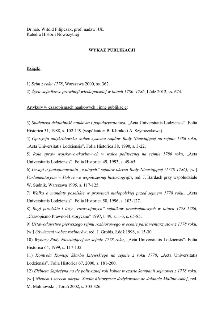 Dr hab. Witold Filipczak, prof. nadzw. UŁ Katedra Historii Nowożytnej WYKAZ PUBLIKACJI Książki: 1) Sejm z roku 1778, Warszawa 2000, ss. 362. 2) Życie sejmikowe prowincji wielkopolskiej w latach 1780–1786, Łódź 2012, ss. 674. Artykuły w czasopismach naukowych i inne publikacje: 3) Studencka działalność naukowa i popularyzatorska, „Acta Universitatis Lodziensis”. Folia Historica 31, 1988, s. 102-119 (współautor: B. Klimko i A. Szymczakowa). 4) Opozycja antykrólewska wobec systemu rządów Rady Nieustającej na sejmie 1786 roku, „Acta Universitatis Lodziensis”. Folia Historica 38, 1990, s. 3-22. 5) Rola spraw wojskowo-skarbowych w walce politycznej na sejmie 1786 roku, „Acta Universitatis Lodziensis”. Folia Historica 49, 1993, s. 49-65. 6) Uwagi o funkcjonowaniu „wolnych” sejmów okresu Rady Nieustającej (1778-1786), [w:] Parlamentaryzm w Polsce we współczesnej historiografii, red. J. Bardach przy współudziale W. Sudnik, Warszawa 1995, s. 117-125. 7) Walka o mandaty poselskie w prowincji małopolskiej przed sejmem 1778 roku, „Acta Universitatis Lodziensis”. Folia Historica 58, 1996, s. 103-127. 8) Rugi poselskie i losy „rozdwojonych” sejmików przedsejmowych w latach 1778-1786, „Czasopismo Prawno-Historyczne” 1997, t. 49, z. 1-3, s. 65-85. 9) Ustawodawstwo pierwszego sejmu rozbiorowego w ocenie parlamentarzystów z 1778 roku, [w:] Oświeceni wobec rozbiorów, red. J. Grobis, Łódź 1998, s. 15-30. 10) Wybory Rady Nieustającej na sejmie 1778 roku, „Acta Universitatis Lodziensis”. Folia Historica 64, 1999, s. 117-132. 11) Kontrola Komisji Skarbu Litewskiego na sejmie z roku 1778, „Acta Universitatis Lodziensis”. Folia Historica 67, 2000, s. 181-200. 12) Elżbieta Sapieżyna na tle politycznej roli kobiet w czasie kampanii sejmowej z 1778 roku, [w:] Niebem i sercem okryta. Studia historyczne dedykowane dr Jolancie Malinowskiej, red. M. Malinowski., Toruń 2002, s. 303-326. 13) Sejmy Rzeczypospolitej w dobie stanisławowskiej, [w:] Między konstytucją Nihil novi a ustawodawstwem nowoczesnej demokracji. Parlamentaryzm Polski w XVI-XX wieku, red. H. Gmiterek, S. Piątkowski, J. Wrona, Radom 2005, s. 59-82. 14) Ogólnopolski konkurs Fundacji Aurea Demokratia, „Kwartalnik Historyczny”, R. CXII, 4, 2005, s. 189-190. 15) Rec.: Jerzy Ternes, Sejmik chełmski za Wazów (1587-1668), Lubelskie Towarzystwo Naukowe, Lublin 2004 - „Przegląd Nauk Historycznych”, R. IV, nr 1(7), 2005, s. 149-157. 16) Sprawozdanie z Ogólnopolskiej Konferencji Naukowej Między Konstytucją „Nihil novi” a ustawodawstwem nowoczesnej demokracji, "Przegląd Nauk Historycznych", R. IV, nr 2(8), 2005, s. 223-228. 17) Ekonomie litewskie w polityce sejmikowej Stanisława Augusta po upadku Antoniego Tyzenhauza (1780-1783), „Przegląd Nauk Historycznych”, R. V, nr 1(9), 2006, s. 235-276. 18) Rec.: Leszek Andrzej Wierzbicki, O zgodę w Rzeczypospolitej. Zjazd warszawski i sejm pacyfikacyjny 1673 roku, Wydawnictwo Uniwersytetu Marii Curie-Skłodowskiej. Lublin 2005, ss. 328 – „Przegląd Nauk Historycznych”, R. V, nr 2 (10), 2006, s. 270-281. 19) Rec.: Jarosław Stolicki, Wobec wolności i króla. Działalność polityczna szlachty ruskiej, ukrainnej i wołyńskiej w latach 1673-1683, Towarzystwo Wydawnicze „Historia Iagellonica”, Kraków 2007, ss. 336 – „Przegląd Nauk Historycznych”, R. VII, nr 2, 2008, s. 187-199. 20) Stronnictwo regalistyczne w województwie kijowskim 1780-1782, „Przegląd Nauk Historycznych”, R. VIII, nr 1, 2009, s. 79-104. 21) Sejmiki województwa płockiego 1780-1786, „Przegląd Nauk Historycznych”, R. VIII, nr 2, 2009, s. 23-62. 22) Sejmiki ziemi czerskiej 1780-1786, "Przegląd Nauk Historycznych", R. IX, nr 1, 2010, s. 139-179. 23) Aktywność sejmikowa regalistów w województwie rawskim w latach 1780-1786, "Rocznik Łódzki", t. LVII, 2010, s. 11-39. 24) Stanisław August i Elżbieta Sapieżyna. Spór wokół losów sejmu 1782 roku, [w:] Władza i polityka w czasach nowożytnych, red. Z. Anusik, Łódź 2011, s. 53-75. 25) Rozdwojone wołyńskie sejmiki poselskie w 1786 roku, „Res Historica” 2013, nr 36, s. 163190. 26) Sejmiki ziemi nurskiej 1780-1786, „Przegląd Nauk Historycznych” 2014, R. XIII, nr 1, s. 23-62. 2 27) Sejmiki koronne z lat 1778-1786 wobec polityki Królestwa Pruskiego w stosunku do Polski, [w:] W podróży przez wiek osiemnasty... Studia i szkice z epoki nowożytnej, red. A. Perłakowski, M. Wyszomirska, M. Zwierzykowski, Kraków 2015, s. 295-315. 28) Anna z Pociejów Tyszkiewiczowa, wojewodzina smoleńska. Rola polityczna w czasach Rady Nieustającej, [w:] Kobiety i władza w czasach dawnych, red. B. Czwojdrak i A.A. Kluczek, Katowice 2015, s. 405-434. 29) Sejmiki ziemi zakroczymskiej 1778-1786, "Przegląd Nauk Historycznych” 2015, R. XIV, nr 2, s. 85-121. 30) Szlachta koronna wobec reformy sejmu w świetle instrukcji poselskich z lat 1778-1786, [w:] Między Barokiem a Oświeceniem. Parlamentaryzm, red. B. Krysztopa-Czupryńska, J. Kiełbik, Olsztyn 2016, s. 55-69. 31) Samorząd szlachecki województwa kijowskiego w połowie lat osiemdziesiątych XVIII wieku (1783–1785), "Wieki Stare i Nowe" 2016, t. 10 (15), s. 77-97. 3