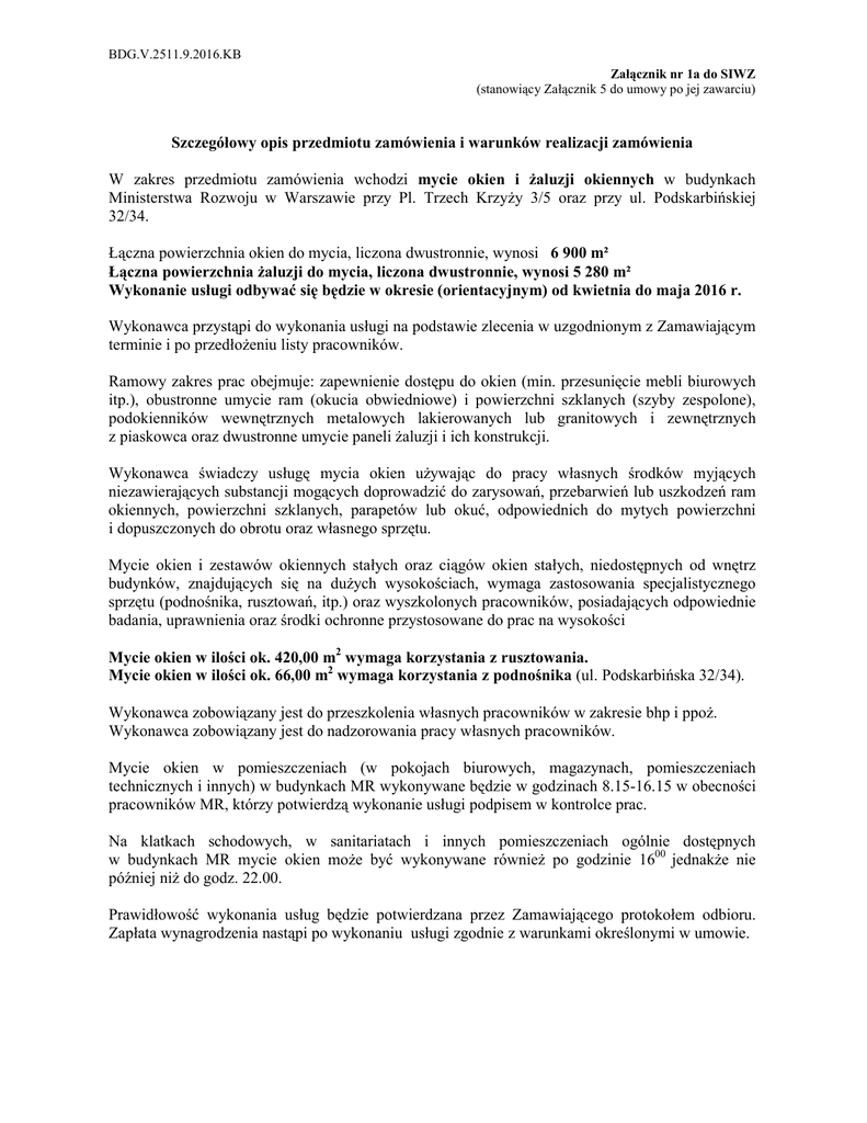 BDG.V.2511.9.2016.KB Załącznik nr 1a do SIWZ (stanowiący Załącznik 5 do umowy po jej zawarciu) Szczegółowy opis przedmiotu zamówienia i warunków realizacji zamówienia W zakres przedmiotu zamówienia wchodzi mycie okien i żaluzji okiennych w budynkach Ministerstwa Rozwoju w Warszawie przy Pl. Trzech Krzyży 3/5 oraz przy ul. Podskarbińskiej 32/34. Łączna powierzchnia okien do mycia, liczona dwustronnie, wynosi 6 900 m² Łączna powierzchnia żaluzji do mycia, liczona dwustronnie, wynosi 5 280 m² Wykonanie usługi odbywać się będzie w okresie (orientacyjnym) od kwietnia do maja 2016 r. Wykonawca przystąpi do wykonania usługi na podstawie zlecenia w uzgodnionym z Zamawiającym terminie i po przedłożeniu listy pracowników. Ramowy zakres prac obejmuje: zapewnienie dostępu do okien (min. przesunięcie mebli biurowych itp.), obustronne umycie ram (okucia obwiedniowe) i powierzchni szklanych (szyby zespolone), podokienników wewnętrznych metalowych lakierowanych lub granitowych i zewnętrznych z piaskowca oraz dwustronne umycie paneli żaluzji i ich konstrukcji. Wykonawca świadczy usługę mycia okien używając do pracy własnych środków myjących niezawierających substancji mogących doprowadzić do zarysowań, przebarwień lub uszkodzeń ram okiennych, powierzchni szklanych, parapetów lub okuć, odpowiednich do mytych powierzchni i dopuszczonych do obrotu oraz własnego sprzętu. Mycie okien i zestawów okiennych stałych oraz ciągów okien stałych, niedostępnych od wnętrz budynków, znajdujących się na dużych wysokościach, wymaga zastosowania specjalistycznego sprzętu (podnośnika, rusztowań, itp.) oraz wyszkolonych pracowników, posiadających odpowiednie badania, uprawnienia oraz środki ochronne przystosowane do prac na wysokości Mycie okien w ilości ok. 420,00 m2 wymaga korzystania z rusztowania. Mycie okien w ilości ok. 66,00 m2 wymaga korzystania z podnośnika (ul. Podskarbińska 32/34). Wykonawca zobowiązany jest do przeszkolenia własnych pracowników w zakresie bhp i ppoż. Wykonawca zobowiązany jest do nadzorowania pracy własnych pracowników. Mycie okien w pomieszczeniach (w pokojach biurowych, magazynach, pomieszczeniach technicznych i innych) w budynkach MR wykonywane będzie w godzinach 8.15-16.15 w obecności pracowników MR, którzy potwierdzą wykonanie usługi podpisem w kontrolce prac. Na klatkach schodowych, w sanitariatach i innych pomieszczeniach ogólnie dostępnych w budynkach MR mycie okien może być wykonywane również po godzinie 1600 jednakże nie później niż do godz. 22.00. Prawidłowość wykonania usług będzie potwierdzana przez Zamawiającego protokołem odbioru. Zapłata wynagrodzenia nastąpi po wykonaniu usługi zgodnie z warunkami określonymi w umowie.