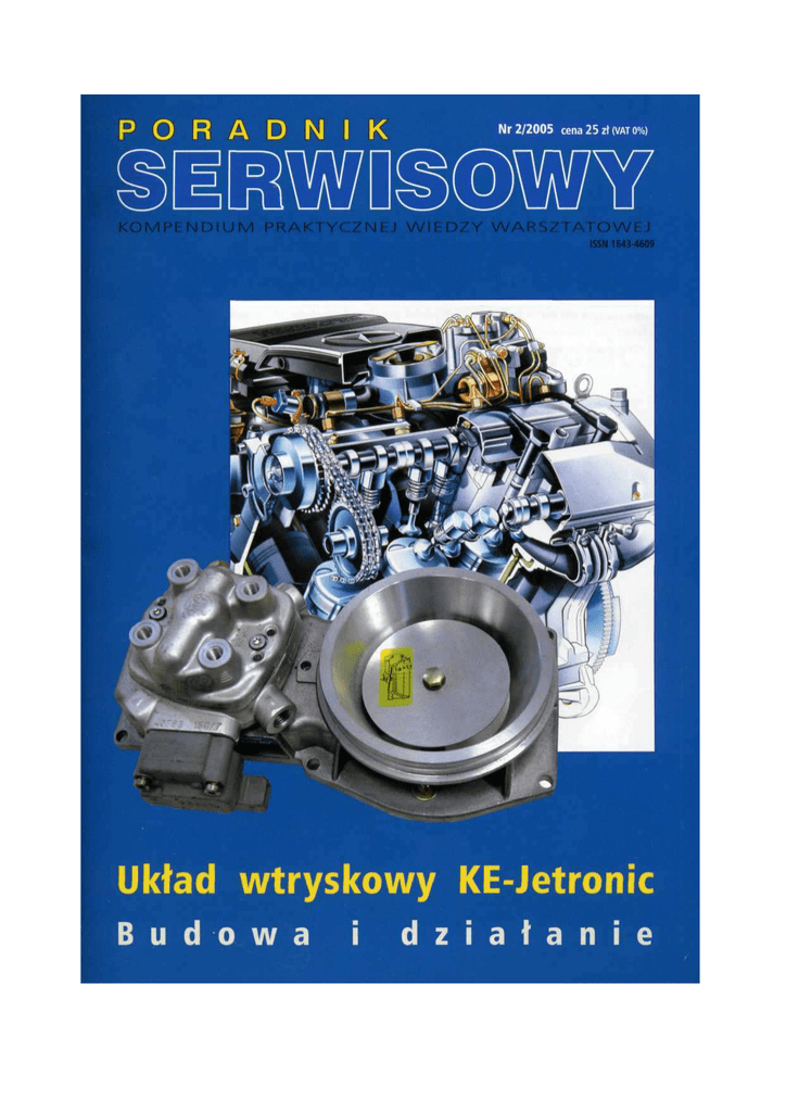 Od redakcji W tym numerze „Poradnika Serwisowego" opisano budowę i zasadę działania podstawowych elementów układu wtryskowego KE-Jetronic, na przykładzie układu montowanego w samochodach Mercedes-Benz. Przedstawiony opis działania układu, dane techniczne oraz schematy układów elektrycznych mają wyłącznie charakter poglądowy. Układ KE-Jetronic został po raz pierwszy zamontowany w 1982 r. w modelu Mercedes-Benz 190E. W 1984 r. pojawił się już jako trzecia generacja w modelu 124. Układ KE-Jetronic można spotkać również w samochodach Audi, Ford i VW. Procedury diagnostyczne układu KE-Jetronic, szczegółowe dane techniczne, schematy układów elektrycznych dla samochodów Mercedes-Benz 201 i 190 z silnikami 102 zostaną podane w kolejnym „Poradniku Serwisowym". W poradniku wykorzystano materiały ilustracyjne z firmy Mercedes-Benz. Zdjęcia A. Glanda. Układ wtryskowy KE-Jetronic Budowa i działanie Wydawnictwo INSTALATOR POLSKI REKLAMA PREZES mgr Władysław Polesiński REDAKTOR NACZELNY mgr inż. Krzysztof Trzeciak e-mail: [email protected] SEKRETARZ REDAKCJI mgr inż. Elżbieta Woźniak e-mail: [email protected] ADRES REDAKCJI ul. Koniczynowa 11, 03-612 Warszawa tel. 678-64-90, fax 679-71-01 www.automotoserwis.com.pl Dyrektor ds. Marketingu i Reklamy Grażyna Kalużyńska Specjalista ds. Reklamy Magdalena Dyszy tel. 678-37-33 e-mail: [email protected] PRENUMERATA: tel. 678-38-05 GRAFIKA I ŁAMANIE: MAT-Andrzej Glanda DRUK: TAURUS, Kazimierów 13 k. Halinowa Spis treści 1. Wprowadzenie ....................................................................................................... 5 2. Obwód zasilania paliwem...................................................................................... 9 3. 4. 2.1 Działanie obwodu zasilania paliwem................................................................... 9 2.2 Zbiornik paliwa .............................................................................................. 10 2.3 Układ odprowadzania par paliwa .................................................................... 11 2.4 Pompa paliwa ................................................................................................ 13 2.5 Filtr paliwa ....................................................................................................... 15 2.6 Akumulator paliwa........................................................................................... 15 2.7 Przeponowy regulator ciśnienia......................................................................... 15 Układ przygotowania mieszanki ....................................................................... 17 3.1 Przepływomierz powietrza .............................................................................. 17 3.2 Rozdzielacz paliwa............................................................................................ 19 3.3 Mechaniczna regulacja podstawowego składu mieszanki.................................... 20 3.4 Elektroniczna regulacja składu mieszanki .......................................................... 21 3.5 Wtryskiwacze................................................................................................... 23 Elementy elektryczne układu KE-Jetronic .......................................................... 25 4.1 Przekaźnik przepięciowy ................................................................................... 25 4.2 Sterownik układu KE-Jetronic ......................................................................... 25 4.3 Czujniki temperatury ........................................................................................ 27 4.4 Czujnik ilości zasysanego powietrza ............................................................... 28 4.5 Czujnik położenia przepustnicy ........................................................................ 30 4.6 Mikrowyłącznik .............................................................................................. 30 5. Działanie układu KE w różnych warunkach pracy silnika ............................. 31 6. Dodatkowe elementy układu KE-Jetronic .......................................................... 33 6.1 Regulator biegu jałowego silnika ...................................................................... 33 6.2 Wtryskiwacz rozruchowy ............................................................................... 39 6.3 Włącznik kick-down ......................................................................................... 41 7. Diagnostyka silnika................................................................................................ 42 8. Układ zapłonowy 9. ................................................................................................ 43 8.1 Zapłon tranzystorowy TSZ................................................................................. 43 8.2 Zapłon elektroniczny EZL.................................................................................. 44 Schematy elektryczne .......................................................................................... 48 1. Wprowadzenie U kład wtryskowy KE-Jetronic powstał w wyMarka niku wyposażenia mechaniczno-hydraulicznego układu wtryskowego K-Jetronic w elektroniczne urządzenie sterujące wraz z niezbędnymi elementami dodatkowymi. Układ jest przystosowany do współpracy z sondą lambda oraz katalizatorem. Skrót KE wprowadzony przez producenta układu, firmę Bosch, oznacza: K (Kontinuierliche Kraftstoffeinspritzung) - ciągły wtrysk paliwa E (Elektronisch gesteuerte Gemischanpassung) elektroniczne sterowanie składem mieszanki Układ KE-Jetronic został po raz pierwszy za montowany w 1982 r. w modelu Mercedes-Benz 190E. W 1984 r. pojawił się już jako trzecia genera cja w modelu Mercedes-Benz 124. Zestawienie najbardziej popularnych samochodów wyposażonych w układ KE-Jetronic zawiera tabela obok. Podstawowa zasada układu KE-Jetronic zosta