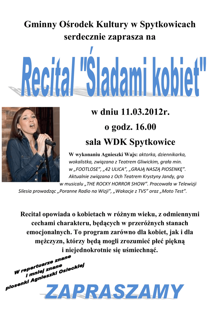 Gminny Ośrodek Kultury w Spytkowicach serdecznie zaprasza na w dniu 11.03.2012r. o godz. 16.00 sala WDK Spytkowice W wykonaniu Agnieszki Wajs: aktorka, dziennikarka, wokalistka, związana z Teatrem Gliwickim, grała min. w „FOOTLOSE”, „42 ULICA”, „GRAJĄ NASZĄ PIOSENKĘ”. Aktualnie związana z Och Teatrem Krystyny Jandy, gra w musicalu „THE ROCKY HORROR SHOW”. Pracowała w Telewizji Silesia prowadząc „Poranne Radio na Wizji”, „Wakacje z TVS” oraz „Moto Test”. Recital opowiada o kobietach w różnym wieku, z odmiennymi cechami charakteru, będących w przeróżnych stanach emocjonalnych. To program zarówno dla kobiet, jak i dla mężczyzn, którzy będą mogli zrozumieć płeć piękną i niejednokrotnie się uśmiechnąć.