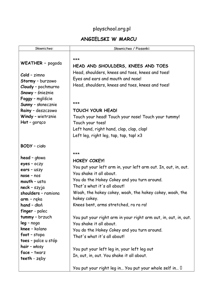 playschool.org.pl ANGIELSKI W MARCU Słownictwo: WEATHER – pogoda Cold – zimno Stormy – burzowo Cloudy – pochmurno Snowy – śnieżnie Foggy – mgliście Sunny – słonecznie Rainy – deszczowo Windy – wietrznie Hot – gorąco Słownictwo / Piosenki: *** HEAD AND SHOULDERS, KNEES AND TOES Head, shoulders, knees and toes, knees and toes! Eyes and ears and mouth and nose! Head, shoulders, knees and toes, knees and toes! *** TOUCH YOUR HEAD! Touch your head! Touch your nose! Touch your tummy! Touch your toes! Left hand, right hand, clap, clap, clap! Left leg, right leg, tap, tap, tap! x3 BODY – ciało head – głowa eyes – oczy ears – uszy nose – nos mouth – usta neck – szyja shoulders – ramiona arm – ręka hand – dłoń finger - palec tummy – brzuch leg – noga knee – kolano foot – stopa toes – palce u stóp hair – włosy face – twarz teeth - zęby *** HOKEY COKEY! You put your left arm in, your left arm out. In, out, in, out. You shake it all about. You do the Hokey Cokey and you turn around. That's what it's all about! Woah, the hokey cokey, woah, the hokey cokey, woah, the hokey cokey. Knees bent, arms stretched, ra ra ra! You put your right arm in your right arm out, in, out, in, out. You shake it all about. You do the Hokey Cokey and you turn around. That's what it's all about! You put your left leg in, your left leg out In, out, in, out. You shake it all about. You put your right leg in… You put your whole self in…