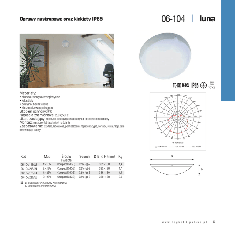 luna 06-104 Oprawy nastropowe oraz kinkiety IP65 TC-DE TC-DEL IP65 230 V 50 Hz F Materiały: • obudowa: tworzywo termoplastyczne • kolor: biały • odbłyśnik: blacha stalowa • klosz: opalizowany poliwęglan Stopień ochrony: IP65 Napięcie znamionowe: 230 V/50 Hz Układ zasilający: statecznik indukcyjny niskostratny lub statecznik elektroniczny Montaż: na stropie lub jako kinkiet na ścianie Zastosowanie: szpitale, laboratoria, pomieszczenia reprezentacyjne, kortarze, restauracje, sale konferencyje, toalety 0 40 80 120 160 06-104/218/C [ l ] cd/1 000 lm Kod Moc Źródło światła Trzonek Ø B × H (mm) Kg 1,4 06-104/118/ 1×18W Compact D (D/E) G24d(q)-2 335×130 06-104/218/ 2×18W Compact D (D/E) G24d(q)-2 335×130 1,7 06-104/126/ 1×26W Compact D (D/E) G24d(q)-3 335×130 1,5 06-104/226/ 2×26W Compact D (D/E) G24d(q)-3 335×130 2,0 C0 – C180 C90 – C270 B H - E (statecznik indukcyjny niskostratny) - C (statecznik elektroniczny) 83
