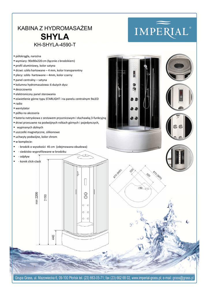 KABINA Z HYDROMASAŻEM SHYLA KH-SHYLA-4590-T półokrągła, narożna wymiary: 90x90x220 cm (łącznie z brodzikiem) profil aluminiowy, kolor satyna drzwi: szkło hartowane – 4 mm, kolor transparentny plecy: szkło hartowane – 4mm, kolor czarny panel centralny – satyna kolumna hydromasażowa: 6 dużych dysz deszczownia elektroniczny panel sterowania oświetlenie górne typu STARLIGHT i na panelu centralnym 9xLED radio wentylator półka na akcesoria bateria natryskowa z zestawem prysznicowym i słuchawką 3-funkcyjną drzwi przesuwne na podwójnych rolkach górnych i pojedynczych, wypinanych dolnych uszczelki magnetyczne, silikonowe uchwyty podwójne, kolor chrom w komplecie: - brodzik o wysokości 45 cm (zdejmowana obudowa) - siedzisko wyprofilowane w brodziku - odpływ - korek click-clack