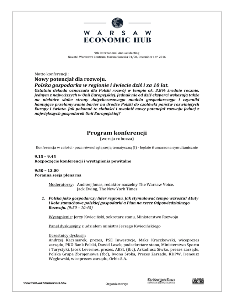 9th International Annual Meeting Novotel Warszawa Centrum, Marszałkowska 94/98, December 16th 2016 Motto konferencji: Nowy potencjał dla rozwoju. Polska gospodarka w regionie i świecie dziś i za 10 lat. Ostatnia dekada oznaczała dla Polski rozwój w tempie ok. 3,8% średnio rocznie, jednym z najwyższych w Unii Europejskiej. Jednak nie od dziś eksperci wskazują także na niektóre słabe strony dotychczasowego modelu gospodarczego i czynniki hamujące przełamywanie barier na drodze Polski do czołówki państw rozwiniętych Europy i świata. Jak pokonać te słabości i uwolnić nowy potencjał rozwoju jednej z największych gospodarek Unii Europejskiej? Program konferencji (wersja robocza) Konferencja w całości -poza równoległą sesją tematyczną (I) - będzie tłumaczona symultanicznie 9.15 – 9.45 Rozpoczęcie konferencji i wystąpienia powitalne 9:50 – 13.00 Poranna sesja plenarna Moderatorzy: Andrzej Jonas, redaktor naczelny The Warsaw Voice, Jack Ewing, The New York Times 1. Polska jako gospodarczy lider regionu. Jak stymulować tempo wzrostu? Atuty i koła zamachowe polskiej gospodarki a Plan na rzecz Odpowiedzialnego Rozwoju. (9:50 – 10:45) Wystąpienie: Jerzy Kwieciński, sekretarz stanu, Ministerstwo Rozwoju Panel dyskusyjny z udziałem ministra Jerzego Kwiecińskiego Uczestnicy dyskusji: Andrzej Kaczmarek, prezes, PSE Inwestycje, Maks Kraczkowski, wiceprezes zarządu, PKO Bank Polski, Dawid Lasek, podsekretarz stanu, Ministerstwo Sportu i Turystyki, Jacek Levernes, prezes, ABSL (tbc), Arkadiusz Siwko, prezes zarządu, Polska Grupa Zbrojeniowa (tbc), Iwona Sroka, Prezes Zarządu, KDPW, Ireneusz Węgłowski, wiceprezes zarządu, Orbis S.A. Organizatorzy: 9th International Annual Meeting Novotel Warszawa Centrum, Marszałkowska 94/98, December 16th 2016 2. Czas na przyśpieszenie międzynarodowej ekspansji i innowacyjności polskich przedsiębiorstw. W jakich branżach możemy relatywnie szybko uzyskać silną pozycję? Na jakie wsparcie można liczyć ze strony struktur rządowych oraz Polskiego Funduszu Rozwoju? (10:50 – 11:50) Wystąpienie: Paweł Borys, prezes Polskiego Funduszu Rozwoju. Panel dyskusyjny z udziałem prezesa Pawła Borysa Uczestnicy dyskusji: Marek Czerski, prezes zarządu, KUKE, Paweł Nierada, pierwszy wiceprezes, BGK, Sławomir Panasiuk, wiceprezes zarządu, KDPW, Tomasz Pisula, prezes, PAIiIZ / Invest in Poland, Krzysztof Soszyński, wiceprezes zarządu, Inter Cars (tbc), Karol Zarajczyk, prezes zarządu, URSUS. Wystąpienie: Gilles Clavie, prezes zarządu, Orbis S.A. 11:50 – 12:05 Przerwa kawowa 3. Bezpieczeństwo ekonomiczne Polski i regionu w kontekście wielkich przemian w Europie i świecie. (12:10 – 13:00) Wystąpienie: Guenter Verheugen Panel dyskusyjny z udziałem Guentera Verheugena Uczestnicy dyskusji: Posłowie PE: Ryszard Czarnecki, Janusz Lewandowski (tbc), Bogusław Liberadzki; Wiesław Rozłucki, pierwszy prezes Giełdy Papierów Wartościowych w Warszawie, Paweł Wojciechowski, były minister finansów. 13:00 – 13:35 Lunch Organizatorzy: 9th International Annual Meeting Novotel Warszawa Centrum, Marszałkowska 94/98, December 16th 2016 13.40 – 15.15 Równoległe sesje tematyczne (I) 1. Bezpieczeństwo energetyczne Polski: Dzień bez prądu. (13:40 – 14:25) O ile w bliższej lub dalszej przyszłości grozi nam tzw. Black-out, to jego przyczyną będzie najprawdopodobniej nie deficyt energii, lecz brak wydolności przestarzałej i zaniedbywanej od dziesięcioleci infrastruktury energetycznej. Czy i w jakiej skali grozi nam taki kryzys? W jaki sposób może przełożyć się na życie obywateli, sytuację przedsiębiorstw, działanie całej gospodarki, wydolność aparatu państwa i wszystko inne, o czym jesteśmy w stanie pomyśleć? Czy i jak można go jeszcze uniknąć? Na te tematy dyskusję podejmą przedstawiciele branży, świata nauki, przedsiębiorczości, administracji i po prostu – zwykłych konsumentów. Gospodarz panelu: PSE Inwestycje S.A. Moderator, Andrzej Jonas redaktor naczelny The Warsaw Voice Uczestnicy dyskusji: Andrzej Kaczmarek, prezes, PSE Inwestycje, prof. dr hab. inż. Władysław Mielczarski, Instytut Elektroenergetyki Politechniki Łódzkiej, Zakład Sieci Elektroenergetycznych (tbc), Konrad Pokutycki, prezes, BSH Sprzęt Gospodarstwa Domowego. 2. Narzędzia rozwoju gospodarczego w dyspozycji samorządów i administracji lokalnej (14:30 – 15:15) Dobiegają końca prace nad rządowym programem strategii rozwoju kraju. Jego główne założenia są znane od wielu miesięcy. Jakie narzędzia, umożliwiające pobudzanie lokalnych gospodarek są już lub wkrótce będą w dyspozycji samorządowców i władz regionalnych? Gospodarz panelu: PWC Moderator: Dionizy Smoleń, dyrektor, PWC Uczestnicy dyskusji: Tomasz Jakubiec, dyrektor Biura Strategii Miasta, Urząd Miasta Łodzi, Maciej Lachowski, Radca Ministra, Ministerstwo Rozwoju, Grzegorz Wolff, zastępca dyrektora, biuro rozwoju gospodarczego, Urząd m.st. Warszawy, Wojciech Rosicki, wiceprezydent Łodzi. (sesja nie tłumaczona symultanicznie) Organizatorzy: 9th International Annual Meeting Novotel Warszawa Centrum, Marszałkowska 94/98, December 16th 2016 13.40 – 15.15 Równoległe sesje tematyczne (II) Moderator: Juliusz Kłosowski, The Warsaw Voice, Poland Meetings Destination 1. Przemysł spotkań jako czarny koń polskiej gospodarki czyli jak zdynamizować PKB? (13:40 – 14:25) Słowo wstępne: Prof. Jadwiga Berbeka Uczestnicy dyskusji: Żaneta Berus, prezes zarządu, EXPO XXI Warszawa, Monika Białkowska, dyrektor, Warszawska Organizacja Turystyczna, dr Krzysztof Celuch, Poland Convention Bureau, Luc Gesvret, dyrektor, Grupa Hotelowa ORBIS, Dawid Lasek, podsekretarz stanu, Ministerstwo Sportu i Turystyki, Tomasz Szczęsny, wiceprezes, eTravel S.A. 2. Infrastruktura i centra kongresowo-konferencyjne a rozwój gospodarki miejskiej. Przykłady, wyzwania, potrzeby. (14:30 – 15:15) Słowo wstępne: Mark Krawczyński (Spostrzeżeni
