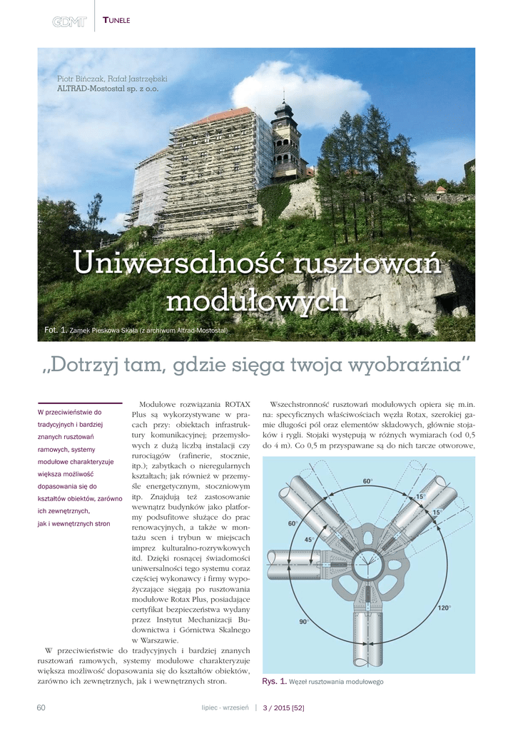 TUNELE Piotr Bińczak, Rafał Jastrzębski ALTRAD-Mostostal sp. z o.o. Uniwersalność rusztowań modułowych Fot. 1. Zamek Pieskowa Skała (z archiwum Altrad-Mostostal) „Dotrzyj tam, gdzie sięga twoja wyobraźnia” Wszechstronność rusztowań modułowych opiera się m.in. na: specyficznych właściwościach węzła Rotax, szerokiej gamie długości pól oraz elementów składowych, głównie stojaków i rygli. Stojaki występują w różnych wymiarach (od 0,5 do 4 m). Co 0,5 m przyspawane są do nich tarcze otworowe, Modułowe rozwiązania ROTAX Plus są wykorzystywane w pratradycyjnych i bardziej cach przy: obiektach infrastruktury komunikacyjnej; przemysłoznanych rusztowań wych z dużą liczbą instalacji czy ramowych, systemy rurociągów (rafinerie, stocznie, modułowe charakteryzuje itp.); zabytkach o nieregularnych większa możliwość kształtach; jak również w przemydopasowania się do śle energetycznym, stoczniowym kształtów obiektów, zarówno itp. Znajdują też zastosowanie wewnątrz budynków jako platforich zewnętrznych, my podsufitowe służące do prac jak i wewnętrznych stron renowacyjnych, a także w montażu scen i trybun w miejscach imprez kulturalno-rozrywkowych itd. Dzięki rosnącej świadomości uniwersalności tego systemu coraz częściej wykonawcy i firmy wypożyczające sięgają po rusztowania modułowe Rotax Plus, posiadające certyfikat bezpieczeństwa wydany przez Instytut Mechanizacji Budownictwa i Górnictwa Skalnego w Warszawie. W przeciwieństwie do tradycyjnych i bardziej znanych rusztowań ramowych, systemy modułowe charakteryzuje większa możliwość dopasowania się do kształtów obiektów, zarówno ich zewnętrznych, jak i wewnętrznych stron. Rys. 1. Węzeł rusztowania modułowego 60 3 / 2015 [52] W przeciwieństwie do lipiec - wrzesień TUNELE geoinżynieria drogi mosty tunele co oznacza, że co 50 cm może Fot. 3. Fot. 4. występować węzeł mocujący Rotax służący do instalowania dźwigarów, pomostów, rygli, itp. Dzięki złączu tarczowemu (rys. 1), czyli przestawnej tarczy otworowej, istnieje możliwość tworzenia dodatkowego węzła na dowolnej wysokości stojaka. Węzły charakteryzuje duża wytrzymałość materiałowa oraz konstrukcyjna, co pozwala na mocowanie nawet do 8 elementów, tj. stojaków, rygli oraz stężeń pionowych, dzięki czemu można rozbudować system w różnych kierunkach i płaszczyznach. Standardowe stojaki zostały wyposażone w tzw. łączniki pilotujące, stanowiące bazę do montażu kolejnych elementów, rozbudowującego tym Fot. 3. Uniwersytet im. M.W. Łomonosowa w Moskwie samym cały moduł. Z kolei sto- Fot. 4. Ciśnieniowy zbiornik kulisty w Zakładach Azotowych Puławy jaki posiadające łącznik pilotuKolejnym aspektem elastyczności montażu tych systemów jący przykręcany są wykorzystywane do montażu rusztowań jest możliwość budowania dowolnych platform z wykorzystatzw. podwieszanych. niem dźwigarów kratowych lub typowych rygli. Dzięki takiemu systemowi mocowania można w łatwy spoCo ciekawe, dzięki np. podstawkom regulowanym, złąsób tworzyć wsporniki, wypusty czy dojścia, aby sprawnie omiczom, pomostom czy dźwigarom ROTAX Plus pozostaje komnąć różnego rodzaju przeszkody wynikające z kształtów archipatybilny z rusztowaniem ramowym. Za przykład może posłutektury obiektów, na których montowane są rusztowania. OD 20 LATȂ6Ζă$12:2&=(612ĜÈ67$%Ζ/12ĜÈ $/75$'Ȃ0RVWRVWDOGRVWDUF]DP\UR]ZLÇ]DĆQLHSUREOHPµZ ALTRAD-MostostalWRZLHOROHWQLHGRĝZLDGF]HQLHZEUDQľ\UXV]WRZDĆ Oferta ALTRAD-Mostostal obejmuje: L V]DOXQNµZ WR VLĄD PDUNL NWµUD VWDZLD ȴUPÛ Z F]RĄµZFH SROVNLFK RUSZTOWANIA: SURGXFHQWµZZ3ROVFHL(XURSLH –5DPRZH0RVWRVWDO3OXV 1DU\QNXUXV]WRZDĆZ3ROVFHG]LDĄDP\RGURNX2GWHJRF]DVX –3U]HMH]GQH03 ZSURZDG]LOLĝP\GRQDV]HMRIHUW\QRZHSURGXNW\NWµUHVÇZ\QLNLHP –0RGXĄRZH527$;3OXV ]GRE\WHJRGRĝZLDGF]HQLDQDMQRZRF]HĝQLHMV]HJRVSU]ÛWXWHFKQLF]QH–3OHWWDF6/ JRRUD]ĝZLHWQHJR]DSOHF]DQDXNRZHJR –ΖQQHSURGXNW\VFHQ\WU\EXQ\ &]ĄRQNRZVWZR Z *UXSLH $/75$' RZRFXMH Z\PLDQÇ GRĝZLDGF]HĆSZALUNKI: DW\PVDP\PZGURľHQLHPQRZ\FKUR]ZLÇ]DĆWHFKQLF]Q\FKLXQLȴND–ĜFLHQQH0Ζ'Ζ%[60Ζ'Ζ%R[V]DOXQHN FMÇ Z\UREµZ 1RZH ]DVWRVRZDQLD WHFKQRORJLF]QH VSUDZG]DMÇ VLÛ V]\EXZLQGRZHJR Z 3ROVFH MDN UµZQLHľ ] SRZRG]HQLHP VSRW\NDMÇ VLÛ ] ]DLQWHUHVRZD–6WURSRZHVWURSWUDG\F\MQ\$/8VWURS QLHP]DJUDQLF]Q\FKNOLHQWµZ –:LHľHSRGSRURZH 3URGXNFMDZ\SRVDľRQDZVSHFMDOLVW\F]QHURERW\VSDZDOQLF]HSR]ZDAKCESORIA BUDOWLANE: OD QD RVLÇJQLÛFLH Z\ľV]HM Z\GDMQRĝFL QLľ SU]\ WUDG\F\MQ\P VSDZDQLX –]V\S\EXGRZODQH PDQXDOQ\P3RPRVW\VÇSHUIRURZDQHLSURȴORZDQH]WDĝP\VWDORZHM –VLDWNLLSODQGHNL ZMHGQHMFLÇJĄHMOLQLLSURGXNF\MQHM:\VSHFMDOL]RZDQLHNVSHUFLWHFKQR–ZLQG\LZFLÇJDUNL ORJLF]QLLSURGXNF\MQLMDNUµZQLHľSR]RVWDĄDNDGUDWRWDMHPQLFDVXNFH–NR]Ą\EXGRZODQH VX QDV]HM ȴUP\ SRGREQLH MDN VSUDZQLH G]LDĄDMÇF\ ']LDĄ +DQGORZ\ LVLHÉSDUWQHUµZ ZZZDOWUDGPRVWRVWDOSO 1DV]HSURGXNW\SRVLDGDMÇFHUW\ȴNDWEH]SLHF]HĆVWZDZ\GDQ\SU]H] ΖQVW\WXW0HFKDQL]DFMLL*µUQLFWZD6NDOQHJRZ:DUV]DZLH:URNX QDV]HMȴUPLH]RVWDĄQDGDQ\FHUW\ȴNDWΖ62 lipiec - wrzesień 3 / 2015 [52] WHO WHO ID[ VHNUHWDULDW#DOWUDGPRVWRVWDOSO 61 TUNELE Rys. 2. Rys. 3. Dowolność w montażu poszczególnych elementów systemu ROTAX Plus, skutkująca budową nietypowych konstrukcji, pociąga za sobą konieczność wykonywania indywidualnych obliczeń statycznych (rys. 3). Z uwagi na nieograniczoną ilość konfiguracji ustawień rusztowań modułowych, każde rozwiązanie należy rozpatrywać z osobna. Nie można też zapominać o bezwzględnym sprawdzeniu każdej konstrukcji pod kątem bezpieczeństwa jej użytkowników. Niewątpliwą zaletą rusztowań modułowych jest prostota montażu, dzięki czemu nie ma konieczności stosowania specjalistycznego, skomplikowanego sprzętu. W zasadzie wystarczą jedynie poziomica i młotek, służący do „zabijania klina” kotwiącego rygiel lub stężenie do krążka węzłowego. ALTRAD-Mostostal szczegółowo określa 