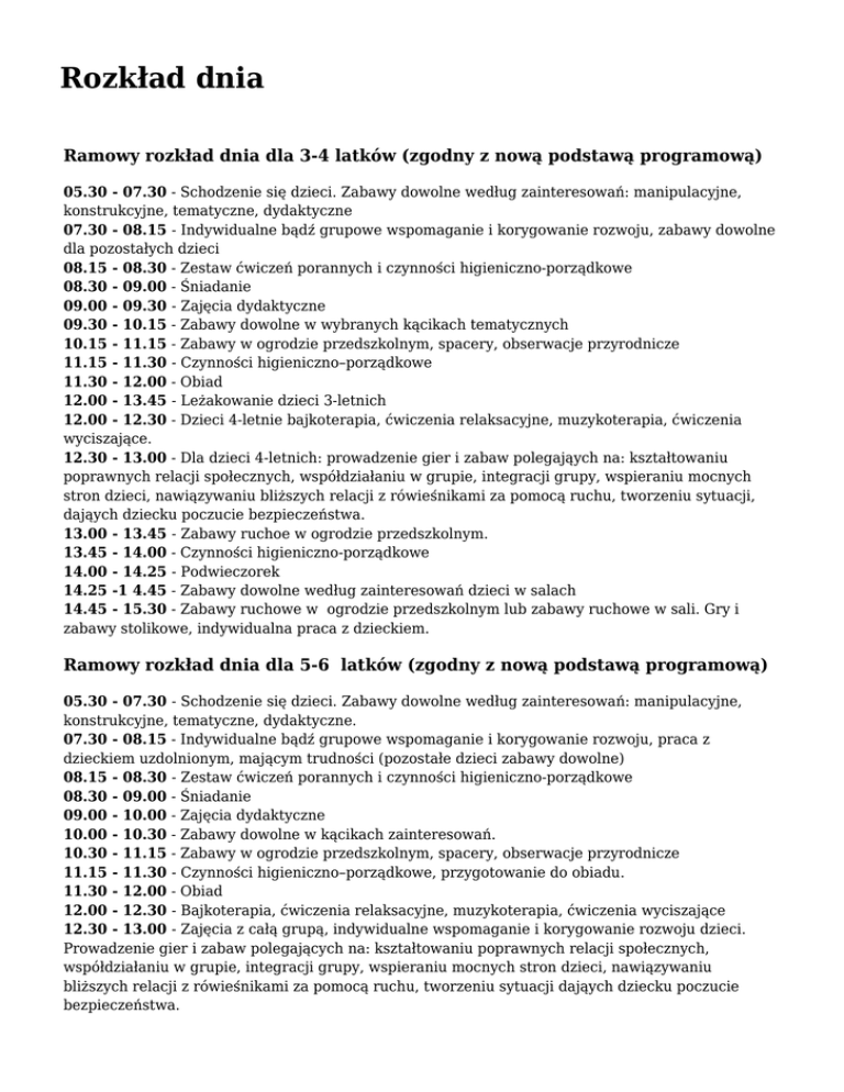 Rozkład dnia Ramowy rozkład dnia dla 3-4 latków (zgodny z nową podstawą programową) 05.30 - 07.30 - Schodzenie się dzieci. Zabawy dowolne według zainteresowań: manipulacyjne, konstrukcyjne, tematyczne, dydaktyczne 07.30 - 08.15 - Indywidualne bądź grupowe wspomaganie i korygowanie rozwoju, zabawy dowolne dla pozostałych dzieci 08.15 - 08.30 - Zestaw ćwiczeń porannych i czynności higieniczno-porządkowe 08.30 - 09.00 - Śniadanie 09.00 - 09.30 - Zajęcia dydaktyczne 09.30 - 10.15 - Zabawy dowolne w wybranych kącikach tematycznych 10.15 - 11.15 - Zabawy w ogrodzie przedszkolnym, spacery, obserwacje przyrodnicze 11.15 - 11.30 - Czynności higieniczno–porządkowe 11.30 - 12.00 - Obiad 12.00 - 13.45 - Leżakowanie dzieci 3-letnich 12.00 - 12.30 - Dzieci 4-letnie bajkoterapia, ćwiczenia relaksacyjne, muzykoterapia, ćwiczenia wyciszające. 12.30 - 13.00 - Dla dzieci 4-letnich: prowadzenie gier i zabaw polegająych na: kształtowaniu poprawnych relacji społecznych, współdziałaniu w grupie, integracji grupy, wspieraniu mocnych stron dzieci, nawiązywaniu bliższych relacji z rówieśnikami za pomocą ruchu, tworzeniu sytuacji, dająych dziecku poczucie bezpieczeństwa. 13.00 - 13.45 - Zabawy ruchoe w ogrodzie przedszkolnym. 13.45 - 14.00 - Czynności higieniczno-porządkowe 14.00 - 14.25 - Podwieczorek 14.25 -1 4.45 - Zabawy dowolne według zainteresowań dzieci w salach 14.45 - 15.30 - Zabawy ruchowe w ogrodzie przedszkolnym lub zabawy ruchowe w sali. Gry i zabawy stolikowe, indywidualna praca z dzieckiem. Ramowy rozkład dnia dla 5-6 latków (zgodny z nową podstawą programową) 05.30 - 07.30 - Schodzenie się dzieci. Zabawy dowolne według zainteresowań: manipulacyjne, konstrukcyjne, tematyczne, dydaktyczne. 07.30 - 08.15 - Indywidualne bądź grupowe wspomaganie i korygowanie rozwoju, praca z dzieckiem uzdolnionym, mającym trudności (pozostałe dzieci zabawy dowolne) 08.15 - 08.30 - Zestaw ćwiczeń porannych i czynności higieniczno-porządkowe 08.30 - 09.00 - Śniadanie 09.00 - 10.00 - Zajęcia dydaktyczne 10.00 - 10.30 - Zabawy dowolne w kącikach zainteresowań. 10.30 - 11.15 - Zabawy w ogrodzie przedszkolnym, spacery, obserwacje przyrodnicze 11.15 - 11.30 - Czynności higieniczno–porządkowe, przygotowanie do obiadu. 11.30 - 12.00 - Obiad 12.00 - 12.30 - Bajkoterapia, ćwiczenia relaksacyjne, muzykoterapia, ćwiczenia wyciszające 12.30 - 13.00 - Zajęcia z całą grupą, indywidualne wspomaganie i korygowanie rozwoju dzieci. Prowadzenie gier i zabaw polegających na: kształtowaniu poprawnych relacji społecznych, współdziałaniu w grupie, integracji grupy, wspieraniu mocnych stron dzieci, nawiązywaniu bliższych relacji z rówieśnikami za pomocą ruchu, tworzeniu sytuacji dająych dziecku poczucie bezpieczeństwa. 13.00 - 13.45 - Zabawy ruchowe w ogrodzie przedszkolnym. 13.45 - 14.00 - Czynności higieniczno-porządkowe 14.00 - 14.25 - Podwieczorek 14.25 - 15.30 - Praca przy stolikach, układanie puzzli, gry i zabawy stolikowe, indywidualna praca z dzieckiem. 15.30 - 16.30 - Zabawy dowolne według zainteresowań dzieci: manipulacyjne, konstrukcyjne, tematyczne, dydaktyczne i inne. Rozchodzenie się dzieci. Funkcja opiekuńcza, wychowawcza i kształcąca w zakresie Podstawy Programowej Wychowania Przedszkolnego realizowana jest w godzinach od 7.30 do 12.30.