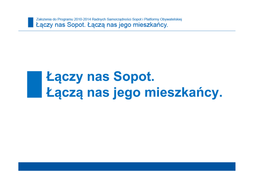 Łączy nas Sopot. Łączą nas jego mieszkańcy. • Rewitalizacja Sopotu • Sprawna komunikacja dla mieszkańców • Najlepsza edukacja na każdym poziomie • Miasto dobrej kultury • Zrównoważony rozwój - zdrowe przyjazne miasto • Sopot dla młodych i starszych Rewitalizacja Sopotu • zabytkowa zabudowa (elewacje, nowy wizerunek Al.Niepodległości, oświetlenie Sopotu, przywracanie witraży) • program sopockie podwórka • parki, skwery, kreatywne place zabaw i tereny rekreacyjne • chodniki i place • Hipodrom Lepsza komunikacja dla mieszkańców • remonty ulic • budowa dodatkowych parkingów • nowe ścieżki rowerowe, parkingi dla rowerów, system park and ride • budowa rond na Brodwinie i Kamiennym Potoku • Droga Zielona • Łokietka, Bitwy pod Płowcami • prace nad tunelem tranzytowym • Tristar, bus na lotnisko, nocna komunikacja • ekologiczne busy napędzane gazem Najlepsza edukacja na każdym poziomie • stałe poszerzanie oferty edukacyjnej i podnoszenie jakości kształcenia (rytmika i korekcja w przedszkolach-języki, matematyka, klasy specjalistyczne, zainteresowania: kultura, sport-żeglarstwo) • ogólnodostępna, nowoczesna baza edukacyjna i infrastruktura sportowa • rozwój Uniwersytetu III Wieku • współpraca z wyższymi uczelniami na wszystkich poziomach kształcenia • programy społeczne/edukacyjne/projekty międzynarodowe dla różnych grup mieszkańców • edukacja obywatelska – rozwój wolontariatu, wspieranie organizacji pozarządowych Miasto dobrej kultury • • • • • • młodzi twórcy w Sopocie markowe wydarzenia kulturalne o charakterze ponadlokalnym edukacja artystyczna (dzieci, młodzież, seniorzy) współpraca z wyższymi uczelniami artystycznymi sztuka w przestrzeni miasta instytucje kultury – europejski wymiar – otwarte dla mieszkańców Zrównoważony rozwój - zdrowe przyjazne miasto • ekologia (czystość ulic, bezemisyjny Sopot - ekologiczne i tanie ogrzewanie, czysta zatoka i estetyczna plaża, retencja, las, dobra tania woda) • programy prozdrowotne • Dom Seniora – centrum zdrowia starszych, miejsce spotkań, centrum rekreacji i rehabilitacji; poradnia geriatryczna • organizacja oddziału położniczego • bezpieczeństwo – monitoring, wzmożone patrole piesze • tereny rekreacyjne dla mieszkańców – obiekty sportowe, tereny rekreacyjne, błonia i bezpieczne place zabaw Sopot dla młodych i starszych • rozwój przedsiębiorczości, nowe miejsca pracy (turystyka, ośrodek konferencyjny, biura, wyższe uczelnie, prezydencja UE, Mistrzostwa Europy i Świata) • Karta Sopocianina • Sopot obywatelski – konsultacje społeczne, organizacje pozarządowe, spotkania, internetowe forum miejskie, portal dla seniorów • miasto przyjazne dla seniorów – kompleksowy system wsparcia i aktywizacji osób starszych (usługi opiekuńcze, domy seniora – także rodzinne,, Sopot bez barier, aktywizacja w życiu społecznym i kulturalnym miasta Sopot dla młodych i starszych • budownictwo komunalne w różnych formach • bezpieczne, edukacyjne place zabaw • szeroka oferta zajęć dodatkowych dla dzieci i całych rodzin, zarówno propozycje kulturalne jak i rekreacyjno – sportowe, w oparciu o doskonałą infrastrukturę miejską; • edukacja przez kulturę, sport; upowszechnienie wolnotariatu • zdrowi i aktywni sopocianie; upowszechnienie prozdrowotnego modelu życia