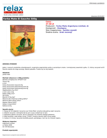 Informacje o produkcie Utworzono 03-03-2017 Yerba Mate El Gaucho 500g Cena : 27.50 zł Producent : Yerba Mate Argentyna Limited, Ar Dostępność : Dostępny Stan magazynowy : bardzo wysoki Średnia ocena : brak recenzji ZDROWA ŻYWNOŚĆ Jeden z naszych produktów sztandarowych: oryginalna argentyńska yerba o wyrazistym smaku i zmniejszonej zawartości pyłku. Ci, którzy zaczynali od El Gaucho zawsze do niego wracają. Dobrze pobudza. Trudno się na niej zawieść. Składniki: yerba mate Wartość odżywcza w 100g produktu: Wartość energetyczna 197kJ/47 kcal Tłuszcz 0g w tym kwasy tłuszczowe nasycone 0g kwasy tłuszczowe jednonienasycone 0g kwasy tłuszczowe wielonienasycone 0g Węglowodany 9,g (3%)* w tym cukry 2,4g Białko 0,89g (1%)* Sól 0,02g Błonnik 0,72g (2g)* Witamina B1 (Tiamina) 0,78mg (65%)* Witamina B6 0,44mg (34%)* Magnez 28mg (10%)* Żelazo 1,5mg (10%)* Kofeina 0,37g Sposób użycia: 1. Nasyp do 3/4 objętości naczynia susz Yerba Mate i przykryj ręką górną część naczynia. 2. Odwróć naczynie i wstrząśnij tak by pył z suszu znalazł się na ręce. 3. Delikatnie odwróć naczynie, tak by zawartość nie zmieniła swojego położenia. 4. Włóż bombillę i zalej wodą o temp. 70-80°C (można również zalać zimną wodą) 5. Czekaj 2-3 minuty i pij przez bombillę powoli, pamiętając o tym by nie mieszać naparu. Wyłączny Importer: Argentyna Limited ul. Rolna 165B 02-729 Warszawa Produkt argentyński. Wygenerowano w programie www.oscGold.com Opakowanie: 500g
