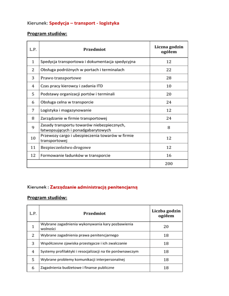 Kierunek: Spedycja – transport - logistyka Program studiów: L.P. Przedmiot Liczna godzin ogółem 1 Spedycja transportowa i dokumentacja spedycyjna 12 2 Obsługa podróżnych w portach i terminalach 22 3 Prawo transportowe 28 4 Czas pracy kierowcy i zadania ITD 10 5 Podstawy organizacji portów i terminali 20 6 Obsługa celna w transporcie 24 7 Logistyka i magazynowanie 12 8 Zarządzanie w firmie transportowej 24 9 Zasady transportu towarów niebezpiecznych, łatwopsujących i ponadgabarytowych Przewozy cargo i ubezpieczenia towarów w firmie transportowej 8 10 12 11 Bezpieczeństwo drogowe 12 12 Formowanie ładunków w transporcie 16 200 Kierunek : Zarządzanie administracją penitencjarną Program studiów: L.P. Przedmiot Liczba godzin ogółem 1 Wybrane zagadnienia wykonywania kary pozbawienia wolności 20 2 Wybrane zagadnienia prawa penitencjarnego 18 3 Współczesne zjawiska przestępcze i ich zwalczanie 18 4 Systemy profilaktyki i resocjalizacji na tle porównawczym 18 5 Wybrane problemy komunikacji interpersonalnej 18 6 Zagadnienia budżetowe i finanse publiczne 18 7 Organizacja i zarządzanie personelem więziennym 15 8 Wybrane problemy resocjalizacji klinicznej i penitencjarnej 15 9 Prawne podstawy państwa demokratycznego 15 10 Podstawy promocji zdrowia 10 11 Wybrane problemy personelu więziennego 15 180 Kierunek : Zarządzanie zasobami ludzkimi Program studiów: L.P. Przedmiot Liczba godzin ogółem 1 Zarządzanie organizacjami 24 2 Prawo pracy 24 3 Strategiczne zarządzanie personelem 6 4 Kapitał ludzki w gospodarce 6 5 Stosunki międzyludzkie w organizacji 6 6 Dobór i rozwój kadr 20 7 Mediacje 12 8 Trening radzenia sobie ze stresem 12 9 Coaching kariery 14 10 Komunikacja interpersonalna 12 11 Zarządzanie kryzysowe w organizacji 10 12 Negocjacje 10 13 Zarządzanie ludźmi w organizacjach hierarchicznych 8 14 Zarządzanie w organizacjach międzynarodowych 8 15 Gra kierownicza 8 180 Kierunek : Mediacje rówieśnicze , szkolne, oświatowe i nieletnich Program studiów: L.P. Przedmiot Liczba godzin ogółem 1 Elementy psychologii rozwojowej i wychowawczej 10 2 Współczesne kierunki oddziaływań pedagogicznych 10 3 Komunikacja 6 4 Konflikt 6 5 Negocjacje 8 6 Prawo oświatowe 5 7 Prawne podstawy mediacji z nieletnim sprawcą czynu karalnego 5 8 Mediacje rówieśnicze 20 9 Mediacje szkolne 30 10 Mediacje oświatowe 20 11 Mediacje z nieletnim sprawcą czynu karalnego 30 12 Konferencja Sprawiedliwości Naprawczej 5 155
