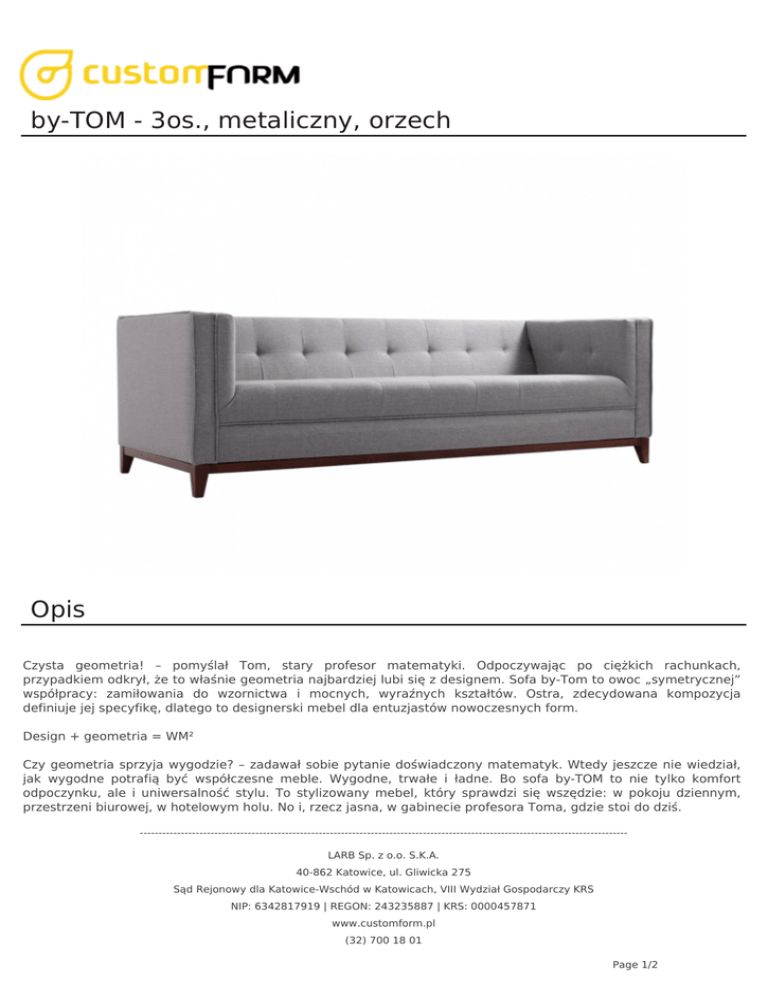 by-TOM - 3os., metaliczny, orzech Opis Czysta geometria! – pomyślał Tom, stary profesor matematyki. Odpoczywając po ciężkich rachunkach, przypadkiem odkrył, że to właśnie geometria najbardziej lubi się z designem. Sofa by-Tom to owoc „symetrycznej” współpracy: zamiłowania do wzornictwa i mocnych, wyraźnych kształtów. Ostra, zdecydowana kompozycja definiuje jej specyfikę, dlatego to designerski mebel dla entuzjastów nowoczesnych form. Design + geometria = WM² Czy geometria sprzyja wygodzie? – zadawał sobie pytanie doświadczony matematyk. Wtedy jeszcze nie wiedział, jak wygodne potrafią być współczesne meble. Wygodne, trwałe i ładne. Bo sofa by-TOM to nie tylko komfort odpoczynku, ale i uniwersalność stylu. To stylizowany mebel, który sprawdzi się wszędzie: w pokoju dziennym, przestrzeni biurowej, w hotelowym holu. No i, rzecz jasna, w gabinecie profesora Toma, gdzie stoi do dziś. ----------------------------------------------------------------------------------------------------------------------------------LARB Sp. z o.o. S.K.A. 40-862 Katowice, ul. Gliwicka 275 Sąd Rejonowy dla Katowice-Wschód w Katowicach, VIII Wydział Gospodarczy KRS NIP: 6342817919 | REGON: 243235887 | KRS: 0000457871 www.customform.pl (32) 700 18 01 Page 1/2 Uwaga! Wybierz kolor, który najbardziej Ci odpowiada! Dostępna kolorystyka tapicerki w załącznikach: "Próbnik tkanin - I, II, III grupa cenowa”. Cena uzależniona jest od rodzaju wybranej tkaniny. Drewniane elementy wykończenia produktu możemy wykonać w kolorach naturalny - jasne drewno, orzech ciemne drewno, biały oraz czarny. Specyfikacja Wysokość 73/s.44 cm Szerokość 208 cm Głębokość 85 cm Głębokość siedziska 60 cm Wykończenie Siedzisko tkanina: 100% polipropylen; wypełnienie: wysokoelastyczna pianka; rama - drewniana tkanina Podstawa drewno Dodatkowe zdjęcia ----------------------------------------------------------------------------------------------------------------------------------LARB Sp. z o.o. S.K.A. 40-862 Katowice, ul. Gliwicka 275 Sąd Rejonowy dla Katowice-Wschód w Katowicach, VIII Wydział Gospodarczy KRS NIP: 6342817919 | REGON: 243235887 | KRS: 0000457871 www.customform.pl (32) 700 18 01 Page 2/2 Powered by TCPDF (www.tcpdf.org)