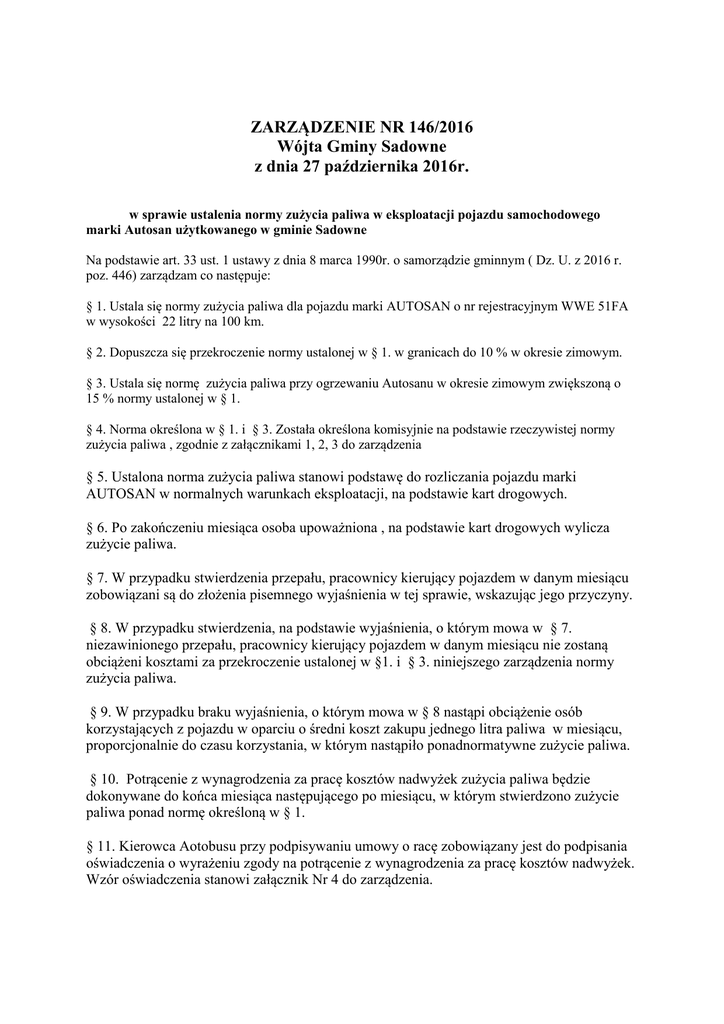ZARZĄDZENIE NR 146/2016 Wójta Gminy Sadowne z dnia 27 października 2016r. w sprawie ustalenia normy zużycia paliwa w eksploatacji pojazdu samochodowego marki Autosan użytkowanego w gminie Sadowne Na podstawie art. 33 ust. 1 ustawy z dnia 8 marca 1990r. o samorządzie gminnym ( Dz. U. z 2016 r. poz. 446) zarządzam co następuje: § 1. Ustala się normy zużycia paliwa dla pojazdu marki AUTOSAN o nr rejestracyjnym WWE 51FA w wysokości 22 litry na 100 km. § 2. Dopuszcza się przekroczenie normy ustalonej w § 1. w granicach do 10 % w okresie zimowym. § 3. Ustala się normę zużycia paliwa przy ogrzewaniu Autosanu w okresie zimowym zwiększoną o 15 % normy ustalonej w § 1. § 4. Norma określona w § 1. i § 3. Została określona komisyjnie na podstawie rzeczywistej normy zużycia paliwa , zgodnie z załącznikami 1, 2, 3 do zarządzenia § 5. Ustalona norma zużycia paliwa stanowi podstawę do rozliczania pojazdu marki AUTOSAN w normalnych warunkach eksploatacji, na podstawie kart drogowych. § 6. Po zakończeniu miesiąca osoba upoważniona , na podstawie kart drogowych wylicza zużycie paliwa. § 7. W przypadku stwierdzenia przepału, pracownicy kierujący pojazdem w danym miesiącu zobowiązani są do złożenia pisemnego wyjaśnienia w tej sprawie, wskazując jego przyczyny. § 8. W przypadku stwierdzenia, na podstawie wyjaśnienia, o którym mowa w § 7. niezawinionego przepału, pracownicy kierujący pojazdem w danym miesiącu nie zostaną obciążeni kosztami za przekroczenie ustalonej w §1. i § 3. niniejszego zarządzenia normy zużycia paliwa. § 9. W przypadku braku wyjaśnienia, o którym mowa w § 8 nastąpi obciążenie osób korzystających z pojazdu w oparciu o średni koszt zakupu jednego litra paliwa w miesiącu, proporcjonalnie do czasu korzystania, w którym nastąpiło ponadnormatywne zużycie paliwa. § 10. Potrącenie z wynagrodzenia za pracę kosztów nadwyżek zużycia paliwa będzie dokonywane do końca miesiąca następującego po miesiącu, w którym stwierdzono zużycie paliwa ponad normę określoną w § 1. § 11. Kierowca Aotobusu przy podpisywaniu umowy o racę zobowiązany jest do podpisania oświadczenia o wyrażeniu zgody na potrącenie z wynagrodzenia za pracę kosztów nadwyżek. Wzór oświadczenia stanowi załącznik Nr 4 do zarządzenia. § 12. Traci moc Zarządzenie Nr 137/2005 Wójta Gminy Sadowne z dnia 1 września 2005r. w sprawie ustalenia norm zużycia paliwa na autobus Autosan Nr rejestracyjny WWE 51FA i Zarządzenie Nr 156/2005 z dnia 28 listopada 2005r. Wójta Gminy Sadowne w sprawie ustalenia norm zużycia paliwa na ogrzewanie w autobusie Autosan Nr. Rejestracyjny WWE 51Fa dowożącym uczniów do szkoły. § 13. Wykonanie niniejszego zarządzenia powierza się Sekretarzowi Gminy Sadowne. § 14. Zarządzenie wchodzi w życie z dniem podpisania.