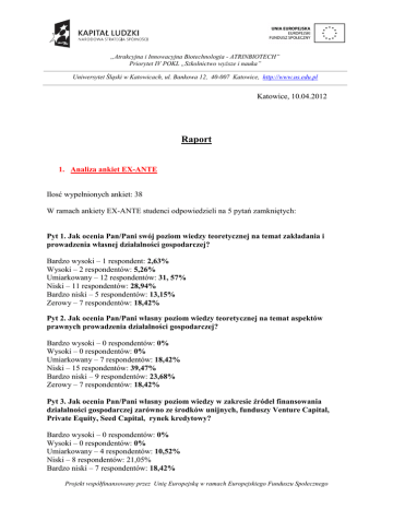 „Atrakcyjna i Innowacyjna Biotechnologia - ATRINBIOTECH” Priorytet IV POKL „Szkolnictwo wyższe i nauka” Uniwersytet Śląski w Katowicach, ul. Bankowa 12, 40-007 Katowice, http://www.us.edu.pl Katowice, 10.04.2012 Raport 1. Analiza ankiet EX-ANTE Ilosć wypełnionych ankiet: 38 W ramach ankiety EX-ANTE studenci odpowiedzieli na 5 pytań zamkniętych: Pyt 1. Jak ocenia Pan/Pani swój poziom wiedzy teoretycznej na temat zakładania i prowadzenia własnej działalności gospodarczej? Bardzo wysoki – 1 respondent: 2,63% Wysoki – 2 respondentów: 5,26% Umiarkowany – 12 respondentów: 31, 57% Niski – 11 respondentów: 28,94% Bardzo niski – 5 respondentów: 13,15% Zerowy – 7 respondentów: 18,42% Pyt 2. Jak ocenia Pan/Pani własny poziom wiedzy teoretycznej na temat aspektów prawnych prowadzenia działalności gospodarczej? Bardzo wysoki – 0 respondentów: 0% Wysoki – 0 respondentów: 0% Umiarkowany – 7 respondentów: 18,42% Niski – 15 respondentów: 39,47% Bardzo niski – 9 respondentów: 23,68% Zerowy – 7 respondentów: 18,42% Pyt 3. Jak ocenia Pan/Pani własny poziom wiedzy w zakresie źródeł finansowania działalności gospodarczej zarówno ze środków unijnych, funduszy Venture Capital, Private Equity, Seed Capital, rynek kredytowy? Bardzo wysoki – 0 respondentów: 0% Wysoki – 0 respondentów: 0% Umiarkowany – 4 respondentów: 10,52% Niski – 8 respondentów: 21,05% Bardzo niski – 7 respondentów: 18,42% Projekt współfinansowany przez Unię Europejską w ramach Europejskiego Funduszu Społecznego „Atrakcyjna i Innowacyjna Biotechnologia - ATRINBIOTECH” Priorytet IV POKL „Szkolnictwo wyższe i nauka” Uniwersytet Śląski w Katowicach, ul. Bankowa 12, 40-007 Katowice, http://www.us.edu.pl Zerowy – 19 respondentów: 50% Pyt 4. Jak ocenia Pan/Pani poziom własnych umiejętności praktycznych niezbędnych do prowadzenia innowacyjnego biznesu? Bardzo wysoki – 0 respondentów: 0% Wysoki – 3 respondentów: 7,89% Umiarkowany – 15 respondentów: 39,47% Niski – 7 respondentów: 18,42% Bardzo niski – 6 respondentów: 15,78% Zerowy – 7 respondentów: 18,42% Pyt 5. Jak ocenia Pan/Pani poziom wiedzy z prawa pracy, prawa przysługującym kobietom w ciąży i matkom wychowującym dzieci? Bardzo wysoki – 0 respondentów: 0% Wysoki – 3 respondentów: 7,89% Umiarkowany – 13 respondentów: 34,21% Niski – 10 respondentów: 26,31% Bardzo niski – 4 respondentów: 10,52% Zerowy – 8 respondentów: 21,05% 2. Analiza ankiet EX-POST Ilosć wypełnionych ankiet: 56 W ramach ankiety EX-ANTE studenci odpowiedzieli na 5 pytań zamkniętych: Pyt 1. Jak po zakończeniu szkolenia ocenia Pan/Pani swój poziom wiedzy teoretycznej na temat zakładania i prowadzenia własnej działalności gospodarczej? Bardzo wysoki – 0 respondentów: 0% Wysoki – 12 respondentów: 21,81% Umiarkowany – 28 respondentów: 50,90% Niski – 7 respondentów: 12,72% Bardzo niski – 6 respondentów: 10,90% Zerowy – 2 respondentów: 3,63% Pyt 2. Jak po zakończeniu szkolenia ocenia Pan/Pani własny poziom wiedzy teoretycznej na temat aspektów prawnych prowadzenia działalności gospodarczej? Projekt współfinansowany przez Unię Europejską w ramach Europejskiego Funduszu Społecznego „Atrakcyjna i Innowacyjna Biotechnologia - ATRINBIOTECH” Priorytet IV POKL „Szkolnictwo wyższe i nauka” Uniwersytet Śląski w Katowicach, ul. Bankowa 12, 40-007 Katowice, http://www.us.edu.pl Bardzo wysoki – 2 respondentów: 3,63% Wysoki – 7 respondentów: 12,72% Umiarkowany – 30 respondentów: 54,54% Niski – 10 respondentów: 18,18% Bardzo niski – 5 respondentów: 9,09% Zerowy – 1 respondent: 1,81% Pyt 3. Jak po zakończeniu szkolenia ocenia Pan/Pani własny poziom wiedzy w zakresie źródeł finansowania działalności gospodarczej zarówno ze środków unijnych, funduszy Venture Capital, Private Equity, Seed Capital, rynek kredytowy? Bardzo wysoki – 0 respondentów: 0% Wysoki – 2 respondentów: 3,63% Umiarkowany – 12 respondentów: 21,81% Niski – 18 respondentów: 32,72% Bardzo niski – 7 respondentów: 12,72% Zerowy – 16 respondent: 29,09% Pyt 4. Jak po zakończeniu szkolenia ocenia Pan/Pani poziom własnych umiejętności praktycznych niezbędnych do prowadzenia innowacyjnego biznesu? Bardzo wysoki – 1 respondentów: 1,81% Wysoki – 7 respondentów: 12,72% Umiarkowany – 18 respondentów: 32,72% Niski – 16 respondentów: 29.09% Bardzo niski – 6 respondentów: 10,90% Zerowy – 7 respondent: 12,72% Pyt 5. Jak po zakończeniu szkolenia ocenia Pan/Pani poziom wiedzy z prawa pracy, prawa przysługującym kobietom w ciąży i matkom wychowującym dzieci? Bardzo wysoki – 11 respondentów: 20% Wysoki – 25 respondentów: 45,45% Umiarkowany – 16 respondentów: 29,09% Niski – 2 respondentów: 3,63% Bardzo niski – 0 respondentów: 0% Zerowy – 0 respondent: 0% Tab.1 Porównanie ankiet EX-ANTE I POST -ANTE: PYTANIE PIERWSZE Ocena: EX-ANTE POST -ANTE Bardzo wysoki 2,63% 0,00% Projekt współfinansowany przez Unię Europejską w ramach Europejskiego Funduszu Społecznego „Atrakcyjna i Innowacyjna Biotechnologia - ATRINBIOTECH” Priorytet IV POKL „Szkolnictwo wyższe i nauka” Uniwersytet Śląski w Katowicach, ul. Bankowa 12, 40-007 Katowice, http://www.us.edu.pl Wysoki 5,26% 21,81% Umiarkowany 31,57% 50,90% Niski 28,94% 12,72% Bardzo niski 13,15% 10,90% Zerowy 18,42% 3,63% Tab. 2 Porównanie ankiet EX-ANTE I POST -ANTE: PYTANIE DRUGIE Ocena: EX-ANTE POST -ANTE Bardzo wysoki 0,00% 3,63% Wysoki 0,00% 12,72% Umiarkowany 18,42% 54,54% Niski 39,47% 12,72% Bardzo niski 23,68% 9,09% Zerowy 18,42% 1,81% Tab. 3 Porównanie ankiet EX-ANTE I POST -ANTE: PYTANIE TRZECIE Ocena: EX-ANTE POST -ANTE Bardzo wysoki 0,00% 0% Wysoki 0,00% 3,63% Umiarkowany 10,52% 21,81% Niski 21,05% 32,72% Bardzo niski 18,42% 12,72% Zerowy 50,00% 29,09% Tab. 4 Porównanie ankiet EX-ANTE I POST -ANTE: PYTANIE CZWARTE Ocena: EX-ANTE POST -ANTE Bardzo wysoki 0,00% 1,81% Wy