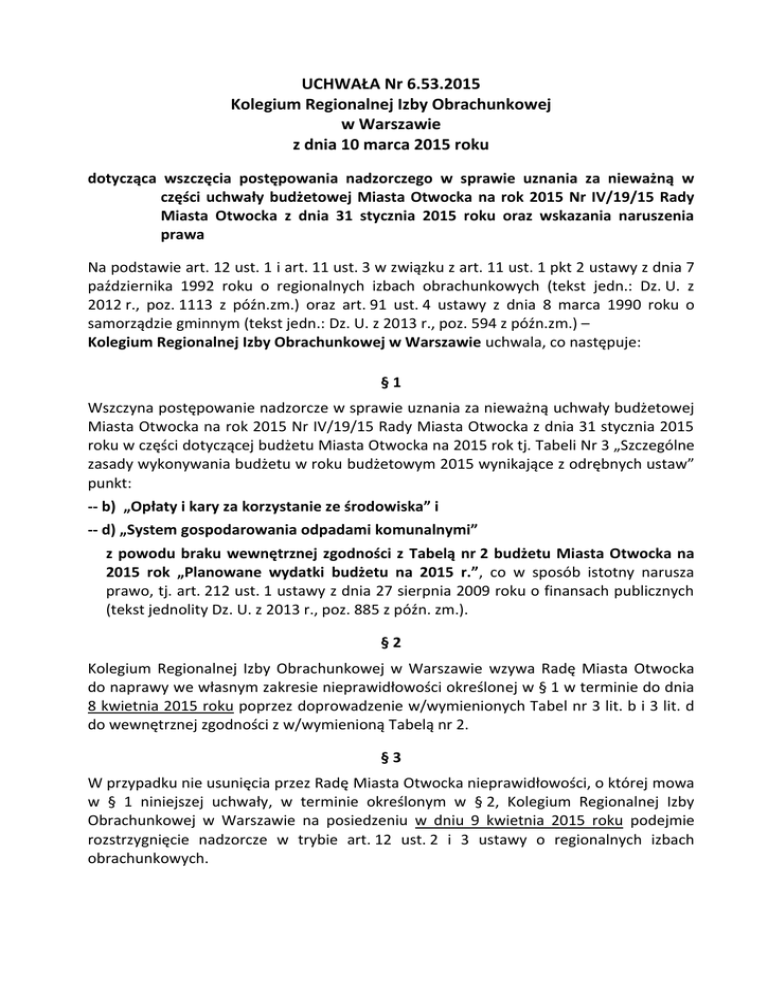 UCHWAŁA Nr 6.53.2015 Kolegium Regionalnej Izby Obrachunkowej w Warszawie z dnia 10 marca 2015 roku dotycząca wszczęcia postępowania nadzorczego w sprawie uznania za nieważną w części uchwały budżetowej Miasta Otwocka na rok 2015 Nr IV/19/15 Rady Miasta Otwocka z dnia 31 stycznia 2015 roku oraz wskazania naruszenia prawa Na podstawie art. 12 ust. 1 i art. 11 ust. 3 w związku z art. 11 ust. 1 pkt 2 ustawy z dnia 7 października 1992 roku o regionalnych izbach obrachunkowych (tekst jedn.: Dz. U. z 2012 r., poz. 1113 z późn.zm.) oraz art. 91 ust. 4 ustawy z dnia 8 marca 1990 roku o samorządzie gminnym (tekst jedn.: Dz. U. z 2013 r., poz. 594 z późn.zm.) – Kolegium Regionalnej Izby Obrachunkowej w Warszawie uchwala, co następuje: §1 Wszczyna postępowanie nadzorcze w sprawie uznania za nieważną uchwały budżetowej Miasta Otwocka na rok 2015 Nr IV/19/15 Rady Miasta Otwocka z dnia 31 stycznia 2015 roku w części dotyczącej budżetu Miasta Otwocka na 2015 rok tj. Tabeli Nr 3 „Szczególne zasady wykonywania budżetu w roku budżetowym 2015 wynikające z odrębnych ustaw” punkt: -- b) „Opłaty i kary za korzystanie ze środowiska” i -- d) „System gospodarowania odpadami komunalnymi” z powodu braku wewnętrznej zgodności z Tabelą nr 2 budżetu Miasta Otwocka na 2015 rok „Planowane wydatki budżetu na 2015 r.”, co w sposób istotny narusza prawo, tj. art. 212 ust. 1 ustawy z dnia 27 sierpnia 2009 roku o finansach publicznych (tekst jednolity Dz. U. z 2013 r., poz. 885 z późn. zm.). §2 Kolegium Regionalnej Izby Obrachunkowej w Warszawie wzywa Radę Miasta Otwocka do naprawy we własnym zakresie nieprawidłowości określonej w § 1 w terminie do dnia 8 kwietnia 2015 roku poprzez doprowadzenie w/wymienionych Tabel nr 3 lit. b i 3 lit. d do wewnętrznej zgodności z w/wymienioną Tabelą nr 2. §3 W przypadku nie usunięcia przez Radę Miasta Otwocka nieprawidłowości, o której mowa w § 1 niniejszej uchwały, w terminie określonym w § 2, Kolegium Regionalnej Izby Obrachunkowej w Warszawie na posiedzeniu w dniu 9 kwietnia 2015 roku podejmie rozstrzygnięcie nadzorcze w trybie art. 12 ust. 2 i 3 ustawy o regionalnych izbach obrachunkowych. §4 Wskazuje naruszenie prawa w uchwale budżetowej Miasta Otwocka na rok 2015 Nr IV/19/15 Rady Miasta Otwocka z dnia 31 stycznia 2015 r. w części dotyczącej budżetu tj. Tabeli nr 2a pn. „Plan wydatków majątkowych na 2015 rok”, Tabeli nr 2 „Planowane wydatki budżetu na 2015 r.” oraz Tabeli nr 1 „Planowane dochody budżetu na 2015 rok” z powodu zastosowania błędnej klasyfikacji budżetowej, tj. naruszenia przepisów rozporządzenia Ministra Finansów z dnia 2 marca 2010 r. w sprawie szczegółowej klasyfikacji dochodów, wydatków, przychodów i rozchodów oraz środków pochodzących ze źródeł zagranicznych (Dz. U. z 2014 r., poz. 1053 i 1382 z późn. zm.) w zakresie wskazanym w uzasadnieniu. §5 Od niniejszej uchwały, w części dotyczącej wskazanego w § 4 uchwały naruszenia prawa nie przysługuje prawo wniesienia skargi do Wojewódzkiego Sądu Administracyjnego w Warszawie. UZASADNIENIE W dniu 9 lutego 2015 roku wpłynęła do Regionalnej Izby Obrachunkowej w Warszawie uchwała budżetowa Miasta Otwocka na rok 2015 Nr IV/19/15 Rady Miasta Otwocka z dnia 31 stycznia 2015 roku. W wyniku badania ww. uchwały Kolegium Regionalnej Izby Obrachunkowej w Warszawie ustaliło, co następuje: 1. W Tabeli nr 3 budżetu pn. „Szczególne zasady wykonywania budżetu w roku budżetowym 2015 wynikające z odrębnych ustaw” w punkcie b) „Opłaty i kary za korzystanie ze środowiska” oraz punkcie d) „System gospodarowania odpadami komunalnymi” w planowanych wydatkach w dziale 900 „Gospodarka komunalna i ochrona środowiska”, rozdz. 90002 „Gospodarka odpadami”, paragraf 4300 „Zakup usług pozostałych” łączna planowana kwota wydatków w w/wskazanej klasyfikacji (5.992.000,00 zł) jest wyższa o 19 000,00 zł niż kwota wydatków określonych w Tabeli nr 2 budżetu (5.973.000,00 zł) stanowiącej „Planowane wydatki budżetu na 2015 r.” Zatem w sposób istotny naruszony zastał przepis art. 211 ust. 1 ustawy z dnia 27 sierpnia 2009 roku o finansach publicznych, stosowanie do którego budżet jednostki samorządu terytorialnego jest rocznym planem dochodów i wydatków oraz przychodów i rozchodów tej jednostki. Wszystkie elementy budżetu winny być wewnętrznie zgodne. 2. W Tabeli nr 2a budżetu „Plan wydatków majątkowych na 2015 rok” oraz w Tabeli nr 2 budżetu „Planowane wydatki budżetu na 2015 r.” zastosowano błędną klasyfikację budżetową dotyczącą następujących wydatków: a) Zakup śmietników żeliwnych w ilości 100 sztuk w łącznej kwocie 40 000,00 zł (900/90002/6050) zaklasyfikowano w paragrafie 6050 „Wydatki inwestycyjne jednostek budżetowych”. 2 Z art. 3 ust. 1 pkt 17 ustawy z dnia 29 września 1994 r. o rachunkowości (tekst jednolity Dz. U. z 2013 r., poz. 330 z późn. zm.) wynika, że śmietnik żeliwny w cenie jednostkowej 400 zł nie stanowi środka trwałego, a zatem zgodnie z Rozporządzeniem Ministra Finansów z dnia 2 marca 2010 r. w sprawie szczegółowej klasyfikacji (…) łączna kwota wydatków 40 000,00 zł na ww. śmietniki winna być ujęta w paragrafie 421 „Zakup materiałów i urządzeń”. b) W dziale 600 „Transport i łączność”, rozdz. 60014 „Drogi publiczne powiatowe” do wydatków inwestycyjnych (paragraf 6050 „Wydatki inwestycyjne jednostek budżetowych”) zaliczono remonty. Dotyczy to następujących zadań: - remont wysepki na skrzyżowaniu ul. Staszica i ul. Karczewskiej, - remont ul. Wspólnej – jezdnia, chodnik oraz parkingi, - remont chodników i budowa ścieżki rowerowej w ul. Staszica (na odcinku od ul. Rzemieślniczej do Ronda Sybiraków) oraz remont wysepek w skrzyżowaniu ulic: Świderskiej i Staszica. Ponadto w dziale 750 „Administracja publiczna”, rozdz. 75023 „Urzędy gmin” do