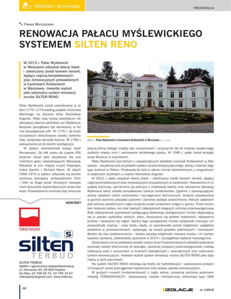Materiały i technologie PREZENTACJA Tomasz Matuszewski RENOWACJA PAŁACU MYŚLEWICKIEGO SYSTEMEM SILTEN RENO W 2015 r. Pałac Myślewicki w Warszawie odzyskał dawny blask – zakończony został bowiem remont, będący częścią kompleksowych prac renowacyjnych prowadzonych w Łazienkach Królewskich w Warszawie. Inwestor wybrał jako optymalny system renowacji murów SILTEN RENO. Pałac Myślewicki został wybudowany w latach 1775–1779 według projektu Dominika Merliniego na zlecenie króla Stanisława Augusta. Pałac swą nazwę zawdzięcza nieistniejącej obecnie pobliskiej wsi Myślewice. Budynek początkowo był wzniesiony w formie dwupiętrowej willi. W 1776 r. do ścian szczytowych dobudowane zostały ćwierćkoliste, parterowe skrzydła boczne. W 1783 r. podwyższono je do dwóch kondygnacji. W pałacu zamieszkiwał książę Józef Poniatowski. Od XIX wieku do czasów PRL budynek służył jako rezydencja dla znamienitych gości odwiedzających Warszawę. Mieszkali w nim między innymi Napoleon, Indira Gandhi i Richard Nixon. W latach 1958–1970 w pałacu odbywały się poufne rozmowy pomiędzy ambasadorami Chin i USA na długo przed oficjalnym nawiązaniem stosunków dyplomatycznych przez oba kraje. Prowadzone tu rozmowy były wówczas KONTAKT TERBUD SILTEN TERBUD Spółka z ograniczoną odpowiedzialnością ul. Harcerska 30, 05-820 Piastów tel./faks: 22 758 05 74, 22 759 10 67 [email protected], www.silten.eu 48 FOT. 1. Pałac Myślewicki w Łazienkach Królewskich w Warszawie; fot.: autor jedyną formą dialogu między obu mocarstwami i przyczyniły się do budowy wzajemnego zaufania między nimi i zachowania światowego pokoju. W 1980 r. pałac został przejęty przez Muzeum w Łazienkach. Pałac Myślewicki jest jednym z najważniejszych obiektów Łazienek Królewskich w Warszawie – rezydencja jest przykładem pałacu wczesnoklasycystycznego, jedną z niewielu tego typu budowli w Polsce. Przetrwała do dziś w stanie niemal niezmienionym, z oryginalnym w większości wystrojem z czasów Stanisława Augusta. W 2015 r. pałac odzyskał dawny blask – zakończony został bowiem remont, będący częścią kompleksowych prac renowacyjnych prowadzonych w Łazienkach. Naprawiono m.in. więźbę dachową, wymieniono jej pokrycie z miedzianej blachy oraz odnowiono elewację. Wykonana także została kompleksowa izolacja fundamentów. Zgodnie z obowiązującymi dzisiaj zasadami sztuki budowlanej i wymaganiami technicznymi, budynki posadowione w gruncie powinny posiadać poziome i pionowe izolacje wodochronne, których zadaniem jest ochrona podziemnych części budynku przed wnikaniem wilgoci z gruntu. Przed remontem budynek pałacu nie miał żadnych zabezpieczeń dających ochronę przeciwwilgociową. Brak zabezpieczeń powodował postępującą destrukcję zawilgoconych murów objawiającą się w postaci wykwitów solnych, plam, złuszczenia się powłok malarskich, odparzenia tynków i lasowania się cegieł. Oprócz tego zawilgocenie murów zwiększało znacząco ich przewodność cieplną – rosły straty ciepła, co powodowało wzrost wilgotności względnej powietrza w pomieszczeniach, wpływając na rozwój grzybów pleśniowych i domowych. Bardzo zły stan podpiwniczenia – bardzo wysoką wilgotność masową murów i ich bardzo wysokie zasolenie, potwierdziły wykonane w 2014 r. szczegółowe badania mykologiczne. Opracowany na tej podstawie projekt izolacji ścian fundamentowych zakładał wykonanie pionowej izolacji bitumicznej od zewnątrz, poziomej przepony przeciwwilgociowej metodą iniekcyjną wraz z osuszaniem w ścianach zewnętrznych i wewnętrznych oraz wykonanie tynków renowacyjnych. Inwestor wybrał system renowacji murów SILTEN RENO jako optymalny w tych warunkach. Na system SILTEN RENO składają się środki do hydrofobizacji i wytwarzania przepon chroniących przed podciąganiem kapilarnym oraz zestaw zapraw renowacyjnych. W grubych murach fundamentowych z cegły pełnej, przeponę poziomą wykonano metodą TERMOINIEKCJI®. Zastosowana została mikroemulsja silikonowa typu SMK nr 1/2016 2 3 4 5 FOT. 2–5. Prace renowacyjne w Pałacu Myślewickim; fot.: Marta John-Koziak – SILTEN Me. Strefa iniekcji została wcześniej podgrzana i osuszona. Stale monitorując tempo procesu termowentylacyjnego osuszania, iniekcję ciśnieniową prowadzono po osiągnięciu przez mur 3–4% wilgotności masowej. Wybrany preparat iniekcyjny toleruje podwyższoną zawartość soli w murze, wnikając ze względu na wielkość cząstek w kapilary niedostępne dla innych preparatów iniekcyjnych. Środek ten zalecany jest do iniekcji ciśnieniowej w bardzo silnie zawilgoconych murach. Przepona hydrofobowa tworzy się bez żadnych dodatkowych reakcji wtórnych. Dzięki tym właściwościom było możliwe prowadzenie iniekcji w otworach nawierconych tylko z jednej strony muru – od wewnątrz pomieszczeń, co przyśpieszyło pracę i znacznie ograniczyło ilość prac ziemnych. SILTEN Me jest rekomendowany przez Instytut Techniki Budowlanej (RT ITB 1192/2010). W przypadku gdy w czasie nawiercania otworów iniekcyjnych stwierdzono występowanie pustek i kawern w murze, aplikowano środek na bazie silanów i siloksanów, lecz o konsystencji kremu – SILTEN K, którym otwory wypełnia się całkowicie. Konsystencja preparatu umożliwia zastosowanie go nawet w otworach wierconych poziomo w spoinach muru. Preparat ten również posiada Rekomendację Techniczną ITB – RT ITB 12014/2010. Następnie, po wypełnieniu otworów zaprawą o wymaganych parametrach, przystąpiono do wykonywania systemu tynków renowacyjnych SILTEN RENO, posiadającego Godło TERAZ POLSKA, spełniającego kryteria normy PN EN 998–1:2012 i posiadającego Certyfikat WTA oraz Certyfikat Zakładowej Kontroli Produkcji ITB-0662/Z wydany przez Instytut Techniki Budowlanej w Warszawie. W skład systemu wchodzą: obrzutka SILTEN RENOCOAT, tynk nr 1/2016 renowacyjny podkładowy SILTEN RENOBASE, tynk re