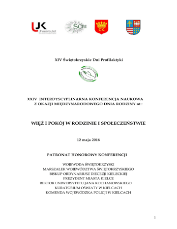 XIV Świętokrzyskie Dni Profilaktyki XXIV INTERDYSCYPLINARNA KONFERENCJA NAUKOWA Z OKAZJI MIĘDZYNARODOWEGO DNIA RODZINY nt.: WIĘŹ I POKÓJ W RODZINIE I SPOŁECZEŃSTWIE 12 maja 2016 PATRONAT HONOROWY KONFERENCJI WOJEWODA ŚWIĘTOKRZYSKI MARSZAŁEK WOJEWÓDZTWA ŚWIĘTOKRZYSKIEGO BISKUP ORDYNARIUSZ DIECEZJI KIELECKIEJ PREZYDENT MIASTA KIELCE REKTOR UNIWERSYTETU JANA KOCHANOWSKIEGO KURATORIUM OŚWIATY W KIELCACH KOMENDA WOJEWÓDZKA POLICJI W KIELCACH 1 PATRONAT NAUKOWY ZESPÓŁ PEDAGOGIKI CHRZEŚCIJAŃSKIEJ KOMITETU NAUK PEDAGOGICZNYCH PAN, REKTOR UNIWERSYTETU JANA KOCHANOWSKIEGO W KIELCACH DZIEKAN WYDZIAŁU PEDAGOGICZNEGO I ARTYSTYCZNEGO WYŻSZA SZKOŁA BIZNESU i PRZEDSIĘBIORCZOŚCI w OSTROWCU ŚWIĘTOKRZYSKIM Komitet Naukowy Konferencji: Ks. prof. zw. dr hab. Jan Śledzianowski - Przewodniczący Prof. UJK, dr hab. Anna Kieszkowska Prof. zw. dr hab. Marian Nowak Prof. zw. dr hab. Wanda Dróżka Prof. zw. dr hab. Bożena Matyjas Prof. UJK, dr hab. Sławomir Koziej Prof. zw. dr hab. Marta Wiszniowska-Majchrzyk Prof. UKSW, dr hab. Zdzisław Majchrzyk Prof. zw. dr hab. Eugeniusz Sakowicz Ks. prof. WSH, dr hab. Stefan Radziszewski Prof. UJK, dr hab. Bożena Zawadzka Prof. KUL JP II, dr hab. Danuta Opozda Prof. KUL JP II, dr hab. Alina Rynio Prof. KUL JP II, dr hab. Dorota Kornas-Biela Prof. UP, dr hab. Ireneusz Marian Świtała KONFERENCJĘ POPRZEDZA MSZA ŚW. o godz. 9.00 POD PRZEWODNICTWEM Ks. dra Jana Piotrowskiego– Biskupa Diecezji Kieleckiej Kościół pw. św. Franciszka z Asyżu w Kielcach, ul. Warszawska 34 2 PROGRAM KONFERENCJI 12 MAJA 2015 - czwartek 10.00 – 14.00 Obrady plenarne OTWARCIE KONFERENCJI – Okrąglak Świętokrzyski Urząd Wojewódzki w Kielcach, Al. IX Wieków Kielc 3 10.00 - 10.20 Uroczyste otwarcie Konferencji: Powitanie Gości, wystąpienia oficjalne 10.20 - 10.40 Ks. Prof. zw. dr hab. Jan Śledzianowski (Wyższa Szkoła Biznesu i Przedsiębiorczości w Ostrowcu Świętokrzyskim) Więź małżeńska podstawą pokoju w rodzinie i społeczeństwie. 10.40-11.00 Prof. zw. dr hab. Bożena Matyjas (UJK Kielce) Ojciec i jego rola w procesie opieki i wychowania dziecka. Refleksje pedagoga. 11.00-11.20 Prof. UP, dr hab. Ireneusz Marian Świtała (Uniwersytet Pedagogiczny im. KEN w Krakowie) Rodzina współczesna i jej zagrożenia w XXI w. 11.20-11.40 Prof. KUL JP II, dr hab. Dorota Kornas-Biela (KUL JP II Lublin) Kształtowanie więzi rodziców z dzieckiem w perinatalnym okresie życia. 11.40 -12.00 Prof. KUL JP II, dr hab. Roman Jusiak (KUL Lublin) Rodzina i parafia jako środowiska kształtowania dojrzałych (pokojowych) więzi międzyosobowych. 12.00- 12.10 Dyskusja PRZERWA KAWOWA 12.10-12.50 3 12.50-13.05 Prof. WSS-E, dr hab. Marek Marczewski (WSS-E Gdańsk) Człowieczeństwo wezwaniem do międzyosobowej komunii. 13.05-13.20 Prof. WSH, dr hab. Dariusz Adamczyk (WSH Radom) Społeczeństwo wobec rodziny – w świetle „Karty Praw Rodziny”. 13.20-13.35 Prof. UJK, dr hab. Bożena Zawadzka (UJK Kielce) Edukacja zdrowotna w służbie życiu. 13.35-13.50 Prof. WSH, dr hab. Stefan Radziszewski (WSH Radom) Wychowanie do mądrości w „Uniwersalnych prawach życia” Johna Templetona. 13.50 -14.05 Prof. KUL JP, dr hab. Danuta Opozda (KUL JP II Lublin) Poczucie więzi i odrębności w relacji matki z dzieckiem w opinii badanych kobiet. PRZERWA OBIADOWA 14.05-15.00 Obrady w sekcjach SEKCJA I Więź wewnątrzrodzinna – problematyka odpowiedzialności osobistej za rozwój i funkcjonowanie relacji wewnątrzrodzinnych Moderatorzy: Dr Anna Przygoda (UJK Kielce) Dr Krzysztof Gąsior (UJK Kielce) 15.00-15.15 Dr Aneta Smolińska (UJK Kielce) - Kulturowe postrzeganie więzi rodzinnych wg. antropologicznej teorii Edwarda Hall'a i socjologicznej teorii Geert'a Hofstede. 15.15-15.30 Dr Lidia Salata – Zasacka (UJK Kielce) - Bycie razem - kulturowe aspekty życia indywidualnego i rodzinnego. 15.30-15.45 Dr Krzysztof Gąsior (UJK Kielce), mgr Wojciech Cechowski (ŚCPiE) – Budowanie prężności wśród wychowanków i wychowawców placówek opiekuńczowychowawczych typu rodzinnego. 4 15.45-16.00 Dr Anna Przygoda (UJK Kielce) – Dziadkowie i wnuki – obraz więzi w rodzinie wielopokoleniowej. 16.00-16.15 Mgr Alicja Libura-Gil (KUL JP II Lublin) - Znaczenie więzi dziecka z matką i ojcem w budowaniu jego tożsamości płciowej. 16.15-16.30 Mgr Wioletta Szumilas-Praszek (UJK Kielce) - Kreacja więzi matkadziecko w rodzinach późnego macierzyństwa. 16.30-16.45 Mgr Karolina Wilkołaska (KUL JP II Lublin) - Więź między kolejnymi pokoleniami kobiet w rodzinie. 16.45-17.00 Mgr Agnieszka Zwierzchowska (Okręgowa Izba Radców Prawnych w Kielcach) - Wzajemne obowiązki małżonków o charakterze niemajątkowym na gruncie przepisów kodeksu rodzinnego i opiekuńczego. 17.00-17.10 Wioletta Langa (WSH Radom) – Pokój w rodzinie podstawą pokoju w społeczeństwie. 17.10-17.20 Beata Myśliwiec (WSH Radom) – Znaczenie więzi w rodzinie. SEKCJA II Pokój w rodzinie podstawą pokoju w społeczeństwie Moderatorzy: Dr hab. Tadeusz Sakowicz, prof. UJK (UJK Kielce) Dr Magdalena Parzyszek (KUL JP II Lublin) 15.00-15.15 Dr Magdalena Parzyszek (KUL JP II Lublin) – Rodzina miejscem doświadczania, budowania i wychowania do pokoju. 15.15-15.30 Dr Anna Jaśkowska (MOPR Kielce) – Jednostka i rodzina a grzech społeczny. 15.30-15.45 Prof. UJK, dr hab. Tadeusz Sakowicz, (UJK Kielce) – Siła więzi rodzinnych w przezwyciężaniu indywidualnych i społecznych problemów życiowych. 15.45-16.00 Dr Monika Siwek (UJK Kielce) – Mediatyzacja życia rodzinnego a więzi wewnątrzrodzinne. 16.00-16.15 Dr Martyna Kawińska (UKSW Warszawa) - Rodzicielstwo w warunkach nowoczesności. 5 16.15-16.30 Dr Paulina Forma (UJK Kielce) – Więzi w dużych rodzinach. Komunikat z badań. 16.30-16.45 Mgr Magdalena Florek (Klinika Kardiochirurgii Świętokrzyskiego Centrum Kardiologii w Kielcach) - Psychologiczna potrzeba pokoju i spokoju w rodzinie. Zarys problematyki. 16.45-17.00 Mgr Dariusz Zwierzchowski (Świ