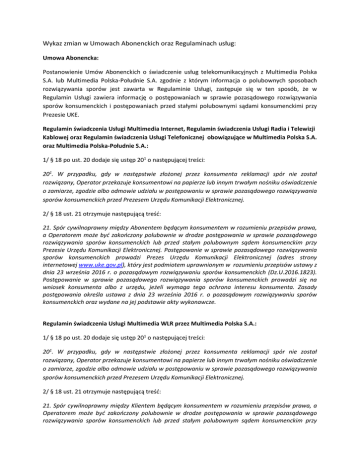 Wykaz zmian w Umowach Abonenckich oraz Regulaminach usług: Umowa Abonencka: Postanowienie Umów Abonenckich o świadczenie usług telekomunikacyjnych z Multimedia Polska S.A. lub Multimedia Polska-Południe S.A. zgodnie z którym informacja o polubownych sposobach rozwiązywania sporów jest zawarta w Regulaminie Usługi, zastępuje się w ten sposób, że w Regulamin Usługi zawiera informację o postępowaniach w sprawie pozasądowego rozwiązywania sporów konsumenckich i postępowaniach przed stałymi polubownymi sądami konsumenckimi przy Prezesie UKE. Regulamin świadczenia Usługi Multimedia Internet, Regulamin świadczenia Usługi Radia i Telewizji Kablowej oraz Regulamin świadczenia Usługi Telefonicznej obowiązujące w Multimedia Polska S.A. oraz Multimedia Polska-Południe S.A.: 1/ § 18 po ust. 20 dodaje się ustęp 201 o następującej treści: 201. W przypadku, gdy w następstwie złożonej przez konsumenta reklamacji spór nie został rozwiązany, Operator przekazuje konsumentowi na papierze lub innym trwałym nośniku oświadczenie o zamiarze, zgodzie albo odmowie udziału w postępowaniu w sprawie pozasądowego rozwiązywania sporów konsumenckich przed Prezesem Urzędu Komunikacji Elektronicznej. 2/ § 18 ust. 21 otrzymuje następującą treść: 21. Spór cywilnoprawny między Abonentem będącym konsumentem w rozumieniu przepisów prawa, a Operatorem może być zakończony polubownie w drodze postępowania w sprawie pozasądowego rozwiązywania sporów konsumenckich lub przed stałym polubownym sądem konsumenckim przy Prezesie Urzędu Komunikacji Elektronicznej. Postępowanie w sprawie pozasądowego rozwiązywania sporów konsumenckich prowadzi Prezes Urzędu Komunikacji Elektronicznej (adres strony internetowej www.uke.gov.pl), który jest podmiotem uprawnionym w rozumieniu przepisów ustawy z dnia 23 września 2016 r. o pozasądowym rozwiązywaniu sporów konsumenckich (Dz.U.2016.1823). Postępowanie w sprawie pozasądowego rozwiązywania sporów konsumenckich prowadzi się na wniosek konsumenta albo z urzędu, jeżeli wymaga tego ochrona interesu konsumenta. Zasady postępowania określa ustawa z dnia 23 września 2016 r. o pozasądowym rozwiązywaniu sporów konsumenckich oraz wydane na jej podstawie akty wykonawcze. Regulamin świadczenia Usługi Multimedia WLR przez Multimedia Polska S.A.: 1/ § 18 po ust. 20 dodaje się ustęp 201 o następującej treści: 201. W przypadku, gdy w następstwie złożonej przez konsumenta reklamacji spór nie został rozwiązany, Operator przekazuje konsumentowi na papierze lub innym trwałym nośniku oświadczenie o zamiarze, zgodzie albo odmowie udziału w postępowaniu w sprawie pozasądowego rozwiązywania sporów konsumenckich przed Prezesem Urzędu Komunikacji Elektronicznej. 2/ § 18 ust. 21 otrzymuje następującą treść: 21. Spór cywilnoprawny między Klientem będącym konsumentem w rozumieniu przepisów prawa, a Operatorem może być zakończony polubownie w drodze postępowania w sprawie pozasądowego rozwiązywania sporów konsumenckich lub przed stałym polubownym sądem konsumenckim przy Prezesie Urzędu Komunikacji Elektronicznej. Postępowanie w sprawie pozasądowego rozwiązywania sporów konsumenckich prowadzi Prezes Urzędu Komunikacji Elektronicznej (adres strony internetowej www.uke.gov.pl), który jest podmiotem uprawnionym w rozumieniu przepisów ustawy z dnia 23 września 2016 r. o pozasądowym rozwiązywaniu sporów konsumenckich (Dz.U.2016.1823). Postępowanie w sprawie pozasądowego rozwiązywania sporów konsumenckich prowadzi się na wniosek konsumenta albo z urzędu, jeżeli wymaga tego ochrona interesu konsumenta. Zasady postępowania określa ustawa z dnia 23 września 2016 r. o pozasądowym rozwiązywaniu sporów konsumenckich oraz wydane na jej podstawie akty wykonawcze. Regulamin świadczenia Usługi Multimedia NDS przez Multimedia Polska S.A.: 1/ § 18 po ust. 20 dodaje się ustęp 201 o następującej treści: 201. W przypadku, gdy w następstwie złożonej przez konsumenta reklamacji spór nie został rozwiązany, Operator przekazuje konsumentowi na papierze lub innym trwałym nośniku oświadczenie o zamiarze, zgodzie albo odmowie udziału w postępowaniu w sprawie pozasądowego rozwiązywania sporów konsumenckich przed Prezesem Urzędu Komunikacji Elektronicznej. 2/ § 18 ust. 21 otrzymuje następującą treść: 21. Spór cywilnoprawny między Abonentem będącym konsumentem w rozumieniu przepisów prawa, a Operatorem może być zakończony polubownie w drodze postępowania w sprawie pozasądowego rozwiązywania sporów konsumenckich lub przed stałym polubownym sądem konsumenckim przy Prezesie Urzędu Komunikacji Elektronicznej. Postępowanie w sprawie pozasądowego rozwiązywania sporów konsumenckich prowadzi Prezes Urzędu Komunikacji Elektronicznej (adres strony internetowej www.uke.gov.pl), który jest podmiotem uprawnionym w rozumieniu przepisów ustawy z dnia 23 września 2016 r. o pozasądowym rozwiązywaniu sporów konsumenckich (Dz.U.2016.1823). Postępowanie w sprawie pozasądowego rozwiązywania sporów konsumenckich prowadzi się na wniosek konsumenta albo z urzędu, jeżeli wymaga tego ochrona interesu konsumenta. Zasady postępowania określa ustawa z dnia 23 września 2016 r. o pozasądowym rozwiązywaniu sporów konsumenckich oraz wydane na jej podstawie akty wykonawcze. Regulamin świadczenia Usługi Telefonii Komórkowej multiMOBILE obowiązujący w Multimedia Polska S.A. oraz Multimedia Polska-Południe S.A.: 1/ § 17 po ust. 20 dodaje się ustęp 201 o następującej treści: 201. W przypadku, gdy w następstwie złożonej przez konsumenta reklamacji spór nie został rozwiązany, Operator przekazuje konsumentowi na papierze lub innym trwałym nośniku oświadczenie o zamiarze, zgodzie albo odmowie udziału w postępowaniu w sprawie pozasądowego rozwiązywania sporów konsumenckich przed Prezesem Urzędu Komunikacji Elektronicznej. 2/ § 17 ust. 21 otrzymuj