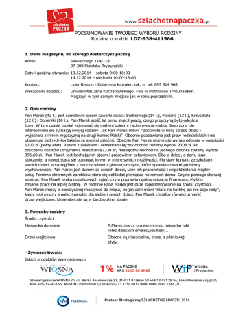 PODSUMOWANIE TWOJEGO WYBORU RODZINY Rodzina o kodzie LDZ-938-411566 1. Dane magazynu, do którego dostarczysz paczkę Adres: Słowackiego 114/118 97-300 Piotrków Trybunalski Daty i godziny otwarcia: 13.12.2014 – sobota 9:00-18:00 14.12.2014 – niedziela 10:00-18:00 Kontakt: Lider Rejonu - Katarzyna Kaźmierczak, nr tel. 693 614 968 Wskazówki dojazdu: Uniwersytet Jana Kochanowskiego, Filia w Piotrkowie Trybunalskim. Magazyn w tym samym miejscu jak w roku poprzednim. 2. Opis rodziny Pan Marek (42 l.) jest samotnym ojcem czwórki dzieci: Bartłomieja (14 l.), Marcina (13 l.), Krzysztofa (12 l.) i Dominiki (10 l.). Pan Marek sześć lat temu stracił pracę, czego przyczyną było odejście żony. W tym czasie musiał zajmować się małymi dziećmi i schorowana matką. Jego żona nie interesowała się sytuacją swojej rodziny. Jak Pan Marek mówi: "Zostawiła w nocy śpiące dzieci i wyjechała z innym mężczyzną na drugi koniec Polski". Obecnie pozbawiona jest praw rodzicielskich i nie utrzymuje żadnych kontaktów ze swoimi dziećmi. Obecnie Pan Marek otrzymuje wynagrodzenie w wysokości 1200 zł (pełny etat). Razem z zasiłkiem i alimentami łączny dochód rodziny wynosi 2308 zł. Po odliczeniu kosztów utrzymania mieszkania (330 zł) miesięczny dochód na jednego członka rodziny wynosi 395,60 zł. Pan Marek jest kochającym ojcem i pracowitym człowiekiem. Dba o dzieci, o dom, jego otoczenie, a nawet stara się pomagać innym w miarę swoich możliwości. Ma stały kontakt ze szkołami swoich dzieci, a szczególnie z nauczycielami z gimnazjum syna, który sprawia czasami problemy wychowawcze. Pan Marek jest dumny ze swoich dzieci, uczy ich pracowitości i współdziałania między sobą. Pomimo skromnych zarobków stara się odkładać pieniądze na remont domu. Często pomaga starszej siostrze. Pan Marek szuka dodatkowych zajęć, czym poprawia ogólną sytuację finansową. Myśli o zmianie pracy na lepiej płatną. W rodzinie Pana Marka jest duże zapotrzebowanie na środki czystości. Pan Marek marzy o elektrycznej maszynce do mięsa, bo jak sam mówi "stara na korbkę już nie daje rady", kiedy robi pyszny smalec i pasztet dla siebie i swoich dzieci. Pan Marek chciałby również zmienić drzwi wejściowe, które obecnie są w bardzo złym stanie. 3. Potrzeby rodziny Środki czystości Maszynka do mięsa P.Marek marzy o maszynce do mięsa,bo lubi robić dzieciom smalec,pasztety... Drzwi wejściowe Obecne są nieszczelne, stare, z pilśniowej płyty. - Żywność trwała: Jakich produktów żywnościowych PODSUMOWANIE TWOJEGO WYBORU RODZINY Rodzina o kodzie LDZ-938-411566 potrzebuje rodzina: Herbata, Mąka, Cukier, Olej, Dżem - Środki czystości Jakich środków czystości potrzebuje rodzina: Proszek do prania, Szampon, Pasta do zębów, Mydło/żel myjący - Wyposażenie mieszkania Jakiego wyposażenia mieszkania potrzebuje rodzina: Kołdra, Koc, Poduszka, Pościel, Ręczniki Brakujące sprzęty: Maszynka elektryczna do mięsa, Mikser do wyrabiania ciast, Pan Marek posiada ręczną maszynkę do mięsa, która jest już mocno zniszczona. Marzy Mu się nowa maszynka elektryczna, która skróci czas wyrobu smalcu i pasztetów. Mikser pozwoli na zaangażowanie dzieci do wyrabiania ciast. - Inne potrzeby Węgiel na zimę, Drzwi wejściowe - Specjalne upominki Sukienka dla córki (146cm), a dla chłopców zestaw do siatkówki plażowej- często o tym mówią. 4. Osoby opiekujące sie rodziną - Wolontariusz opiekun rodziny E-mail: [email protected] Telefon: 609502471 - Lider Rejonu Imię i nazwisko: Katarzyna Kaźmierczak 5. Jak zapakować paczkę * Paczki można dostarczyć wyłącznie do tego magazynu, z którego wybrana została rodzina. * Pamiętaj, że po wybraniu przez Ciebie rodziny nikt inny nie będzie już dla niej przygotowywał PODSUMOWANIE TWOJEGO WYBORU RODZINY Rodzina o kodzie LDZ-938-411566 paczki. * Nie musisz zaspokoić wszystkich potrzeb rodziny, zwróć jednak uwagę, że wszystkie wymienione rzeczy są dla rodziny bardzo ważne. * Rzeczy, które podarujesz rodzinie powinny być dla niej prezentem. Nie muszą być one nowe, a jeśli są używane, zawsze przygotowane z myślą o drugim człowieku. Przygotuj więc paczkę tak, by podniosła poczucie własnej wartości u obdarowanych przez Ciebie osób. Wskazówki do przygotowania Paczki: * paczki powinny być podzielone na kilka, poręcznych, niezbyt ciężkich pudeł, prosimy nie dostarczać do magazynu produktów zapakowanych w reklamówki czy worki foliowe * każde pudło powinno być opisane kodem rodziny oraz opatrzone numerem, pudła należy numerować według klucza: np. 1 z 5, 2 z 5 itd. * paczce powinny znaleźć się suche i trwałe artykuły spożywcze, prosimy, aby nie pakować do pudeł produktów, które łatwo ulegają uszkodzeniu, wylaniu, rozgnieceniu * aby prezent nabrał świątecznego charakteru można owinąć pudła kolorowym papierem Gdzie możesz zrobić zakupy do Paczki: Partnerem SZLACHETNEJ PACZKI jest MAKRO. Dzięki specjalnej karcie wstępu, możesz w sklepach MAKRO zrobić zakupy tanio i sprawnie - wystarczy przy wejściu podać do zeskanowania poniższy kod kreskowy: Dziękując za Twoje zaangażowanie w SZLACHETNĄ PACZKĘ, zapraszamy do ponownego spotkania przy rozliczaniu formularza PIT. Przekaż swój 1% na Stowarzyszenie WIOSNA. Razem zmieniamy świat na lepsze!