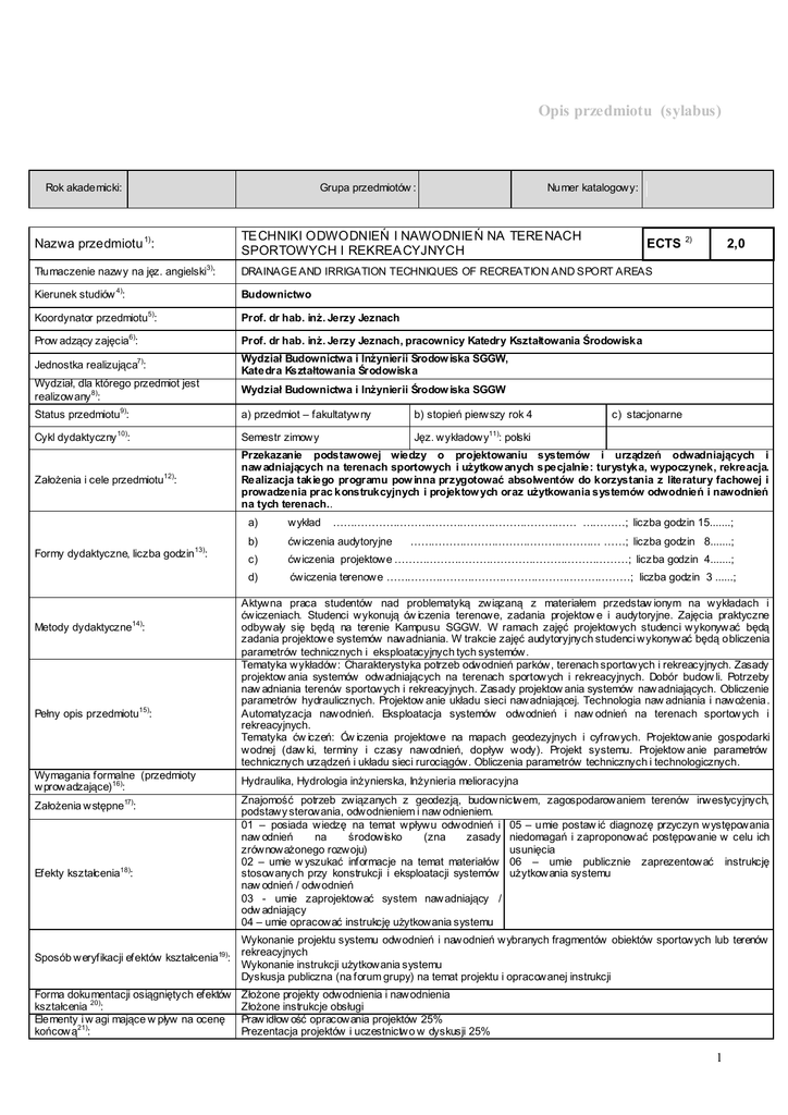 Opis przedmiotu (sylabus) Grupa przedmiotów : Rok akademicki: Numer katalogowy: Nazwa przedmiotu 1): TE CHNIKI ODWODNIEŃ I NAWODNIE Ń NA TERE NACH SPORTOWYCH I REKREA CYJNYCH Tłumaczenie nazwy na jęz. angielski3): DRAINAGE AND IRRIGATION TECHNIQUES OF RECREATION AND SPORT AREAS Kierunek studiów 4): Budownictwo 5) ECTS Koordynator przedmiotu : Prof. dr hab. inż. Jerzy Jeznach Prow adzący zajęcia6): Prof. dr hab. inż. Jerzy Jeznach, pracownicy Katedry Kształtowania Środowiska Jednostka realizująca : Wydział Budownictwa i Inżynierii Środow iska SGGW, Katedra Kształtowania Środowiska Wydział, dla którego przedmiot jest realizowany 8): Wydział Budownictwa i Inżynierii Środow iska SGGW Status przedmiotu9): a) przedmiot – fakultatywny 7) 10) b) stopień pierwszy rok 4 2) 2,0 c) stacjonarne 11) Jęz. wykładowy : pols ki Cykl dydaktyczny : Semestr zimowy Założenia i cele przedmiotu12): Przekazanie podstawowej wiedzy o projektowaniu systemów i urządzeń odwadniających i naw adniających na terenach sportowych i użytkow anych specjalnie: turystyka, wypoczynek, rekreacja. Realizacja takiego programu pow inna przygotować absolwentów do korzystania z literatury fachowej i prowadzenia prac konstrukcyjnych i projektow ych oraz użytkowania systemów odwodnień i nawodnień na tych terenach.. Formy dydaktyczne, liczba godzin13): Metody dydaktyczne14): Pełny opis przedmiotu15): Wymagania formalne (przedmioty wprowadzające) 16): Założenia wstępne17): Efekty kształc enia18): a) wykład …………………………………………………………… …………; liczba godzin 15.......; b) ćwiczenia audytoryjne c) ćwiczenia projektowe …………………………………………………………; liczba godzin 4.......; d) ćwiczenia terenowe ……………………………………………………………; liczba godzin 3 ......; ……………………………………………… ……; liczba godzin 8.......; Aktywna praca studentów nad problematyką związaną z materiałem przedstaw ionym na wykładach i ćwiczeniach. Studenci wykonują ćw ic zenia terenowe, zadania projektow e i audytoryjne. Zajęcia praktyczne odbywały się będą na terenie Kampusu SGGW. W ramach zajęć projektowych studenci wykonywać będą zadania projektowe systemów nawadniania. W trakcie zajęć audytoryjnych studenci wykonywać będą obliczenia parametrów technicznych i eksploatacyjnych tych systemów. Tematyka wykładów: Charakterystyka potrzeb odwodnień parków, terenach sportowych i rekreacyjnych. Zasady projektow ania systemów odwadniających na terenach sportowych i rekreacyjnych. Dobór budow li. Potrzeby naw adniania terenów sportowych i rekreacyjnych. Zasady projektow ania systemów nawadniających. Obliczenie parametrów hydraulicznych. Projektow anie układu sieci nawadniającej. Technologia naw adniania i nawożenia. Automatyzacja nawodnień. Eksploatacja systemów odwodnień i naw odnień na terenach sportowych i rekreacyjnych. Tematyka ćw ic zeń: Ćw ic zenia projektowe na mapach geodezyjnych i cyfrowych. Projektowanie gospodarki wodnej (daw ki, terminy i czasy nawodnień, dopływ wody). Projekt systemu. Projektow anie parametrów technicznych urządzeń i układu sieci rurociągów. Obliczenia parametrów technicznych i technologicznych. Hydraulika, Hydrologia inżynierska, Inżynieria melioracyjna Znajomość potrzeb związanych z geodezją, budownictw em, zagospodarowaniem terenów inwestycyjnych, podstawy sterowania, odwodnieniem i naw odnieniem. 01 – posiada wiedzę na temat wpływu odwodnień i 05 – umie postaw ić diagnozę przyczyn występowania naw odnień na środowis ko (zna zasady niedomagań i zaproponować postępowanie w celu ich zrównoważonego rozwoju) usunięcia 02 – umie w yszukać informacje na temat materiałów 06 – umie publicznie zaprezentować instrukcję stosowanych przy konstrukcji i eksploatacji systemów użytkowania systemu naw odnień / odwodnień 03 - umie zaprojektować system nawadniający / odw adniający 04 – umie opracować instrukcję użytkowania systemu Sposób weryfikacji efektów kształcenia19): Wykonanie projektu systemu odwodnień i nawodnień wybranych fragmentów obiektów sportowych lub terenów rekreacyjnych Wykonanie instrukcji użytkowania systemu Dyskusja publiczna (na forum grupy) na temat projektu i opracowanej instrukcji Forma dokumentacji osiągniętych efektów kształcenia 20): Elementy i w agi mające w pływ na ocenę końcową21): Złożone projekty odwodnienia i nawodnienia Złożone instrukcje obsługi Praw idłow ość opracowania projektów 25% Prezentacja projektów i uczestnictw o w dyskusji 25% 1 Praw idłow ość wykonania instrukcji 25% Prezentacja instrukcji i uczestnictw o w dyskusji 25% Miejsce realizacji zajęć22): Teren kampusu Uczelni, Sala dydaktyczna, Pracownie komputerowe 23) Literatura podstawowa i uzupełniająca : 1. JEZNACH J. 2012: Materiały dydaktyczne: Nawadnianie terenów zurbanizowanych. Maszynopisy SGGW. Płyty CD. 2. JEZ NACH J., TREDER W. 2006: Naw adnianie roślin w szklarniach i pod osłonami. W: „Naw adnianie roślin” Red. Karczmarczyk S., Now ak L. PWRiL. Poznań. 233 – 267. 3. JEZ NACH J., MOSIEJ J. 2006: Naw adnianie trwały ch użytków zielonych. W: „Nawadnianie roślin” Red. Karczmarczyk S., Now ak L. PWRiL. Poznań. 445 – 460. 4. JEZ NACH J. 2005: Przyrodnic ze problemy nawodnień. Postępy Nauk Rolniczych. Nr 3/2005. 125 – 134. 5. JEZ NACH J. 2005: Techniczne problemy nawodnień. Postępy Nauk Rolniczych. Nr 3/2005. 135 – 145. 3. 6. KARCZMARCZYK S., NOWAK L. (Red.) 2006: Naw adnianie roślin. PWRiL. 7. OSTROMĘCKI J. 1973: Podstawy melioracji nawadniających. PWN. 8. PROCHAL P. (Red.) 1986: Podstawy melioracji rolnych. PWRiL. UWAGI24): Wskaźniki ilościowe charakteryzujące moduł/przedmiot 25) Szacunkowa sumaryczna liczba godzin pracy studenta (kontaktowych i pracy własnej) niezbędna dla osiągnięcia zakła