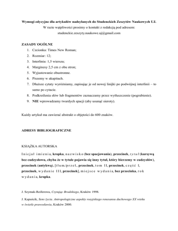 Wymogi edycyjne dla artykułów nadsyłanych do Studenckich Zeszytów Naukowych UJ. W razie wątpliwości prosimy o kontakt z redakcją pod adresem: [email protected] ZASADY OGÓLNE 1. Czcionka: Times New Roman; 2. Rozmiar: 12; 3. Interlinia: 1,5 wiersza; 4. Marginesy 2,5 cm z obu stron; 5. Wyjustowanie obustronne. 6. Piszemy w akapitach. 7. Dłuższe cytaty wyróżniamy, zapisując je od nowej linijki po podwójnej interlinii – to samo po cytacie. 8. Podkreślenia słów lub fragmentów zaznaczamy przez wytłuszczenie (pogrubienie). 9. NIE wprowadzamy twardych spacji (aby usunąć sieroty). Każdy artykuł ma zawierać abstrakt o objętości do 600 znaków. ADRESY BIBLIOGRAFICZNE KSIĄŻKA AUTORSKA I n i c j a ł i m i e n i a, kropka, n a z w i s k o (bez spacjowania), przecinek, t y t u ł (kursywą bez cudzysłowu, chyba że w tytule pojawia się inny tytuł, który bierzemy w cudzysłów), przecinek (antykwą), [t ł u m./p r z e ł., przecinek, t o m I I, przecinek, c z ę ś ć I, przecinek, w y d a n i e I I I, przecinek], m i e j s c e w y d a n i a, bez przecinka, r o k w y d a n i a, kropka. J. Szymak-Reiferowa, Czytając Brodskiego, Kraków 1998. J. Kapuścik, Sens życia. Antropologiczne aspekty rosyjskiego renesansu duchowego XX wieku w świetle prawosławia, Kraków 2000. PRACA ZBIOROWA Historia literatury rosyjskiej XX wieku, red. A. Drawicz, Warszawa 1997. ARTYKUŁ (rozdział autorski) w tomie prac / w pracy zbiorowej: I n i c j a ł i m i e n i a, kropka, n a z w i s k o (bez spacjowania!), przecinek, t y t u ł (kursywą bez cudzysłowu, chyba że w tytule pojawia się inny tytuł, który bierzemy w cudzysłów), przecinek (antykwą!), [w:] bez przecinka, t y t u ł k s i ą ż k i (kursywą), przecinek (antykwą!), r e d., bez przecinka, i n i c j a ł i m i e n i a, kropka, n a z w i s k o, przecinek, m i e j s c e w y d a n i a, bez przecinka, r o k w y d a n i a, przecinek, s. 111–119, kropka. E. Korpała-Kirszak, Adelajda Gercyk. Próba portretu, [w:] Literatura rosyjska przełomu XIX i XX wieku, red. I. Fijałkowska-Janiak, Gdańsk 1998, s. 139–146. P. Fast, Realizm socjalistyczny, [w:] Historia literatury rosyjskiej XX wieku, red. A. Drawicz, Warszawa 1997, s. 329–370. ARTYKUŁ W ZESZYTACH NAUKOWYCH: I n i c j a ł i m i e n i a, kropka, n a z w i s k o (bez spacjowania!), przecinek, t y t u ł (kursywą bez cudzysłowu, chyba że w tytule pojawia się inny tytuł, który bierzemy w cudzysłów), przecinek (antykwą!), w cudzysłowie n a z w a z e s z y t ó w (ewentualnie – kursywą – tytuł serii), przecinek, nr/t./z. 22, przecinek, r e d. i dalej jw. J. Smaga, Aktualny stan teorii realizmu socjalistycznego, „Zeszyty Naukowe Uniwersytetu Jagiellońskiego”, DCCXXXVII: Prace historycznoliterackie, z. 57, red. M. Tatara, Warszawa– Kraków 1985, s. 157. ARTYKUŁ W CZASOPIŚMIE: I n i c j a ł i m i e n i a, kropka, n a z w i s k o (bez spacjowania!), przecinek, t y t u ł (kursywą bez cudzysłowu, chyba że w tytule pojawia się inny tytuł, który bierzemy w cudzysłów), przecinek (antykwą!), w cudzysłowie t y t u ł c z a s o p i s m a, bez przecinka, r o k w y d a n i a, przecinek, nr 1, przecinek, s. 123–132, kropka. K. Pietrzycka-Bohosiewicz, Nowa proza o wojnie. Gieorgij Władimow: „Generał i jego armia”, „Slavia Orientalis” 1998, nr 4, s. 585–600. GAZETA W cudzysłowie „Nazwa gazety”, przecinek, data numeru, przecinek, numer w roku (numer całościowy), przecinek, strona, kropka. „Dziennik Polski”, 5 VI 2007, nr 5 (5785), s. 7. PRZYPISY 1. Pierwsze powołanie się na źródło: jw.; 2. Cytowanie innej pracy autora z poprzedniego przypisu – zamiast powtórzenia nazwiska: idem/eadem, dalej jw.; 3. Odesłanie do pracy przywołanej w poprzednim przypisie: Ibidem (kursywą), s. 233; 4. Kolejne przywołanie pracy (z przypisu wcześniejszego, lecz nie bezpośrednio poprzedzającego): skrócony zapis (z zachowaniem interpunkcji jw.): i n i c j a ł i m i e n i a, n a z w i s k o, p o c z ą t e k t y t u ł u (kursywą), wielokropek, przecinek (antykwą!), s. 231.; 5. Wszelkie „informacje techniczne” (t. [tom], r. [rocznik], nr, ks. [księga], z. [zeszyt], wyd., red./pod red., tłum. // т., №, кн., изд., ред., пер. // Vol., Band, no., Ed., hrsg., tr. itp.) spisujemy z karty tytułowej i podajemy w wersji językowej cytowanego źródła. 6. Jeśli nie cytujemy dosłownie, a jedynie odsyłamy do jakiegoś tekstu, przed adresem bibl. w przypisie stawiamy: Por. / Zob. / Patrz: (np. Szerzej na ten temat zob. / patrz: D. A. Frick, Meletij Smotryc’kyj…, s. 352–354). 1 H. Waszkielewicz, Motyw „starej Rusi” w literaturze modernizmu rosyjskiego, [w:] Literatura rosyjska. Nowe zjawiska. Reinterpretacje, (=Prace Naukowe Uniwersytetu Śląskiego w Katowicach, nr 1508), pod red. B. Stempczyńskiej, Katowice 1995, s. 75. 2 Eadem, Рассказ Ивана Бунина „Игнат” в переводе Марии Лесневской, [w:] Иван Бунин и его время, pod red. H. Waszkielewicz, Kraków 2001, s. 126. 3 Ibidem, s. 124. 4 A. Gildner, Awangarda rosyjska z perspektywy 1994 roku, [w:] Literatura rosyjska..., s. 110. 5 H. Waszkielewicz, Рассказ Ивана Бунина..., s. 125. LINKI INTERNETOWE 1. Przypisy, które odnoszą się do źródeł internetowych zapisujemy w następujący sposób: data dostępu (cyframi arabskimi dzień, cyframi arabskimi miesiąc, pełna data roku – wszystkie człony oddzielona kropką), następne spacja i link internetowy. 2. Link internetowy pozbawiamy formatowania (ma mieć tylko formę tekstową). 3. Z linku usuwany początek w postaci http:// 1 H. Kettunen, Ch. Helmke, Wprowadzenie do hieroglifów Majów, Podręcznik dla uczestników warsztatów, „WAYEB: European Association of Mayanists”, trzecie wydanie, 2011, s. 24, 20.07.2012 www.wayeb.org/download/resources/wh2011polish.pdf. BIBLIOGRAFIA, forma graficzna 1. Bibliografii nie zapisuj