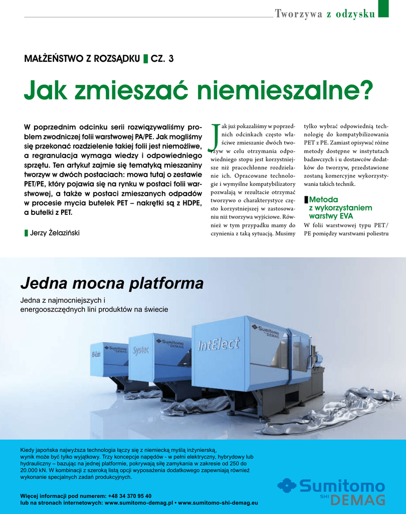 Tworzywa z odzysku Małżeństwo z rozsądku Cz. 3 Jak zmieszać niemieszalne? W poprzednim odcinku serii rozwiązywaliśmy problem zwodniczej folii warstwowej PA/PE. Jak mogliśmy się przekonać rozdzielenie takiej folii jest niemożliwe, a regranulacja wymaga wiedzy i odpowiedniego sprzętu. Ten artykuł zajmie się tematyką mieszaniny tworzyw w dwóch postaciach: mowa tutaj o zestawie PET/PE, który pojawia się na rynku w postaci folii warstwowej, a także w postaci zmieszanych odpadów w procesie mycia butelek PET – nakrętki są z HDPE, a butelki z PET. Jerzy Żelaziński J ak już pokazaliśmy w poprzednich odcinkach często właściwe zmieszanie dwóch tworzyw w celu otrzymania odpowiedniego stopu jest korzystniejsze niż pracochłonne rozdzielanie ich. Opracowane technologie i wymyślne kompatybilizatory pozwalają w rezultacie otrzymać tworzywo o charakterystyce często korzystniejszej w zastosowaniu niż tworzywa wyjściowe. Również w tym przypadku mamy do czynienia z taką sytuacją. Musimy tylko wybrać odpowiednią technologię do kompatybilizowania PET z PE. Zamiast opisywać różne metody dostępne w instytutach badawczych i u dostawców dodatków do tworzyw, przedstawione zostaną komercyjne wykorzystywania takich technik. Metoda z wykorzystaniem warstwy EVA W folii warstwowej typu PET/ PE pomiędzy warstwami poliestru Jedna mocna platforma Jedna z najmocniejszych i HQHUJRRV]F]ĊGQ\FKOLQLSURGXNWyZQDĞZLHFLH .LHG\MDSRĔVNDQDMZ\ĪV]DWHFKQRORJLDáąF]\VLĊ]QLHPLHFNąP\ĞOąLQĪ\QLHUVNą Z\QLNPRĪHE\üW\ONRZ\MąWNRZ\7U]\NRQFHSFMHQDSĊGyZZSHáQLHOHNWU\F]Q\K\EU\GRZ\OXE K\GUDXOLF]Q\±ED]XMąFQDMHGQHMSODWIRUPLHSRNU\ZDMąVLáĊ]DP\NDQLDZ]DNUHVLHRGGR N1:NRPELQDFML]V]HURNąOLVWąRSFMLZ\SRVDĪHQLDGRGDWNRZHJR]DSHZQLDMąUyZQLHĪ Z\NRQDQLHVSHFMDOQ\FK]DGDĔSURGXNF\MQ\FK :LĊFHMLQIRUPDFMLSRGQXPHUHP OXEQDVWURQDFKLQWHUQHWRZ\FKZZZVXPLWRPRGHPDJSOZZZVXPLWRPRVKLGHPDJHX PlastNews 7-8’2011 27 Tworzywa z odzysku i polietylenu często stosowana jest warstwa kopolimeru typu EVA. Taki materiał może być jednocześnie kompatybilizatorem dla związania tworzyw. Wykorzystała ten fakt pewna hiszpańska firma tworząc swoją technologię recyklingu. We współpracy z wiodącym europejskim producentem urządzeń do recyklingu opracowała specjalną maszynę do wytłaczania włosia (monofilamentu) w jednym przebiegu. W wytłaczarkę do regranulacji PET wyposażoną w suszarkę krystalizacyjną wmontowano specjalną głowicę do formowania włosia oraz cały segment jego kondycjonowania. Jako wsad do tej maszyny służy odpadowa folia PET/PE, kompatybilizatora nie używa się, bo jest już wewnątrz folii. Maszyna najpierw suszy porcję odpadów foliowych, a następnie wytłacza z nich nitki, z których wytwarza się włosie do różnego rodzaju szczotek. Dzięki zmieszaniu PET z PE otrzymane tworzywo jest bardziej elastyczne (a przez to trwałe jako włosie) i mniej higroskopijne. W rezultacie otrzymaliśmy wyrób trwalszy od oryginału nie wspominając o tym, że surowiec mamy za półdarmo. Trzy lata temu hiszpańska firma zaczynała produkcję włosia z odpadów na jednej maszynie, aktualnie pracują już dwie tego typu linie wytwórcze. Wykorzystanie frakcji z recyklingu butelek Kiedy nie mamy folii warstwowej możemy postąpić inaczej. W procesie mycia butelek PET powstają uboczne frakcje butelek o kolorach mieszanych oraz występują tam odpady nakrętek HDPE. Możemy te frakcje połączyć razem otrzymując granulat, który parametrami wytrzymałościowymi będzie się lokował pomiędzy PET a HDPE, 28 PlastNews 7-8’2011 który w odróżnieniu od samego PET nie będzie wymagał suszenia przed przetworzeniem. Aby taki granulat otrzymać musimy oczywiście użyć odpowiedniego kompatybilizatora. W grę wchodzi cała gama środków: od sfunkcjonalizowanego polietylenu po specjalnie chemicznie modyfikowane nanoglinki. Oprócz kompatybilizatora niezbędna będzie odpowiednia maszyna do regranulacji: suszarka krystalizacyjna, odpowiednio duże L/D oraz wydajne odgazowanie próżniowe. Maszyny takie wytwarza jeden z producentów urządzeń do regranulacji. Dwie firmy jedna z Belgii, a druga z Wielkiej Brytanii niezależnie od siebie wdrożyły technologię otrzymywania miksu PET/HDPE do zastosowania we własnym zakresie. Belgijska firma jest producentem palet transportowych metodą wtryskowa z HDPE. Po wdrożeniu technologii wytwarzania regranulatu PET/PE możliwe się stało zastosowanie go do wyrobu palet w zastępstwie za pierwotny surowiec. Połączenie PET i PE może w rezultacie przynieść niezwykłe właściwości. Tworzywo mieszane jest mniej kruche niż z czystego PET i nie musi już być wysuszone przed przetwarzaniem. Wyroby są sztywniejsze, tworzywo lepiej płynie oraz szybciej zastyga niż HDPE, więc możemy skrócić cykl wtrysku i wcześniej wyjmować z formy gotowe wyroby. W przypadku produktów grubościennych, takich jak palety ma to szczególnie istotne znaczenie. Łatwiejsze płynięcie przełożyło się na możliwość obniżenia temperatury przetwórstwa oraz wtrysku, czyli zaoszczędzono na energii elektrycznej. Dodatkową zaletą okazała się również większa sztywność wyrobu, dzięki czemu można było pocienić ścianki palety, a to spowodowało dalsze oszczędności na surowcu. Dzięki tym rozwiązaniom belgijska firma może sprzedawać swoje palety w cenie porównywalnej z ceną palet drewnianych. Dotychczas palety drewniane były o ok. 30% tańsze od plastykowych. Produkcja palet z miksu PET/PE trwa już prawie rok. chód wchodzi 30% rur więcej. Już trzy lata firma wytwarza rury tą techniką. Przygotowanie granulatu Pewna brytyjska firma specjalizuje się w produkcji rur korugowanych o podwójnych ściankach dla drenaży autostradowych z HDPE oraz PVC metodą wytłaczania z formowaniem próżniowym. W jej przypadku zastosowanie zamiast oryginalnych surowców miksu PET/PE dało zysk nie tylko dzięki zaoszczędzeniu na zakupie surowca, ale przede wsz