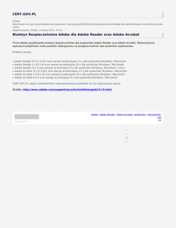 CERT.GOV.PL Źródło: http://www.cert.gov.pl/cer/wiadomosci/poprawki-i-aktualizacj/601,Biuletyn-Bezpieczenstwa-Adobe-dla-Adobe-Reader-oraz-Adobe-Acroba t.html Wygenerowano: Piątek, 3 marca 2017, 22:33 Biuletyn Bezpieczeństwa Adobe dla Adobe Reader oraz Adobe Acrobat Firma Adobe opublikowała biuletyn bezpieczeństwa dla programów Adobe Reader oraz Adobe Acrobat. Wykorzystanie wykrytych podatności może pozwolić atakującemu na przejęcie kontroli nad systemem użytkownika. Podatne wersje: ● ● ● ● ● ● Adobe Reader XI (11.0.02) oraz wersje wcześniejsze 11.x dla systemów Windows i Macintosh Adobe Reader X (10.1.6) oraz wersje wcześniejsze 10.x dla systemów Windows i Macintosh Adobe Reader 9.5.4 oraz wersje wcześniejsze 9.x dla systemów Windows, Macintosh i Linux Adobe Acrobat XI (11.0.02) oraz wersje wcześniejsze 11.x dla systemów Windows i Macintosh Adobe Acrobat X (10.1.6) oraz wersje wcześniejsze 10.x dla systemów Windows i Macintosh Adobe Acrobat 9.5.4 oraz wersje wcześniejsze 9.x dla systemów Windows i Macintosh CERT.GOV.PL zaleca użytkownikom zaktualizowanie produktów do ich najnowszych wersji. Źródło: http://www.adobe.com/support/security/bulletins/apsb13-15.html Ocena: 0/5 (0) Adobe, Adobe Reader, Adobe Acrobat, podatności, aktualizacje, luki KM