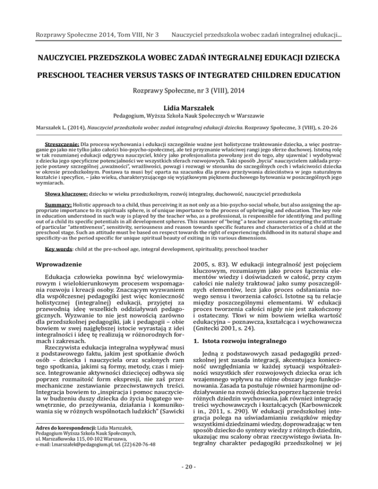 Rozprawy Społeczne 2014, Tom VIII, Nr 3 Nauczyciel przedszkola wobec zadań integralnej edukacji... NAUCZYCIEL PRZEDSZKOLA WOBEC ZADAŃ INTEGRALNEJ EDUKACJI DZIECKA PRESCHOOL TEACHER VERSUS TASKS OF INTEGRATED CHILDREN EDUCATION Rozprawy Społeczne, nr 3 (VIII), 2014 Lidia Marszałek Pedagogium, Wyższa Szkoła Nauk Społecznych w Warszawie Marszałek L. (2014), Nauczyciel przedszkola wobec zadań integralnej edukacji dziecka. Rozprawy Społeczne, 3 (VIII), s. 20-26 Streszczenie: Dla procesu wychowania i edukacji szczególnie ważne jest holistyczne traktowanie dziecka, a więc postrzeganie go jako nie tylko jako całości bio-psycho-społecznej, ale też przyznanie właściwej rangi jego sferze duchowej. Istotną rolę w tak rozumianej edukacji odgrywa nauczyciel, który jako profesjonalista powołany jest do tego, aby ujawniać i wydobywać z dziecka jego specy iczne potencjalności we wszystkich sferach rozwojowych. Taki sposób „bycia” nauczycielem zakłada przyjęcie postawy szczególnej „uważności”, wrażliwości, powagi i rozwagi w stosunku do szczególnych cech i właściwości dziecka w okresie przedszkolnym. Postawa ta musi być oparta na szacunku dla prawa przeżywania dzieciństwa w jego naturalnym kształcie i specy ice, – jako wieku, charakteryzującego się wyjątkowym pięknem duchowego bytowania w poszczególnych jego wymiarach. Słowa kluczowe: dziecko w wieku przedszkolnym, rozwój integralny, duchowość, nauczyciel przedszkola Summary: Holistic approach to a child, thus perceiving it as not only as a bio-psycho-social whole, but also assigning the appropriate importance to its spirituals sphere, is of unique importance to the process of upbringing and education. The key role in education understood in such way is played by the teacher who, as a professional, is responsible for identifying and pulling out of a child its speci ic potentials in all development spheres. This manner of “being” a teacher assumes accepting the attitude of particular “attentiveness”, sensitivity, seriousness and reason towards speci ic features and characteristics of a child at the preschool stage. Such an attitude must be based on respect towards the right of experiencing childhood in its natural shape and speci icity-as the period speci ic for unique spiritual beauty of exiting in its various dimensions. Key words: child at the pre-school age, integral development, spirituality, preschool teacher Wprowadzenie Edukacja człowieka powinna być wielowymiarowym i wielokierunkowym procesem wspomagania rozwoju i kreacji osoby. Znaczącym wyzwaniem dla współczesnej pedagogiki jest więc konieczność holistycznej (integralnej) edukacji, przyjętej za przewodnią ideę wszelkich oddziaływań pedagogicznych. Wyzwanie to nie jest nowością zarówno dla przedszkolnej pedagogiki, jak i pedagogii – obie bowiem w swej najgłębszej istocie wyrastają z idei integralności i ideę tę realizują w różnorodnych formach i zakresach. Rzeczywista edukacja integralna wypływać musi z podstawowego faktu, jakim jest spotkanie dwóch osób – dziecka i nauczyciela oraz scalonych ram tego spotkania, jakimi są formy, metody, czas i miejsce. Integrowanie aktywności dziecięcej odbywa się poprzez rozmaitość form ekspresji, nie zaś przez mechaniczne zestawianie przeciwstawnych treści. Integracja bowiem to „inspiracja i pomoc nauczyciela w budzeniu duszy dziecka do życia bogatego wewnętrznie, do przeżywania, działania i komunikowania się w różnych wspólnotach ludzkich” (Sawicki Adres do korespondencji: Lidia Marszałek, Pedagogium Wyższa Szkoła Nauk Społecznych, ul. Marszałkowska 115, 00-102 Warszawa, e-mail: l.marszał[email protected], tel. (22) 620-76-48 2005, s. 83). W edukacji integralność jest pojęciem kluczowym, rozumianym jako proces łączenia elementów wiedzy i doświadczeń w całość, przy czym całości nie należy traktować jako sumy poszczególnych elementów, lecz jako proces odsłaniania nowego sensu i tworzenia całości. Istotne są tu relacje między poszczególnymi elementami. W edukacji proces tworzenia całości nigdy nie jest zakończony i ostateczny. Tkwi w nim bowiem wielka wartość edukacyjna – poznawcza, kształcąca i wychowawcza (Gnitecki 2001, s. 24). 1. Istota rozwoju integralnego Jedną z podstawowych zasad pedagogiki przedszkolnej jest zasada integracji, akcentująca konieczność uwzględniania w każdej sytuacji współzależności wszystkich sfer rozwojowych dziecka oraz ich wzajemnego wpływu na różne obszary jego funkcjonowania. Zasada ta postuluje również harmonijne oddziaływanie na rozwój dziecka poprzez łączenie treści różnych dziedzin wychowania, jak również integrację treści wychowawczych i kształcących (Karbowniczek i in., 2011, s. 290). W edukacji przedszkolnej integracja polega na uświadamianiu związków między wszystkimi dziedzinami wiedzy, doprowadzając w ten sposób dziecko do syntezy wiedzy z różnych dziedzin, ukazując mu scalony obraz rzeczywistego świata. Integralny charakter pedagogiki przedszkolnej w jej - 20 - Rozprawy Społeczne 2014, Tom VIII, Nr 3 Nauczyciel przedszkola wobec zadań integralnej edukacji... podstawowych założeniach implikuje odniesienia w obrębie przedszkolnej pedagogii, znajdując odzwierciedlenie w całej działalności przedszkola – integrowaniu procesów kształcenia i wychowania, treści programowych, form i metod działania, środowisk przedszkola i rodziny, uwzględniania we wszelkich działaniach pedagogicznych holistycznej wizji dziecka, co niesie ze sobą konieczność liczenia się w każdej sytuacji ze współzależnością rozwoju somatycznego i psychicznego dziecka, wpływem zdrowia i dobrego samopoczucia na jego zachowanie, wpływem przeżyć emocjonalnych, zabawy i innych form aktywności na funkcjonowanie całego jego organizmu. Wydawać się więc może, iż pedagogika przedszkolna, wraz ze swym praktycznym wymiarem w pełni odpowiada 