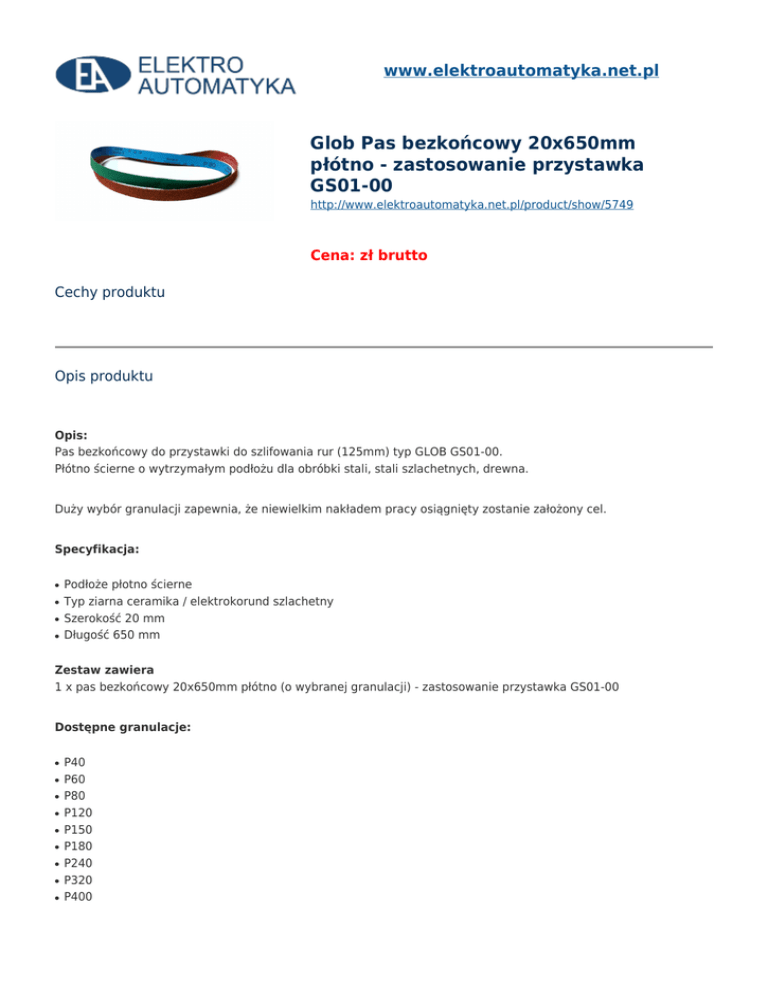 www.elektroautomatyka.net.pl Glob Pas bezkońcowy 20x650mm płótno - zastosowanie przystawka GS01-00 http://www.elektroautomatyka.net.pl/product/show/5749 Cena: zł brutto Cechy produktu Opis produktu Opis: Pas bezkońcowy do przystawki do szlifowania rur (125mm) typ GLOB GS01-00. Płótno ścierne o wytrzymałym podłożu dla obróbki stali, stali szlachetnych, drewna. Duży wybór granulacji zapewnia, że niewielkim nakładem pracy osiągnięty zostanie założony cel. Specyfikacja: ● ● ● ● Podłoże płotno ścierne Typ ziarna ceramika / elektrokorund szlachetny Szerokość 20 mm Długość 650 mm Zestaw zawiera 1 x pas bezkońcowy 20x650mm płótno (o wybranej granulacji) - zastosowanie przystawka GS01-00 Dostępne granulacje: ● ● ● ● ● ● ● ● ● P40 P60 P80 P120 P150 P180 P240 P320 P400 ELEKTRO-AUTOMATYKA Sprzedaż elektronarzędzi, urządzeń spawalniczych, maszyn budowlanych, pneumatyki, narzędzi warsztatowych, firmowych ubrań roboczych oraz maszyn ogrodowo leśnych. Sklep Bochnia ul. Brzeska 50 32-700 Bochnia Sklep Brzesko ul. Szarych Szeregów 23 32-800 Brzesko Serwis, Magazyn ul. Św. Brata Alberta 4 32-800 Brzesko tel. 691 572 333 e-mail: [email protected] tel. 609 523 230 e-mail: [email protected] tel. 609 523 645 e-mail: [email protected]