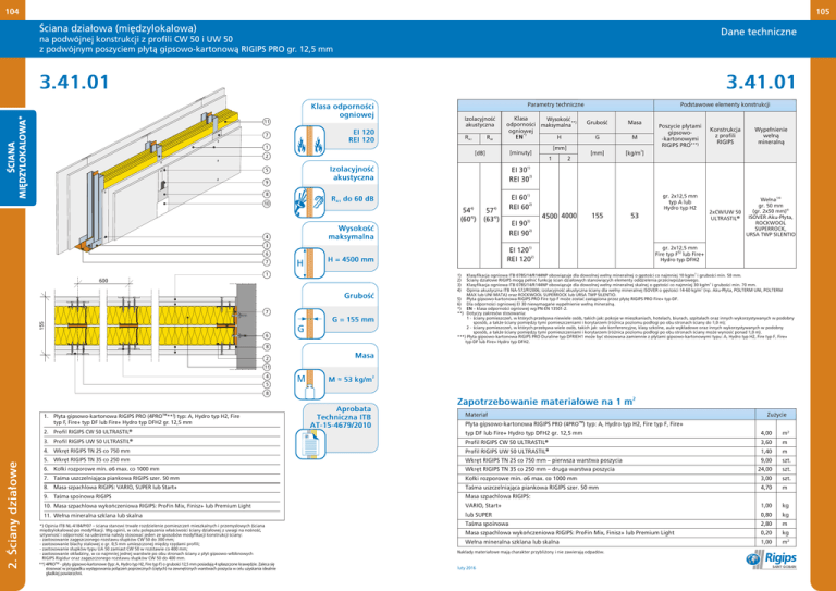 105 104 Ściana działowa (międzylokalowa) Dane techniczne na podwójnej konstrukcji z profili CW 50 i UW 50 z podwójnym poszyciem płytą gipsowo-kartonową RIGIPS PRO gr. 12,5 mm 3.41.01 3.41.01 Parametry techniczne ŚCIANA MIĘDZYLOKALOWA* Klasa odporności ogniowej Izolacyjność akustyczna 11 EI 120 REI 120 7 RA1 RW Klasa Wysokość odporności maksymalna**) ogniowej *) EN H 1 5 9 8 10 RA1 do 60 dB EI 60 2) REI 60 574) (634)) H = 4500 mm Grubość 7 G = 155 mm 155 M [mm] [kg/m2] Poszycie płytami gipsowo-kartonowymi RIGIPS PRO***) Konstrukcja z profili RIGIPS Wypełnienie wełną mineralną EI 903) 2) REI 90 gr. 2x12,5 mm typ A lub Hydro typ H2 4500 4000 155 53 1)4) Wełna gr. 50 mm (gr. 2x50 mm)6) 2xCW/UW 50 ISOVER Aku-Płyta, ULTRASTIL® ROCKWOOL SUPERROCK, URSA TWP SILENTIO gr. 2x12,5 mm Fire typ F5) lub Fire+ Hydro typ DFH2 Klasyfikacja ogniowa ITB 0785/14/R144NP obowiązuje dla dowolnej wełny mineralnej o gęstości co najmniej 10 kg/m3 i grubości min. 50 mm. Ściany działowe RIGIPS mogą pełnić funkcję ścian działowych stanowiących elementy oddzielenia przeciwpożarowego. 3 Klasyfikacja ogniowa ITB 0785/14/R144NP obowiązuje dla dowolnej wełny mineralnej skalnej o gęstości co najmniej 30 kg/m i grubości min. 70 mm. Opinia akustyczna ITB NA-572/P/2006; izolacyjność akustyczna ściany dla wełny mineralnej ISOVER o gęstości 14-60 kg/m3 (np. Aku-Płyta, POLTERM UNI, POLTERM MAX lub UNI MATA) oraz ROCKWOOL SUPERROCK lub URSA TWP SILENTIO. 5) Płyta gipsowo-kartonowa RIGIPS PRO Fire typ F może zostać zastąpiona przez płytę RIGIPS PRO Fire+ typ DF. 6) Dla odporności ogniowej EI 30 niewymagane wypełnienie wełną mineralną. *) EN — klasa odporności ogniowej wg PN-EN 13501-2. **) Dotyczy zakresów stosowania: 1 - ściany pomieszczeń, w których przebywa niewiele osób, takich jak: pokoje w mieszkaniach, hotelach, biurach, szpitalach oraz innych wykorzystywanych w podobny sposób, a także ściany pomiędzy tymi pomieszczeniami i korytarzem (różnica poziomu podłogi po obu stronach ściany do 1,0 m); 2 - ściany pomieszczeń, w których przebywa wiele osób, takich jak: sale konferencyjne, klasy szkolne, aule wykładowe oraz innych wykorzystywanych w podobny sposób, a także ściany pomiędzy tymi pomieszczeniami i korytarzem (różnica poziomu podłogi po obu stronach ściany może wynosić ponad 1,0 m). ***) Płyta gipsowo-kartonowa RIGIPS PRO Duraline typ DFRIEH1 może być stosowana zamiennie z płytami gipsowo-kartonowymi typu: A, Hydro typ H2, Fire typ F, Fire+ typ DF lub Fire+ Hydro typ DFH2. 1) 2) 3) 4) 600 6 G EI 1201) REI 1202) 6 1 Masa 1) Wysokość maksymalna H 2 Grubość 1) EI 30 2) REI 30 3 7 1 Izolacyjność akustyczna 544) (604)) 4 [mm] [minuty] [dB] 2 Podstawowe elementy konstrukcji G 8 Masa 2 11 4 5 M M ~ 53 kg/m2 8 2. Ściany działowe 1. Płyta gipsowo-kartonowa RIGIPS PRO (4PROTM** )) typ: A, Hydro typ H2, Fire typ F, Fire+ typ DF lub Fire+ Hydro typ DFH2 gr. 12,5 mm Aprobata Techniczna ITB AT-15-4679/2010 Zapotrzebowanie materiałowe na 1 m 2 Materiał Zużycie Płyta gipsowo-kartonowa RIGIPS PRO (4PROTM) typ: A, Hydro typ H2, Fire typ F, Fire+ 2. Profil RIGIPS CW 50 ULTRASTIL® 3. Profil RIGIPS UW 50 ULTRASTIL® Profil RIGIPS CW 50 ULTRASTIL ® 3,60 m 4. Wkręt RIGIPS TN 25 co 750 mm Profil RIGIPS UW 50 ULTRASTIL® 1,40 m 5. Wkręt RIGIPS TN 35 co 250 mm Wkręt RIGIPS TN 25 co 750 mm — pierwsza warstwa poszycia 6. Kołki rozporowe min. ø6 max. co 1000 mm Wkręt RIGIPS TN 35 co 250 mm — druga warstwa poszycia 7. Taśma uszczelniająca piankowa RIGIPS szer. 50 mm Kołki rozporowe min. ø6 max. co 1000 mm 3,00 szt. 8. Masa szpachlowa RIGIPS: VARIO, SUPER lub Start+ Taśma uszczelniająca piankowa RIGIPS szer. 50 mm 4,70 m 9. Taśma spoinowa RIGIPS Masa szpachlowa RIGIPS: 1,00 kg 10. Masa szpachlowa wykończeniowa RIGIPS: ProFin Mix, Finisz+ lub Premium Light 11. Wełna mineralna szklana lub skalna *) Opinia ITB NL-4184/P/07 — ściana stanowi trwałe rozdzielenie pomieszczeń mieszkalnych i przemysłowych (ściana międzylokalowa) po modyfikacji. Wg opinii, w celu polepszenia właściwości ściany działowej z uwagi na nośność, sztywność i odporność na uderzenia należy stosować jeden ze sposobów modyfikacji konstrukcji ściany: - zastosowanie zagęszczonego rozstawu słupków CW 50 do 300 mm; - zastosowanie blachy stalowej o gr. 0,5 mm umieszczonej między rzędami profili; - zastosowanie słupków typu UA 50 zamiast CW 50 w rozstawie co 400 mm; - zastosowanie okładziny, w co najmniej jednej warstwie po obu stronach ściany z płyt gipsowo-włóknowych RIGIPS Rigidur oraz zagęszczonego rozstawu słupków CW 50 do 400 mm. **) 4PROTM - płyty gipsowo-kartonowe (typ: A, Hydro typ H2, Fire typ F) o grubości 12,5 mm posiadają 4 spłaszczone krawędzie. Zaleca się stosować w przypadku występowania połączeń poprzecznych (ciętych) na zewnętrznych warstwach poszycia w celu uzyskania idealnie gładkiej powierzchni. typ DF lub Fire+ Hydro typ DFH2 gr. 12,5 mm VARIO, Start+ 4,00 m2 9,00 szt. 24,00 szt. lub SUPER 0,80 kg Taśma spoinowa 2,80 m Masa szpachlowa wykończeniowa RIGIPS: ProFin Mix, Finisz+ lub Premium Light 0,20 kg Wełna mineralna szklana lub skalna 1,00 m2 Nakłady materiałowe mają charakter przybliżony i nie zawierają odpadów. luty 2016