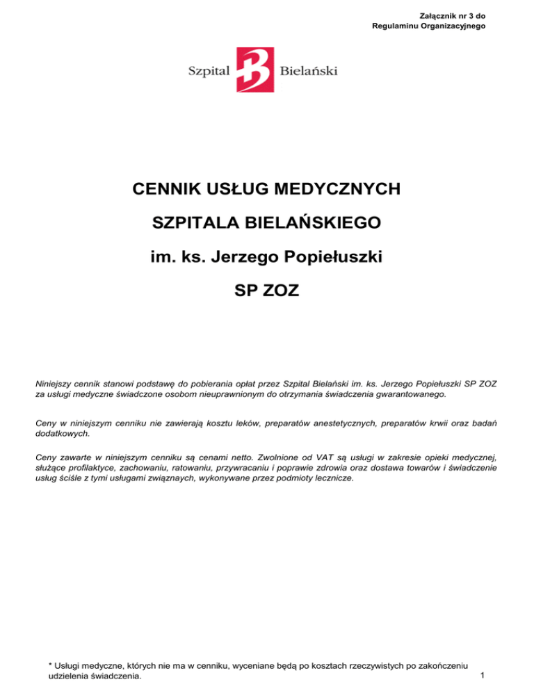 Załącznik nr 3 do Regulaminu Organizacyjnego CENNIK USŁUG MEDYCZNYCH SZPITALA BIELAŃSKIEGO im. ks. Jerzego Popiełuszki SP ZOZ Niniejszy cennik stanowi podstawę do pobierania opłat przez Szpital Bielański im. ks. Jerzego Popiełuszki SP ZOZ za usługi medyczne świadczone osobom nieuprawnionym do otrzymania świadczenia gwarantowanego. Ceny w niniejszym cenniku nie zawierają kosztu leków, preparatów anestetycznych, preparatów krwii oraz badań dodatkowych. Ceny zawarte w niniejszym cenniku są cenami netto. Zwolnione od VAT są usługi w zakresie opieki medycznej, służące profilaktyce, zachowaniu, ratowaniu, przywracaniu i poprawie zdrowia oraz dostawa towarów i świadczenie usług ściśle z tymi usługami związnaych, wykonywane przez podmioty lecznicze. * Usługi medyczne, których nie ma w cenniku, wyceniane będą po kosztach rzeczywistych po zakończeniu udzielenia świadczenia. 1 Załącznik nr 3 do Regulaminu Organizacyjnego L.p. Rodzaj usługi Cena Oddział Chorób Wewnętrznych I 1 Koszt osobodnia 300,00 zł Pododdział Diagnostyki Endokrynologicznej 1 Koszt osobodnia 250,00 zł Poradnia Endokrynologiczna 1 2 3 4 5 6 Porada lekarza w trakcie specjalizacji Porada lekarza specjalisty Densytometria USG tarczycy Biopsja cienkoigłowa tarczycy Przezskórne wstrzyknięcia etanolu 100,00 zł 150,00 zł 100,00 zł 100,00 zł 150,00 zł 100,00 zł Zakład Izotopów i Tyreologii 1 2 Scyntygrafia tarczycy z opisem Wychwyt J131 przez tarczycę [T 24] 120,00 zł 95,00 zł Pracownia RIA w Poradni Endokrynologicznej 1 2 3 4 5 6 7 8 9 10 11 12 13 14 15 16 17 18 19 20 21 22 23 24 25 26 27 28 Gastryna Podjednostka alfa hormonów glikoproteidowych Prolaktyna Testosteron T3 (wolne) FT3 T4 (wolne) FT4 Androstendion SHBG - Białko wiążące hormony płciowe DHEA - S04 Estradiol E2 FSH LH TSH 17-OH progesteron Kortyzol Progesteron Badanie przeciwciał anty-TPO Badanie przeciwciał anty-TG Makroprolatyna ACTH GH- hormon wzrostu Insulina IGF I somatomedyna C Aldosteron Glukagon Polipeptyd trzustkowy (PP) Chromogranina A-CgA 17- OHCS (17-hydroksykortykoidy w moczu) 50,00 zł 70,00 zł 20,00 zł 20,00 zł 20,00 zł 20,00 zł 35,00 zł 40,00 zł 30,00 zł 25,00 zł 25,00 zł 25,00 zł 20,00 zł 30,00 zł 30,00 zł 25,00 zł 25,00 zł 20,00 zł 60,00 zł 45,00 zł 20,00 zł 20,00 zł 55,00 zł 40,00 zł 30,00 zł 40,00 zł 70,00 zł 65,00 zł * Usługi medyczne, których nie ma w cenniku, wyceniane będą po kosztach rzeczywistych po zakończeniu udzielenia świadczenia. 2 Załącznik nr 3 do Regulaminu Organizacyjnego L.p. 29 30 31 32 Rodzaj usługi 17-Ketosterydy Wolne 17- hydroksykortykoidy Wolny Kortyzol Witamina D Cena 65,00 zł 50,00 zł 50,00 zł 60,00 zł Oddział Kardiologicznyz Pododdziałem Intensywnego Nadzoru Kardiologicznego 1 Koszt osobodnia 680,00 zł Poradnia Kardiologiczna (Pracownia Nieinwazyjnej Diagnostyki Kardiologicznej) 1 2 3 4 5 6 7 Porada lekarza w trakcie specjalizacji Porada lekarza specjalisty EKG bez opisu EKG z opisem EKG wysiłkowe Holter Echokardiografia serca w prezentacji B z użyciem dopplera spektralnego. 100,00 zł 150,00 zł 40,00 zł 60,00 zł 80,00 zł 80,00 zł 40,00 zł II Oddział Chorób Wewnętrznych z Nefrologią 1 Koszt osobodnia 400,00 zł Poradnia Nefrologiczna 1 2 Porada lekarza w trakcie specjalizacji Porada lekarza specjalisty 100,00 zł 150,00 zł Oddział Pediatryczny 1 Koszt osobodnia 360,00 zł Poradnia Nefrologiczna dla Dzieci 1 2 Porada lekarza w trakcie specjalizacji Porada lekarza specjalisty 100,00 zł 150,00 zł Poradnia Hematologiczna dla Dzieci 1 2 Porada lekarza w trakcie specjalizacji Porada lekarza specjalisty 100,00 zł 150,00 zł Oddział Neurologiczny z Oddziałem Udarowym 1 Koszt osobodnia 380,00 zł * Usługi medyczne, których nie ma w cenniku, wyceniane będą po kosztach rzeczywistych po zakończeniu udzielenia świadczenia. 3 Załącznik nr 3 do Regulaminu Organizacyjnego L.p. Rodzaj usługi Cena Poradnia Neurologiczna 1 2 3 Porada lekarza w trakcie specjalizacji Porada lekarza specjalisty Badanie EEG 100,00 zł 150,00 zł 80,00 zł Pracownia Elektromiografii i Potencjałów Wywołanych 1 2 3 4 5 6 7 8 9 10 11 12 13 14 EMG - badanie ilościowe mięśnia EMG - ocena czynności spoczynkowej mięśnia EMG - próba tężyczkowa ENG - nerw ruchowy długi ENG - nerw ruchowy - krótkie odcinki ENG - nerw czuciowy 1 pkt Blink - reflex Elektrostymulacyjna próba męczliwości bez leku Somatosensoryczne potencjały wywołane kończyn górnych Somatosensoryczne potencjały wywołane kończyn dolnych Dermatomalne potencjały wywołane z korzeni L3, L4, L5, S1 Słuchowe potencjały wywołane Wzrokowe potencjały wywołane Badanie śródoperacyjne 65,00 zł 15,00 zł 60,00 zł 50,00 zł 20,00 zł 20,00 zł 40,00 zł 105,00 zł 120,00 zł 120,00 zł 120,00 zł 80,00 zł 100,00 zł 170,00 zł Oddział Neonatologiczny 1 Koszt osobodnia 360,00 zł Pododdział Patologii i Intensywnej Terapii Noworodka 1 Koszt osobodnia 1 270,00 zł Poradnia Neonatologiczna 1 2 Porada lekarza w trakcie specjalizacji Porada lekarza specjalisty 100,00 zł 150,00 zł Oddział Chirurgii Ogólnej 1 Koszt osobodnia 1 2 3 4 5 Porada lekarza w trakcie specjalizacji Porada lekarza specjalisty Rektoskopia Zabieg z zakresu małej chirurgii Założenie/zmiana opatrunku chirurgicznego 480,00 zł Poradnia Chirurgii Ogólnej 100,00 zł 150,00 zł 60,00 zł 120,00 zł 40,00 zł * Usługi medyczne, których nie ma w cenniku, wyceniane będą po kosztach rzeczywistych po zakończeniu udzielenia świadczenia. 4 Załącznik nr 3 do Regulaminu Organizacyjnego L.p. Rodzaj usługi Cena Poradnia Proktologiczna 1 2 3 4 5 6 Porada lekarza w trakcie specjalizacji Porada lekarza specjalisty Wziernikowanie odbytnicy/esicy z biopsją [zamknięta] Anoskopia Rektoskopia Usuwanie żylaków odbytu metodą Barrona 100,00 zł 150,00 zł 60,00 zł 40,00 zł 100,00 zł 150,00 zł Poradnia Chirurgii Przewodu Pokarmowego (Stomijna) 1 2 3 4 5 6 7 8 9 10 Porada lekarza w trakcie specjalizacji