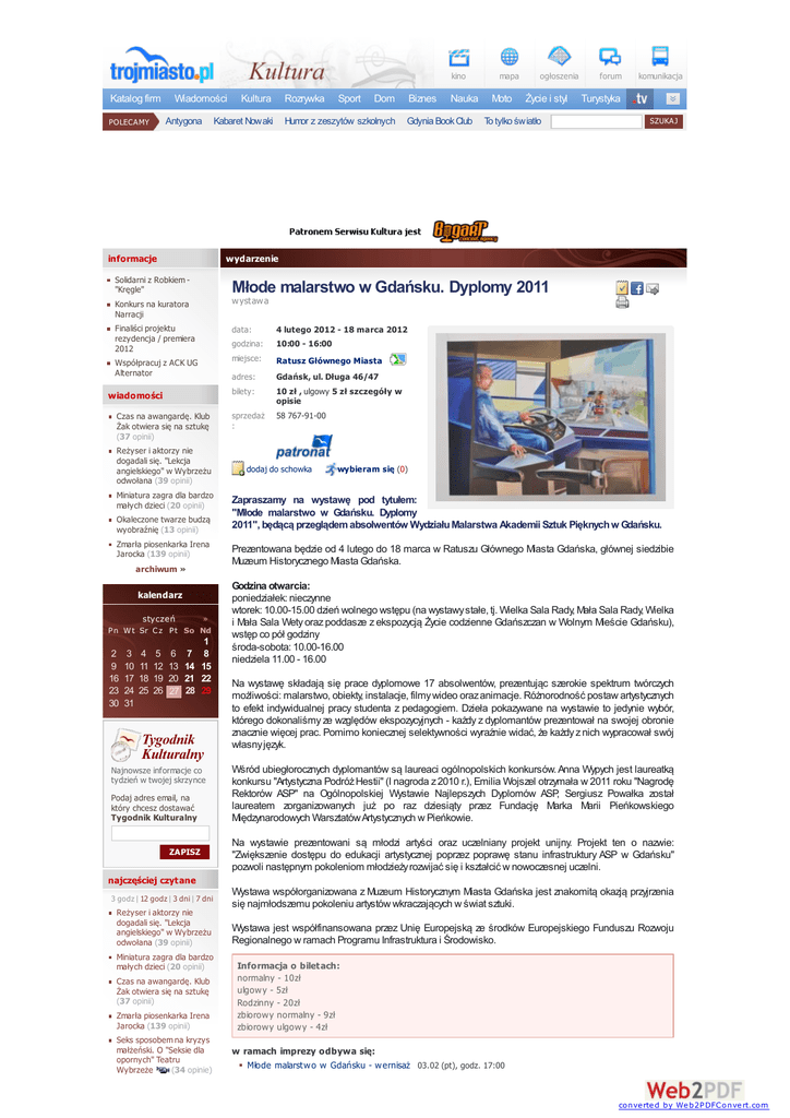 kino Katalog firm Wiadomości Antygona POLECAMY Humor z zeszytów szkolnych Biznes Nauka Gdynia Book Club Moto Życie i styl To tylko światło komunikacja Turystyka SZUKAJ w ystaw a Czas na awangardę. Klub Żak otwiera się na sztukę (37 opinii) Reżyser i aktorzy nie dogadali się. "Lekcja angielskiego" w Wybrzeżu odwołana (39 opinii) Miniatura zagra dla bardzo małych dzieci (20 opinii) Okaleczone twarze budzą wyobraźnię (13 opinii) Zmarła piosenkarka Irena Jarocka (139 opinii) archiwum » kalendarz styczeń » Pn W t Sr Cz Pt So Nd 5 12 19 26 Dom forum Młode malarstwo w Gdańsku. Dyplomy 2011 wiadomości 4 11 18 25 Sport ogłoszenia wydarzenie Solidarni z Robkiem "Kręgle" Konkurs na kuratora Narracji Finaliści projektu rezydencja / premiera 2012 Współpracuj z ACK UG Alternator 3 10 17 24 31 Rozrywka Kabaret Nowaki informacje 2 9 16 23 30 Kultura mapa 6 13 20 27 7 14 21 28 1 8 15 22 29 Tygodnik Kulturalny Najnowsze informacje co tydzień w twojej skrzynce Podaj adres email, na który chcesz dostawać Tygodnik Kulturalny ZAPISZ data: godzina: miejsce: 4 lutego 2012 - 18 marca 2012 10:00 - 16:00 adres: bilety: Gdańsk, ul. Długa 46/47 10 zł , ulgowy 5 zł szczegóły w opisie 58 767-91-00 sprzedaż : Ratusz Głównego Miasta dodaj do schowka wybieram się (0) Zapraszamy na wystawę pod tytułem: "Młode malarstwo w Gdańsku. Dyplomy 2011", będącą przeglądem absolwentów Wydziału Malarstwa Akademii Sztuk Pięknych w Gdańsku. Prezentowana będzie od 4 lutego do 18 marca w Ratuszu Głównego Miasta Gdańska, głównej siedzibie Muzeum Historycznego Miasta Gdańska. Godzina otwarcia: poniedziałek: nieczynne wtorek: 10.00-15.00 dzień wolnego wstępu (na wystawy stałe, tj. Wielka Sala Rady, Mała Sala Rady, Wielka i Mała Sala Wety oraz poddasze z ekspozycją Życie codzienne Gdańszczan w Wolnym Mieście Gdańsku), wstęp co pół godziny środa-sobota: 10.00-16.00 niedziela 11.00 - 16.00 Na wystawę składają się prace dyplomowe 17 absolwentów, prezentując szerokie spektrum twórczych możliwości: malarstwo, obiekty, instalacje, filmy wideo oraz animacje. Różnorodność postaw artystycznych to efekt indywidualnej pracy studenta z pedagogiem. Dzieła pokazywane na wystawie to jedynie wybór, którego dokonaliśmy ze względów ekspozycyjnych - każdy z dyplomantów prezentował na swojej obronie znacznie więcej prac. Pomimo koniecznej selektywności wyraźnie widać, że każdy z nich wypracował swój własny język. Wśród ubiegłorocznych dyplomantów są laureaci ogólnopolskich konkursów. Anna Wypych jest laureatką konkursu "Artystyczna Podróż Hestii" (I nagroda z 2010 r.), Emilia Wojszel otrzymała w 2011 roku "Nagrodę Rektorów ASP" na Ogólnopolskiej Wystawie Najlepszych Dyplomów ASP, Sergiusz Powałka został laureatem zorganizowanych już po raz dziesiąty przez Fundację Marka Marii Pieńkowskiego Międzynarodowych Warsztatów Artystycznych w Pieńkowie. Na wystawie prezentowani są młodzi artyści oraz uczelniany projekt unijny. Projekt ten o nazwie: "Zwiększenie dostępu do edukacji artystycznej poprzez poprawę stanu infrastruktury ASP w Gdańsku" pozwoli następnym pokoleniom młodzieży rozwijać się i kształcić w nowoczesnej uczelni. najczęściej czytane 3 godz | 12 godz | 3 dni | 7 dni Reżyser i aktorzy nie dogadali się. "Lekcja angielskiego" w Wybrzeżu odwołana (39 opinii) Miniatura zagra dla bardzo małych dzieci (20 opinii) Czas na awangardę. Klub Żak otwiera się na sztukę (37 opinii) Zmarła piosenkarka Irena Jarocka (139 opinii) Seks sposobem na kryzys małżeński. O "Seksie dla opornych" Teatru Wybrzeże (34 opinie) Wystawa współorganizowana z Muzeum Historycznym Miasta Gdańska jest znakomitą okazją przyjrzenia się najmłodszemu pokoleniu artystów wkraczających w świat sztuki. Wystawa jest współfinansowana przez Unię Europejską ze środków Europejskiego Funduszu Rozwoju Regionalnego w ramach Programu Infrastruktura i Środowisko. Informacja o biletach: normalny - 10zł ulgow y - 5zł Rodzinny - 20zł zbiorow y normalny - 9zł zbiorow y ulgow y - 4zł w ramach imprezy odbywa się: Młode malarstw o w Gdańsku - w ernisaż 03.02 (pt), godz. 17:00 converted by Web2PDFConvert.com scena trójmiejska DODAJ ZDJĘCIE DO IMPREZY DODAJ SWOJĄ OPINIĘ Gdańsk: Opera Bałtycka Teatr Wybrzeże Teatr Miniatura Filharmonia Bałtycka Malarnia - Teatr Wybrzeże Scena Teatralna ŻAK Teatr w Oknie Teatr w Blokowisku Czarna Sala - Teatr Wybrzeże Scena Alternatora Gdynia: Teatr Muzyczny Teatr Miejski Scena Letnia w Orłowie Scena Studencka Sopot: Scena Kameralna Teatr Atelier Off de BICZ Sala Koncertowa PFK przewodnik kulturalny Muzea Galerie Domy kultury Teatry tańca Chóry Agencje artystyczne Biblioteki O portalu Logo Reklama Polityka prywatności Kontakt Praca w portalu Mapa serwisu Trojmiasto.pl na komórkę Logowanie © Copyright 1998-2012 Gdańsk, Gdynia, Sopot - Portal Regionalny trojmiasto.pl converted by Web2PDFConvert.com