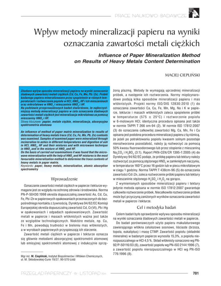 PRACE NAUKOWO - BADAWCZE Wpływ metody mineralizacji papieru na wyniki oznaczania zawartości metali ciężkich Influence of Paper Mineralization Method on Results of Heavy Metals Content Determination Maciej Ciepliński Zbadano wpływ sposobu mineralizacji papieru na wyniki oznaczania śladowych zawartości metali ciężkich (Cd, Cu, Fe, Mn, Pb i Zn). Próbki badanego papieru mineralizowano przez spopielenie w różnych temperaturach i roztworzenie popiołu w HCl, HNO3, HF i ich mieszaninach oraz mikrofalowo w HNO3 i mieszaninie HNO3 i HF. Na podstawie przeprowadzonych badań stwierdzono, że najkorzystniejszą metodą mineralizacji papieru w celu oznaczania śladowych zawartości metali ciężkich jest mineralizacja mikrofalowa za pomocą mieszaniny HNO3 i HF. Słowa kluczowe: papier, metale ciężkie, mineralizacja, absorpcyjna spektrometria atomowa An influence of method of paper matrix mineralization to results of determination of heavy metals trace (Cd, Cu, Fe, Mn, Pb, Zn) contents was examined. Samples of examined paper were mineralized through incineration to ashes in different temperatures and digestion of ash in HCl, HNO3, HF and their mixtures and with microwave technique in HNO3 and in the mixture of HNO3 and HF. On the basis of carried out examinations it was found that the microwave mineralization with the help of HNO3 and HF mixtures is the most favourable mineralization method to determine the trace contents of heavy metals in paper matrix. Keywords: paper, heavy metals, mineralization, atomic absorption spectrometry Wprowadzenie Oznaczanie zawartości metali ciężkich w papierze i tekturze wymagane jest ze względu na ochronę zdrowia i środowiska. Norma PN-P-50430:1998 określa dopuszczalną zawartość As, Cd, Cu, Fe, Pb i Zn w papierowych opakowaniach przeznaczonych do bezpośredniego kontaktu z żywnością. Dyrektywa 94/62/EC Komisji Europejskiej określa dopuszczalną zawartość Cd, Cr(VI), Pb i Hg w opakowaniach i odpadach opakowaniowych. Zawartość metali w papierze i masach włóknistych ważna jest także ze względów technologicznych. Niek tóre metale, np. Cu, Fe i Mn, powodują trudności w bieleniu mas włóknistych, a w wyrobach papierowych przyspieszają ich starzenie. Zawartość metali ciężkich w papierze i tekturze oznacza się głównie metodami absorpcyjnej spektrometrii atomowej lub emisyjnej spektrometrii atomowej z indukcyjnie sprzę- Mgr inż. M. Ciepliński, Instytut Biopolimerów i Włókien Chemicznych, ul. M. Skłodowskiej-Curie 19/27, 90-570 Łódź PRZEGLĄD PAPIERNICZY · 67 · LISTOPAD 2011 żoną plazmą. Metody te wymagają uprzedniej mineralizacji próbek, a następnie ich roztworzenia. Normy międzynarodowe podają kilka sposobów mineralizacji papieru i mas włóknistych. Projek t normy ISO/DIS 12830:2010 (1) do oznaczania zawartości Ca, Cu, Fe, Mn, Mg, Na i K w papierze, tekturze i masach włóknistych zaleca spopielenie próbki w temperatur ze (575 ± 25°C) i roz t wor zenie popiołu w 6-molowym HCl; identyczna procedura opisana jest także w normie TAPPI T 266 om-94 (2). W normie ISO 17812:2007 (3) do oznaczania całkowitej zawartości Mg, Ca, Mn, Fe i Cu opisana jest podobna procedura mineralizacji papieru z tą różnicą, że jeżeli po potraktowaniu popiołu kwasem solnym pozostaje nieroztworzona pozostałość, należy ją roztworzyć za pomocą 50% kwasu fluorowodorowego lub przez stopienie z mieszaniną Na2CO3 i H3BO3 (3:1). Raport PKN-CEN/CR 1395-1:2005 (4) do Dyrektywy 94/62/EC podaje, że próbkę papieru lub tektury należy roztworzyć za pomocą stężonego HNO3 w zamkniętym naczyniu, w temperaturze 160°C przez 16 godzin lub w piecu mikrofalowym w ciagu 1 godziny. Norma TAPPI T 438cm-96 (5) do oznaczania zawartości Cd i Zn, zaleca roztworzenie próbki papieru lub tektury w mieszaninie stężonego H2SO4 i H2O2 na gorąco. Z wymienionych sposobów mineralizacji papieru i tektury jedynie metoda opisana w normie ISO 17812:2007 gwarantuje całkowite roztworzenie próbek. Niecałkowite roztworzenie próbek może być przyczyną zaniżonych wyników oznaczania zawartości metali w papierze i tekturze. Cel i metodyka badań Celem badań było sprawdzenie wpływu sposobu mineralizacji na wyniki oznaczania śladowych zawartości metali w papierze. Do badań porównawczych użyto papieru makulaturowego zawierającego włókna celulozowe sosnowe, liściaste (brzoza, topola, eukaliptus) i masę CTMP. Zawartość popiołu (składniki mineralne) w badanym papierze wynosiła 15,3%, a popiołu nierozpuszczalnego w HCl 4,5 %. Skład włóknisty oznaczono wg PN92/P-50116/03 (6), zawartość popiołu wg PN-ISO 2144:1996 (7), a zawartość popiołu nierozpuszczalnego w HCl wg PN-ISO 776:1996 (8). 701 PRACE NAUKOWO - BADAWCZE Pr zed pr z ystąpieniem do badań, 500 g papieru rozdrobniono ręcznie na kawałki o wymiarach ok. 0,5 x 0,5 cm i dokładnie wymieszano. W chwili pobierania próbek do badań oznaczano suchość papieru i uwzględniano ją w obliczeniach zawartości metali. Mineralizacja próbek papieru Po roztworzeniu próbki przenoszono mineralizat do kolbki miarowej o pojemności 50 ml. Jeżeli po roztwarzaniu pozostawał osad, mineralizat sączono przez średni sączek ilościowy. Dla każdego rodzaju mineralizacji przygotowywano ślepą próbę. Mineralizację mikrofalową przeprowadzano w piecu mikrofalowym MDS 2000 firmy CEM. Mineralizacja przez spopielenie Do tygla platynowego lub kwarcowego (w zależności od kwasu użytego do roztwarzania popiołu) odważano 2,500 g papieru, a następnie spopielano w piecu muflowym. Spopielanie badanych próbek prowadzono w trzech różnych temperaturach i czasach wystarczających do całkowitego spopielenia papieru. W tabeli 1 podano temperatury i odpowiadające im czasy spopielania. Oznaczanie zawartości metali W zmineralizowanych próbkach papieru oznaczono zawartość Fe, Cu, Mn, Zn, Pb i Cd. Zawartość Fe, Cu, Mn, Zn we wszystkich mineralizatach oraz zawartość Pb i Cd po