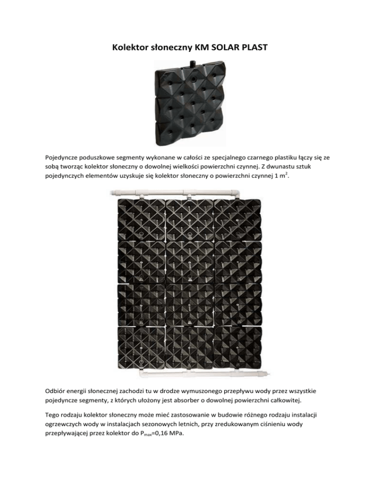 Kolektor słoneczny KM SOLAR PLAST Pojedyncze poduszkowe segmenty wykonane w całości ze specjalnego czarnego plastiku łączy się ze sobą tworząc kolektor słoneczny o dowolnej wielkości powierzchni czynnej. Z dwunastu sztuk pojedynczych elementów uzyskuje się kolektor słoneczny o powierzchni czynnej 1 m2. Odbiór energii słonecznej zachodzi tu w drodze wymuszonego przepływu wody przez wszystkie pojedyncze segmenty, z których ułożony jest absorber o dowolnej powierzchni całkowitej. Tego rodzaju kolektor słoneczny może mieć zastosowanie w budowie różnego rodzaju instalacji ogrzewczych wody w instalacjach sezonowych letnich, przy zredukowanym ciśnieniu wody przepływającej przez kolektor do Pmax=0,16 MPa. Kolektor KM SOLAR PLAST szczególnie nadaje się do budowy instalacji grzewczych wody w otwartych basenach kąpielowych. Stosunkowo niski koszt budowy instalacji, łatwość montażu pojedynczych segmentów w kolektor słoneczny dowolnych wielkości a także mało skomplikowany układ orurowania stanowią ewidentną zachętę do stosowania tego rodzaju kolektora słonecznego do instalacji grzewczych wody. Poniżej prezentujemy dwa przykładowe rozwiązania instalacji solarnych (z filtrem i bez filtra basenowego). Segment absorbera. króciec odpływowy punkty zgrzewania tworzywa króciec dopływowy Segment absorbera jest płaskim naczyniem ciśnieniowym wykonanym z czarnego polietylenu typu HDPE odpornego na promieniowanie UV. Segmenty można łączyć ze sobą za pomocą specjalnych łączników i uszczelek tworząc absorbery kolektorów słonecznych o dowolnej wielkości sumarycznej. Dane techniczne absorbera KM SOLAR PLAST Tworzywo Odporność termiczna Wymiary segmentu Grubość ścianki Pojemność wodna 1 segmentu Pojemność wodna 1 m2 absorbera (12 segmentów) Ciśnienie robocze Ciężar 1 segmentu Ciężar 1 m2 absorbera Zalecana wielkość przepływu wody przez absorber Współczynnik absorpcji Współczynnik emisji Temperatura wody na odpływie absorbera Wydajność cieplna przy prom. 1000 W na 1h Trwałość eksploatacyjna HDPE polietylen odporny na promieniowanie UV -30 do 126oC 295*295*30 mm 2,5 mm 1,8 l 21,6 l/m2 0,16 MPa 0,7 kg 8,4 kg 50 – 120 l/m2*h 0,93 0,97 60oC max 880 Wh/m2 10 lat Sposób łączenia segmentów absorbera. Połączenia między segmentowe w płaszczyźnie nachylenia absorbera: Połączenia pomiędzy rzędami segmentów: Wykaz elementów do łączenia segmentów: Poz. rys. Kształt i nazwa 1 Materiał Uszczelka kołnierzowa Specjalne tworzywo sztuczne miękkie 2 Nypel CPVC 3 Kolano 1” \ ½” PVC 4 Łącznik rurowy 1” PVC 5 Trójnik 1” \ ½” PVC Mocowanie absorbera do konstrukcji nośnej. Sposób mocowania: 1. W każdym segmencie wiercić po cztery otwory ø3 mm w wybranych punktach zgrzewów tworzywa. 2. Segmenty przykręcać wkrętami do drewna ø3 mm do drewnianej konstrukcji nośnej absorbera. Kierunek i kąt nachylenia baterii kolektorowej: Baterie kolektorowe budowane z segmentów KM SOLAR PLAST należy sytuować na kierunku południowym z dopuszczalnym odchyleniem od azymutu +/-30o. Optymalny kąt nachylenia absorbera do poziomu wynosi 45o. Sprawność energetyczna kolektora KM SOLAR PLAST. Na rysunku poniżej przedstawiono charakterystyki sprawności energetycznej kolektora KM SOLAR PLAST, płaskiego kolektora słonecznego cieczowego KS-2000TP i kolektora próżniowego KSR10. Legenda: = T*m – zredukowana temperatura kolektora tm – temperatura wody płynącej przez kolektor ta – temperatura otoczenia G – natężenie promieniowania słonecznego (800 W/m2) Interpretacja charakterystyki kolektorów jest następująca. Kolektor KM SOLAR PLAST z racji braku szyby osłonowej ma wyższą sprawność pochłaniania promieniowania słonecznego w warunkach, gdy temperatura wody przepływającej przez kolektor jest taka sama jak temperatura powietrza otaczającego kolektor. Gwałtowne opadanie krzywej sprawności kolektora KM SOLAR PLAST spowodowane jest tym, że absorber tego kolektora nie posiada osłony termoizolacyjnej. Kolektor KM SOLAR PLAST charakteryzuje się wysokimi uzyskami ciepła z promieniowania słonecznego w warunkach małej różnicy temperatur (tm – ta), co ma miejsce zwłaszcza w instalacjach basenowych latem. Dobór wielkości kolektora KM SOLAR PLAST. Właściwy dobór wielkości baterii kolektora KM SOLAR PLAST do instalacji basenowych polega na zastosowaniu odpowiedniej wielkości wskaźnika WB określającego stosunek wielkości baterii do powierzchni lustra wody w basenie. Skolektorów=Sbasenu*WB Skolektorów – pole powierzchni kolektorów Sbasenu – pole powierzchni basenu Wartości wskaźnika WB: WB=0,7 – dla basenów odkrytych bez możliwości przykrycia lustra wody folią pływającą; WB=0,5 – dla basenów odkrytych z możliwością przykrycia lustra wody folią pływającą; WB=0,7 – dla basenów krytych.