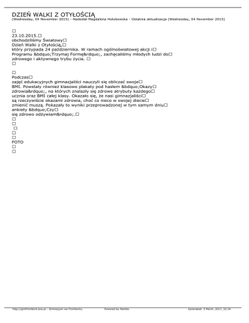 DZIEŃ WALKI Z OTYŁOŚCIĄ (Wednesday, 04 November 2015) - Nadesłał Magdalena Hołubowska - Ostatnia aktualizacja (Wednesday, 04 November 2015) 23.10.2015. obchodziliśmy Światowy Dzień Walki z Otyłością, który przypada 24 października. W ramach ogólnoświatowej akcji i Programu „Trzymaj Formę”, zachęcaliśmy młodych ludzi do zdrowego i aktywnego trybu życia. Podczas zajęć edukacyjnych gimnazjaliści nauczyli się obliczać swoje BMI. Powstały również klasowe plakaty pod hasłem „Okazy zdrowia”, na których znalazły się zdrowe atrybuty każdego ucznia oraz BMI całej klasy. Okazało się, że nasi gimnazjaliści są rzeczywiście okazami zdrowia, choć co nieco w swojej diecie zmienić muszą. Pokazały to wyniki przeprowadzonej w tym samym dniu ankiety „Czy się zdrowo odżywiam”. FOTO http://gimfrombork.boo.pl - Gimnazjum we Fromborku Powered by Mambo Generated: 3 March, 2017, 22:34