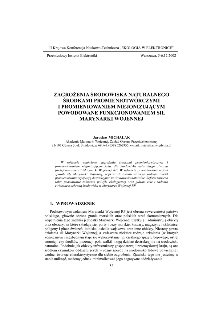 II Krajowa Konferencja Naukowo-Techniczna „EKOLOGIA W ELEKTRONICE” Przemysłowy Instytut Elektroniki Warszawa, 5-6.12.2002 ZAGROŻENIA ŚRODOWISKA NATURALNEGO ŚRODKAMI PROMIENIOTWÓRCZYMI I PROMIENIOWANIEM NIEJONIZUJĄCYM POWODOWANE FUNKCJONOWANIEM SIŁ MARYNARKI WOJENNEJ Jarosław MICHALAK Akademia Marynarki Wojennej, Zakład Obrony Przeciwchemicznej 81-103 Gdynia 3, ul. Śmidowicza 69, tel. (058) 6262955, e-mail: [email protected] W referacie omówiono zagrożenia środkami promieniotwórczymi i promieniowaniem niejonizującym jakie dla środowiska naturalnego stwarza funkcjonowanie sił Marynarki Wojennej RP. W referacie przedstawiono w jaki sposób siły Marynarki Wojennej, poprzez stosowanie różnego rodzaju źródeł promieniowania wpływają destrukcyjnie na środowisko naturalne. Referat zawiera także podstawowe założenia polityki ekologicznej oraz główne cele i zadania związane z ochroną środowiska w Marynarce Wojennej RP. 1. WPROWADZENIE Podstawowym zadaniem Marynarki Wojennej RP jest obrona suwerenności państwa polskiego, głównie obrona granic morskich oraz polskich stref ekonomicznych. Dla wypełnienia tego zadania jednostki Marynarki Wojennej użytkują i administrują obiekty oraz obszary, na które składają się: porty i bazy morskie, koszary, magazyny i składnice, poligony i place ćwiczeń, lotniska, osiedla wojskowe oraz inne obiekty. Niestety pewne działania sił Marynarki Wojennej, a zwłaszcza niektóre rodzaje szkolenia (w których koniecznym i niezbędnym staje się wykorzystanie np. ciężkiego sprzętu bojowego, ostrej amunicji czy środków pozoracji pola walki) mogą działać destrukcyjnie na środowisko naturalne. Podobnie jak obiekty infrastruktury gospodarczej i przemysłowej kraju, są one źródłem czynników oddziałujących w różny sposób na środowisko lądowe powietrzne i wodne, tworząc charakterystyczne dla siebie zagrożenia. Zjawiska tego nie jesteśmy w stanie uniknąć, możemy jednak minimalizować jego negatywne oddziaływanie. 52 Na dzień dzisiejszy najważniejszym wyzwaniem, stojącym przed większością armii, jest znalezienie prawnych i organizacyjnych rozwiązań, zapewniających właściwy poziom wyszkolenia żołnierzy i sprawność armii przy jak najmniejszych negatywnych dla środowiska skutkach. Wymagają tego coraz ostrzejsze normy i przepisy dotyczące ochrony środowiska a także opinia publiczna. Należy tutaj zaznaczyć, że ochrona środowiska w Marynarce Wojennej może przynieść wymierne korzyści takie jak: wzrost gotowości bojowej osiągany poprzez stosowanie nowszego i sprawniejszego technicznie sprzętu, zmniejszenie kosztów związanych z oczyszczaniem terenów użytkowanych przez wojsko, budowanie społecznego poparcia dla wojska poprzez pomoc w rozwiązywaniu problemów ekologicznych oraz wzrost świadomości ekologicznej społeczeństwa. Charakter działalności szkoleniowej i bytowej pozwala na wyodrębnienie spośród zanieczyszczeń takich, które są przez tę działalność najczęściej powodowane. Biorąc pod uwagę użytkowanie coraz większej liczby wyspecjalizowanego sprzętu technicznego, bojowego i transportowego czy też wykorzystywanie specyficznych obiektów wojskowych (poligony, place ćwiczeń) z dużym prawdopodobieństwem można wskazać na: 1. zanieczyszczenia ropopochodne; 2. substancje i związki chemiczne oraz środki promieniotwórcze; 3. odpady sanitarne i komunalne; 4. zanieczyszczenia niematerialne – hałas i promieniowanie niejonizujące. W referacie omówiono zagrożenia, jakie dla środowiska naturalnego stanowią środki promieniotwórcze i promieniowanie niejonizujące. 2. ZAGROŻENIA ŚRODOWISKA POWODOWANE ŚRODKAMI PROMIENIOTWÓRCZYMI Zagrożenia środkami promieniotwórczymi ze względu na ich charakter, podzielić można na: zewnętrzne i wewnętrzne. O zewnętrznych decyduje użytkowanie w krajach sąsiadujących z Polską – i nie tylko – obiektów energetyki jądrowej (doświadczyliśmy tego w roku 1956 i 1986), o wewnętrznych funkcjonowanie obiektów badawczych (reaktory w Świerku, ośrodek produkcji izotopów oraz różnego rodzaju placówki medyczne, terapeutyczne, naukowe i przemysłowe, gdzie użytkuje się prawie 3000 źródeł promieniowania jonizującego. W składnicy odpadów promieniotwórczych w Różanie zdeponowane jest około 9000 kg materiałów jądrowych (uran, pluton, tor) różnego pochodzenia, a w obiektach gospodarczych i przemysłowych kraju zarejestrowano około miliona izotopowych czujek dymu. Żaden z wymienionych obiektów nie stwarza realnego zagrożenia dla ludzi i środowiska ze względu na średnią aktywność, niewielką ilość materiału radioaktywnego i ścisłą lokalizację. W porównaniu z przedstawionymi danymi jednostki wojskowe (w tym jednostki Marynarki Wojennej RP) sklasyfikowane są na odległej pozycji w hierarchii zagrożeń. Dzieje się tak dlatego, że od kilkunastu już lat wojsko nie stosuje czujników izotopowych, a niewielka liczba zamkniętych źródeł promieniowania jonizującego, wykorzystywana do cechowania przyrządów dozymetrycznych poddawana jest ścisłemu ewidencjonowaniu i kontrolowaniu, w myśl przepisów państwowych oraz rygorystycznych rozporządzeń resortu obrony. Kolejnym elementem wpływającym na obniżenie emisji skażeń promieniotwórczych przez wojsko jest wprowadzenie do szkolenia elektronicznych imitatorów skażeń promieniotwórczych. W tym miejscu warto wskazać na 53 automatyczny imitator promieniowania WIP, współpracujący z rentgenoradiometrem DPS-68 i wykorzystywany w szkoleniu marynarzy w posługiwaniu się tego typu sprzętem dozymetrycznym. Te i inne, podobne urządzenia są ekologicznie bezpieczne w toku działań i nie wywierają negatywnego wpływu na środowisko. Potencjalnymi źródłami zagrożenia środkami promieniotwórczymi wykorzystywanymi w Marynarce Wojennej RP, mogą być stacjonarne laboratoria oraz składnice dysponujące zamkniętymi źr